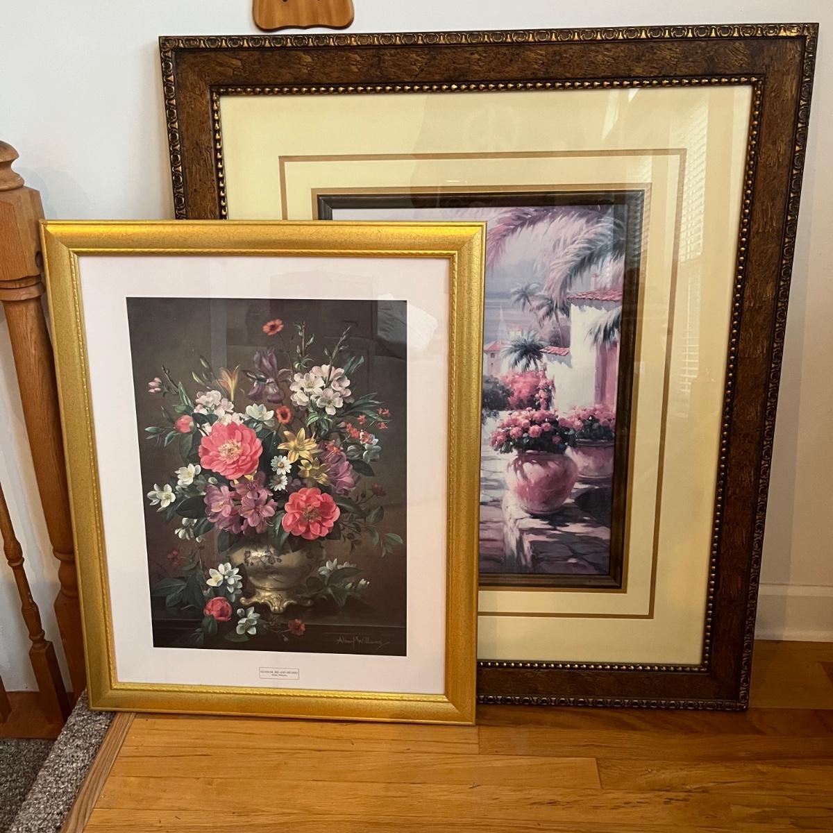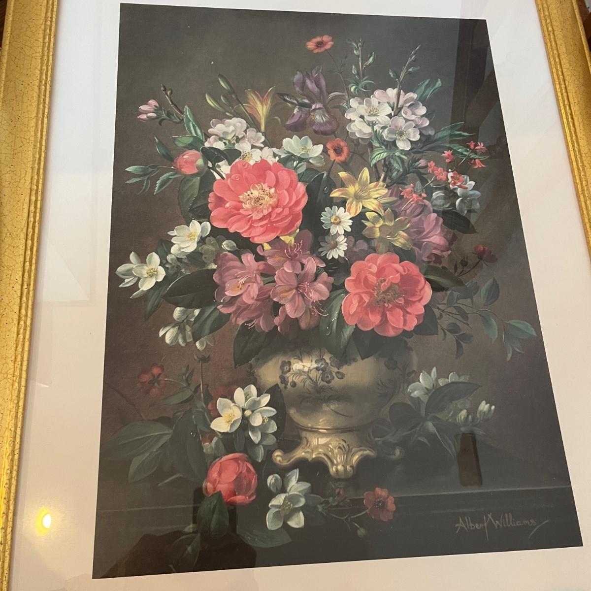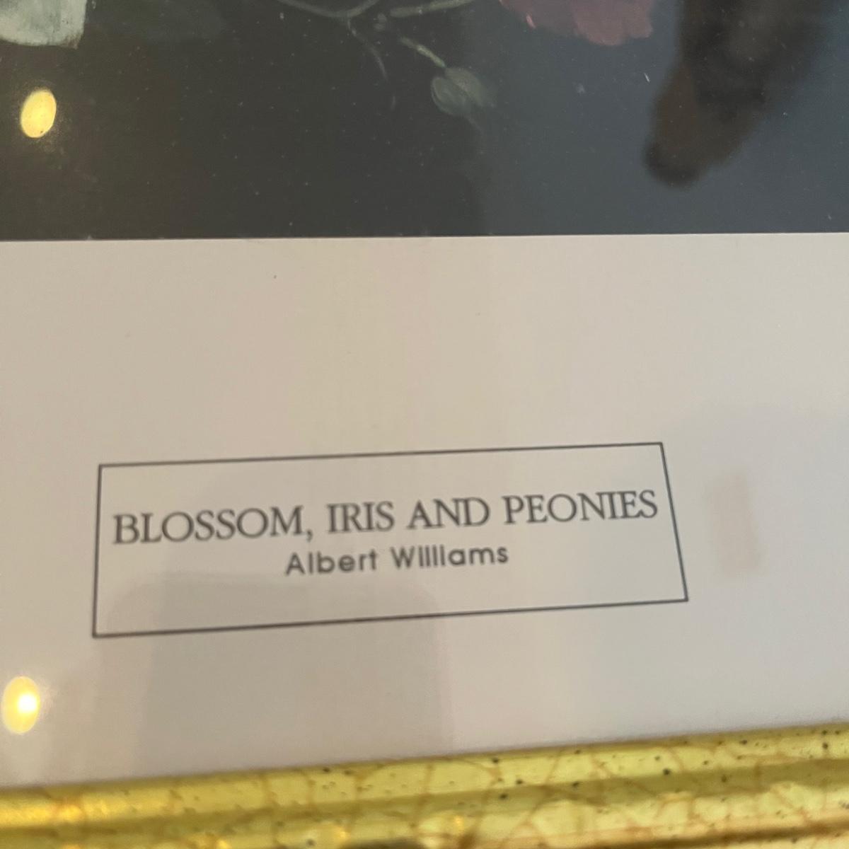 Lot includes a framed and matted print titled Blossom, Iris and Peonies by Albert Williams and a large framed and matted floral print. Both frames appear to be wood. Largest frame measures 35” x 41”.
