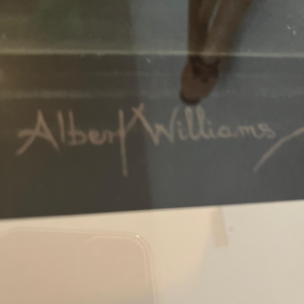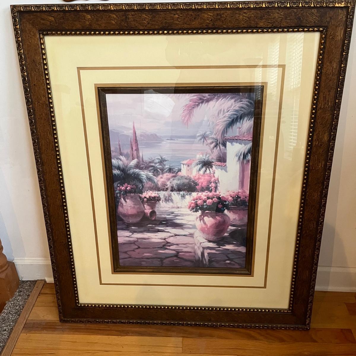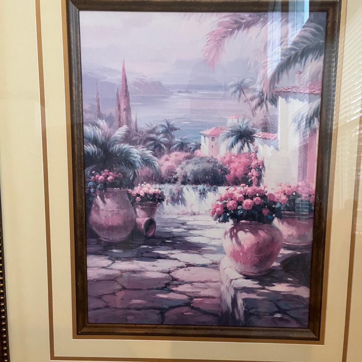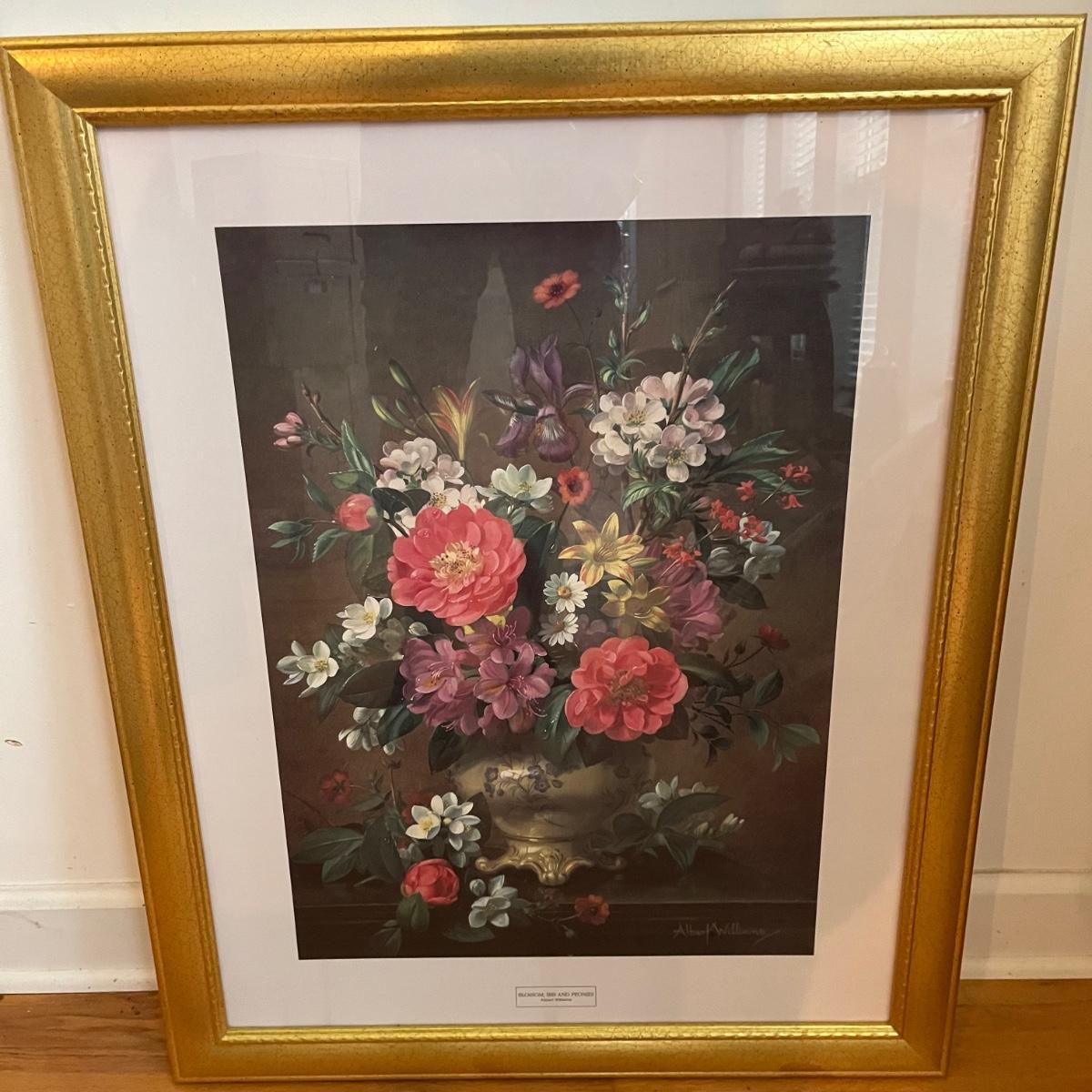 Lot includes a framed and matted print titled Blossom, Iris and Peonies by Albert Williams and a large framed and matted floral print. Both frames appear to be wood. Largest frame measures 35” x 41”.