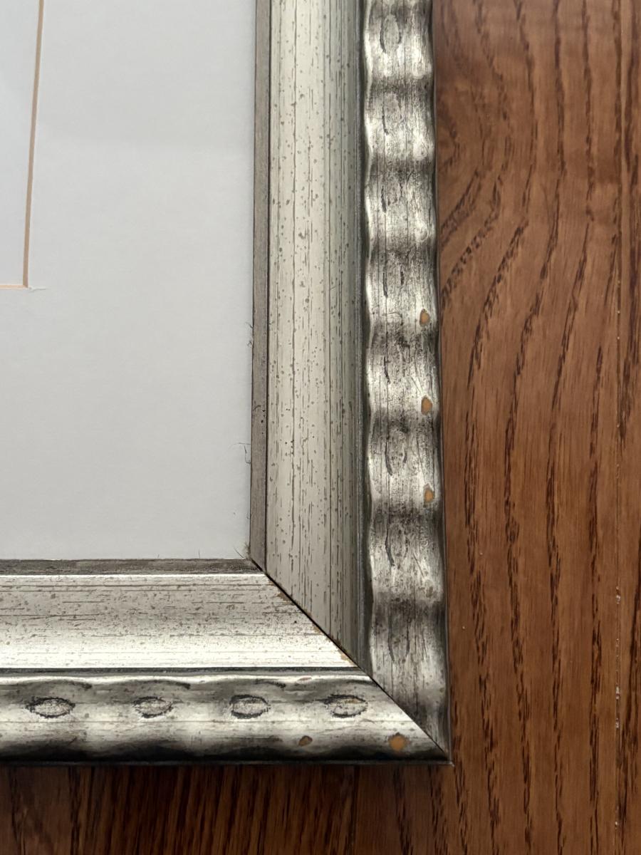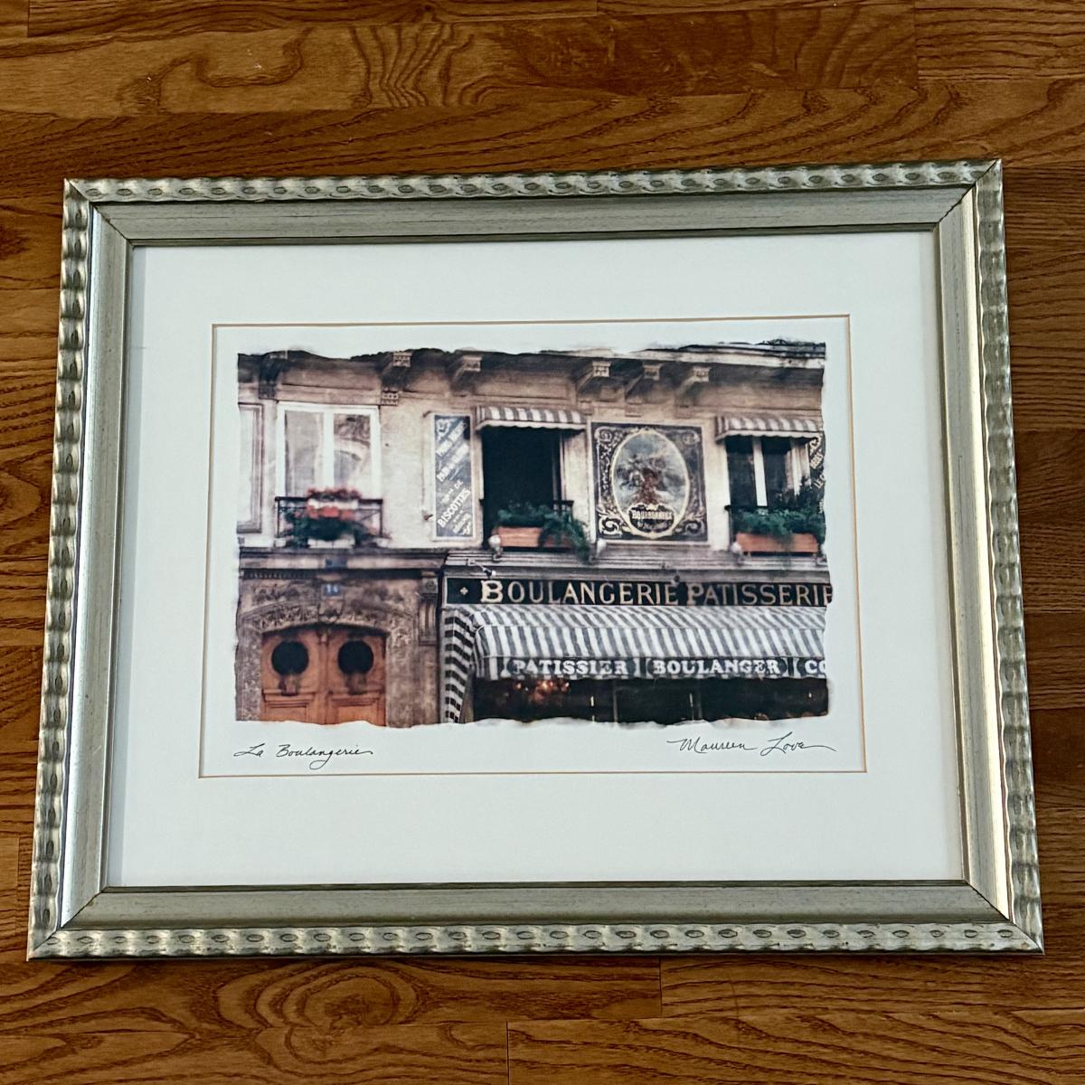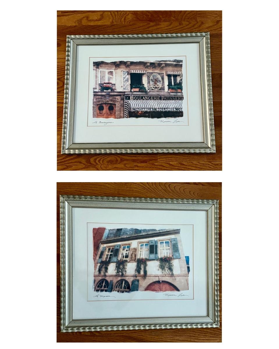 This lot consists of two Maureen Love Parisian style prints in frames of what appear to be wood with a silver leaf finish. The measurements are approximately 23" x 19"H. Both framed prints are ready to hang and are covered with glass. Several blemishes on frame. See pictures.