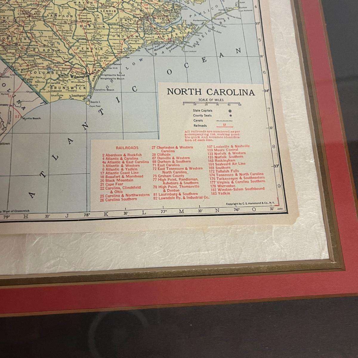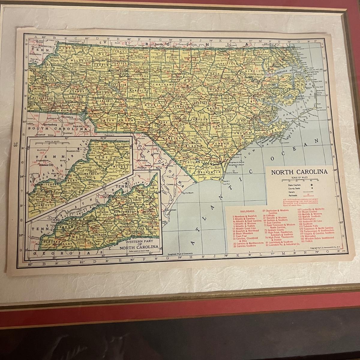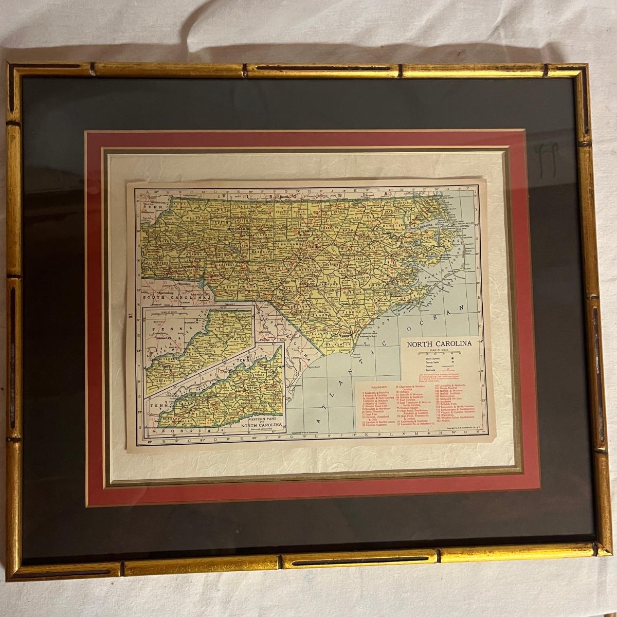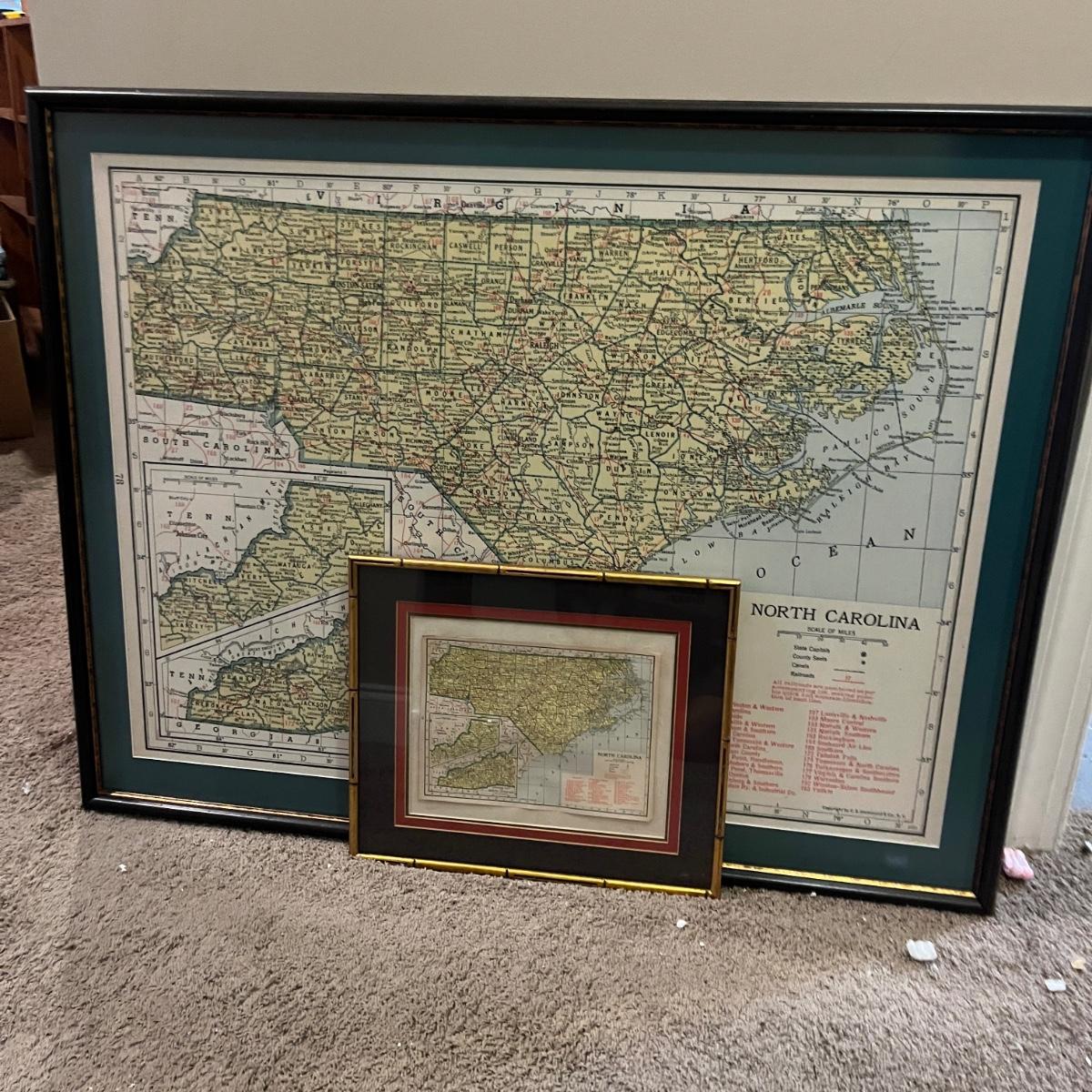 Lot includes two North Carolina maps in wooden frames under glass. Largest frame measures 46” x 35.5”H.