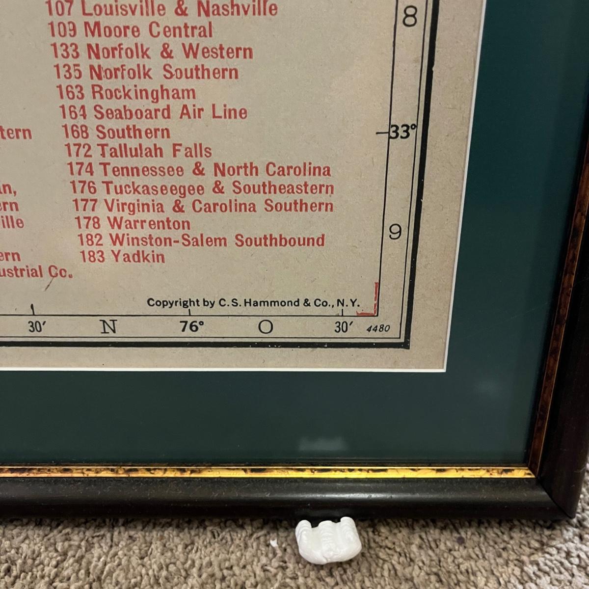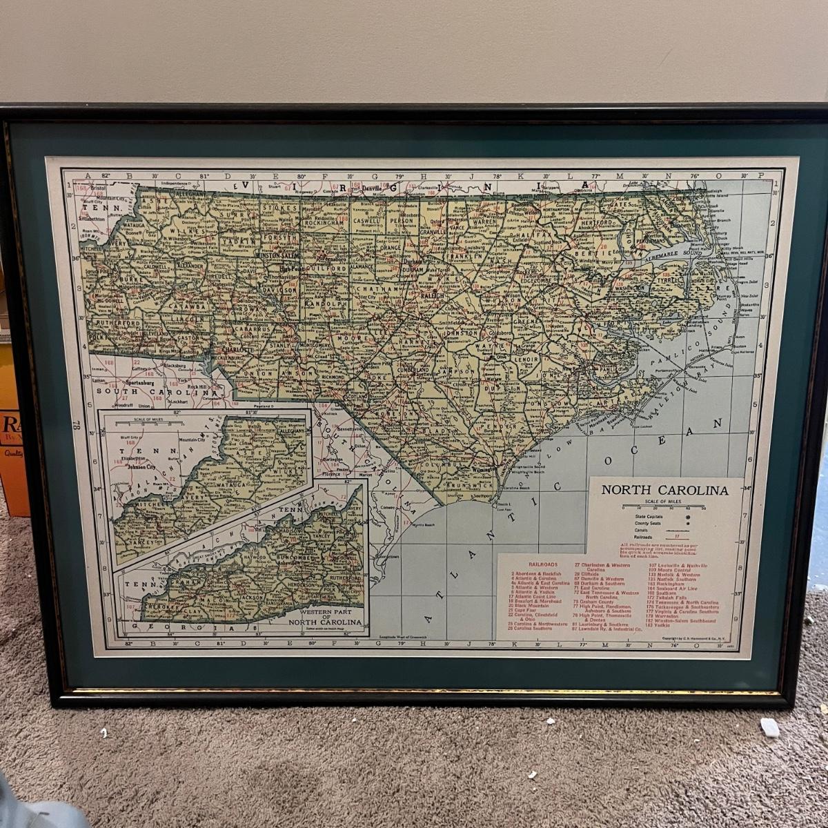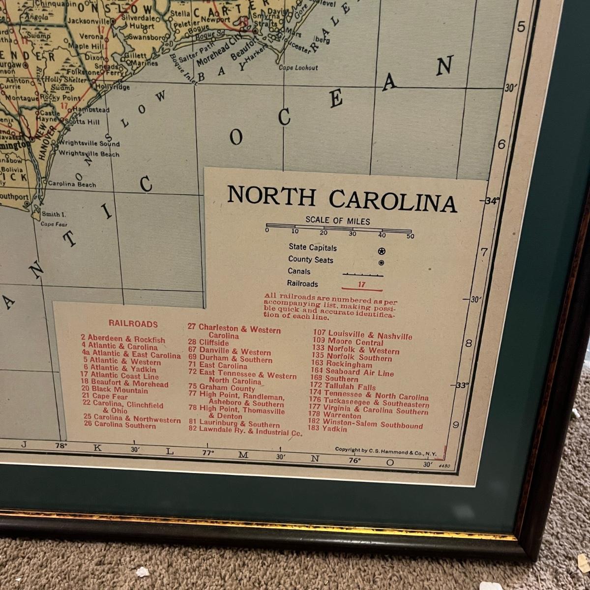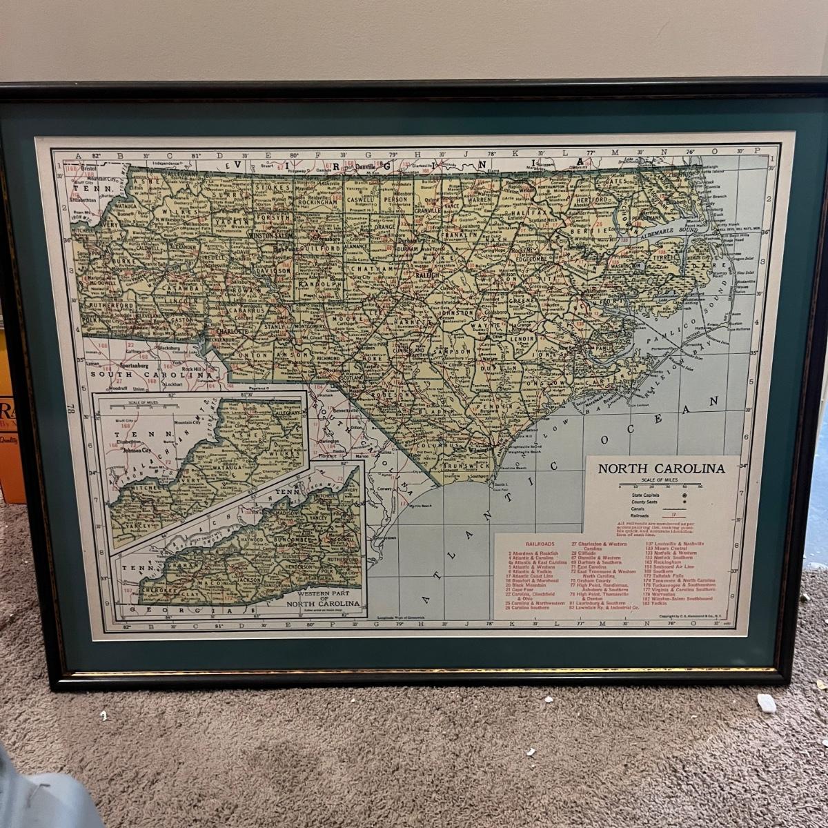 Lot includes two North Carolina maps in wooden frames under glass. Largest frame measures 46” x 35.5”H.