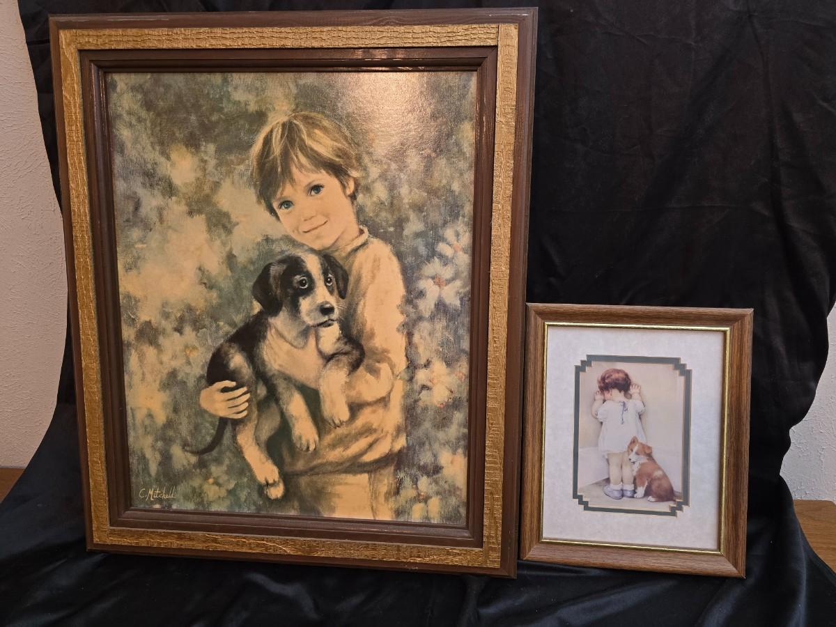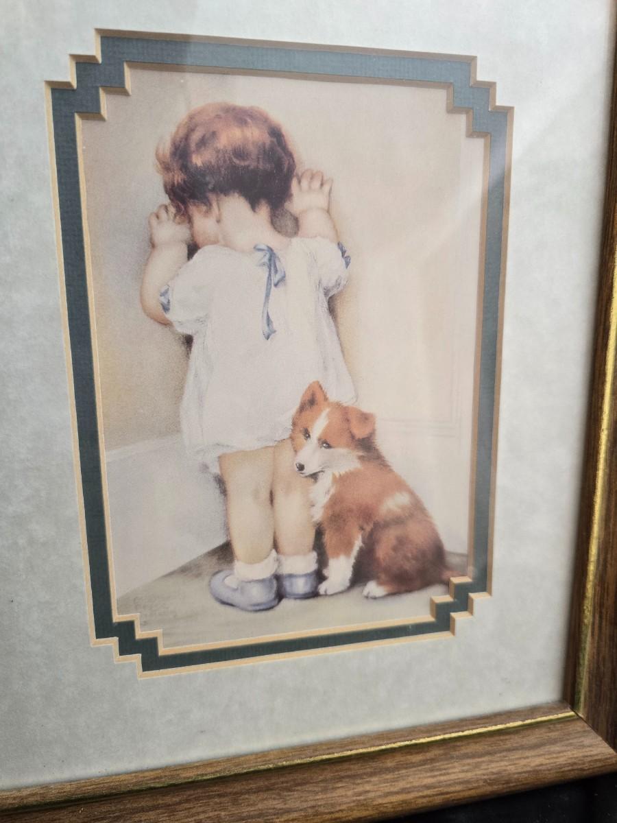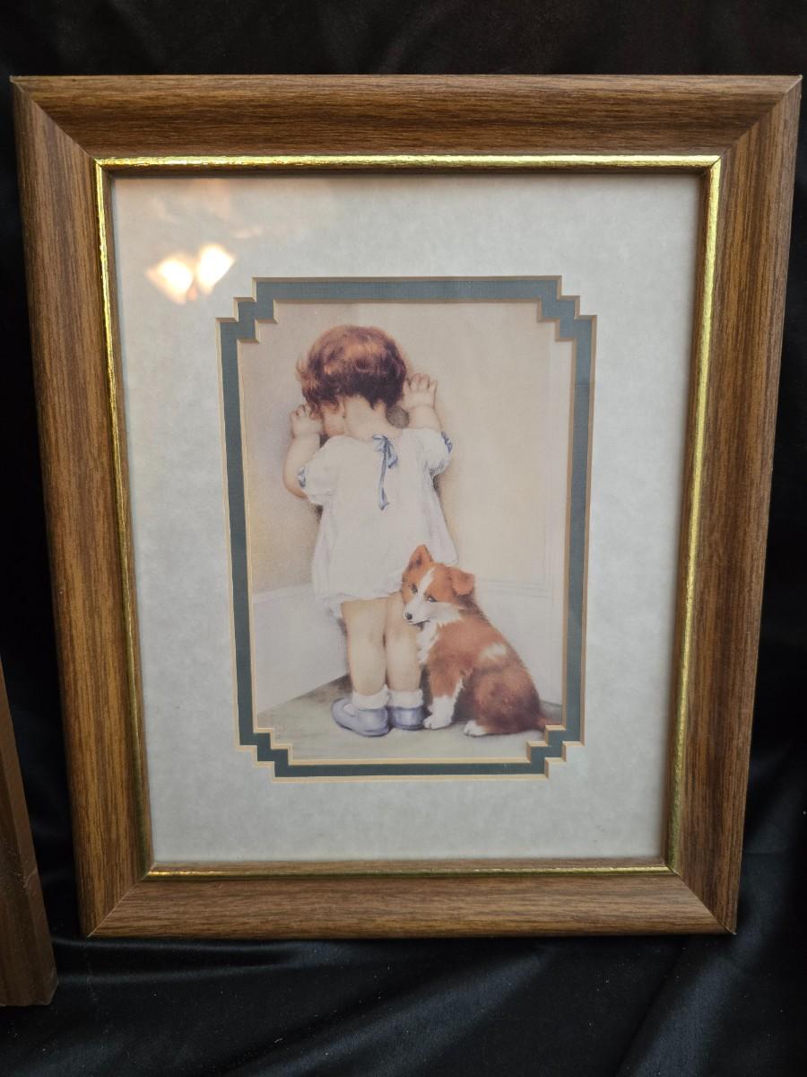 Two framed wall art pieces dog themed =vintage framed print titled "Comrades" by C. Mitchel & A little girl in time out with her corgi?