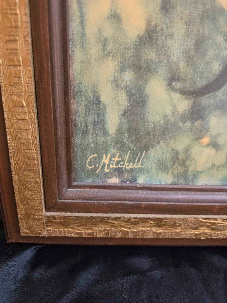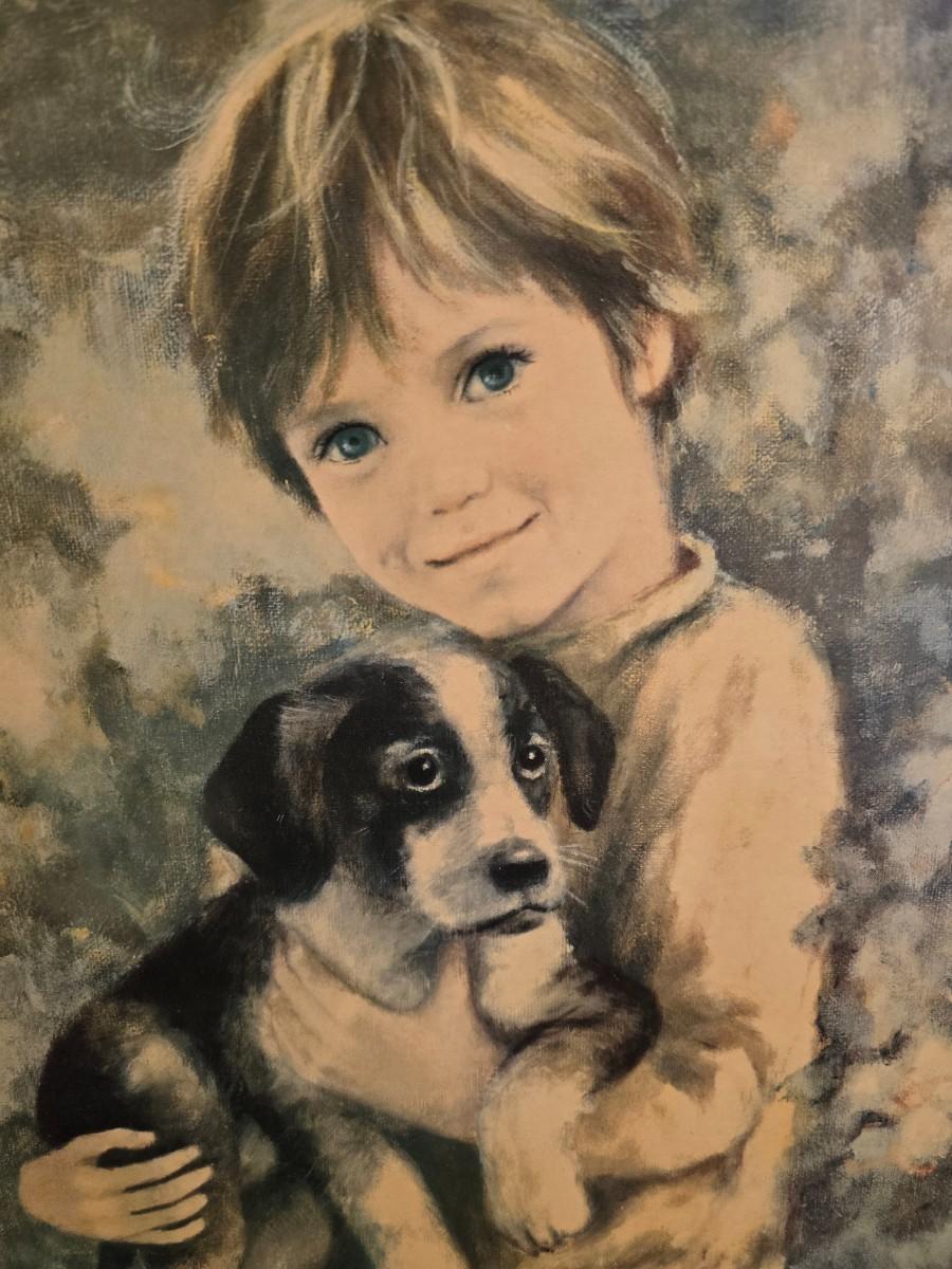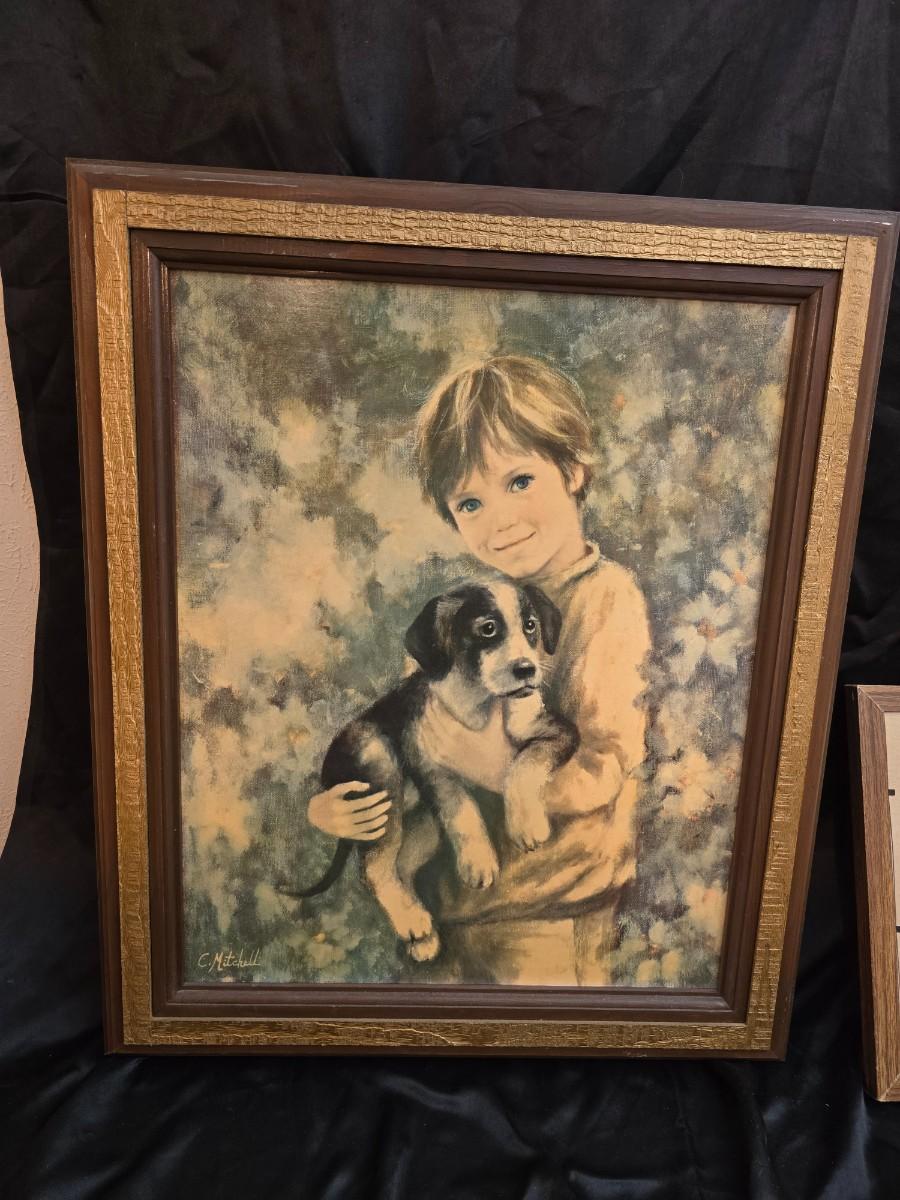 Two framed wall art pieces dog themed =vintage framed print titled "Comrades" by C. Mitchel & A little girl in time out with her corgi?