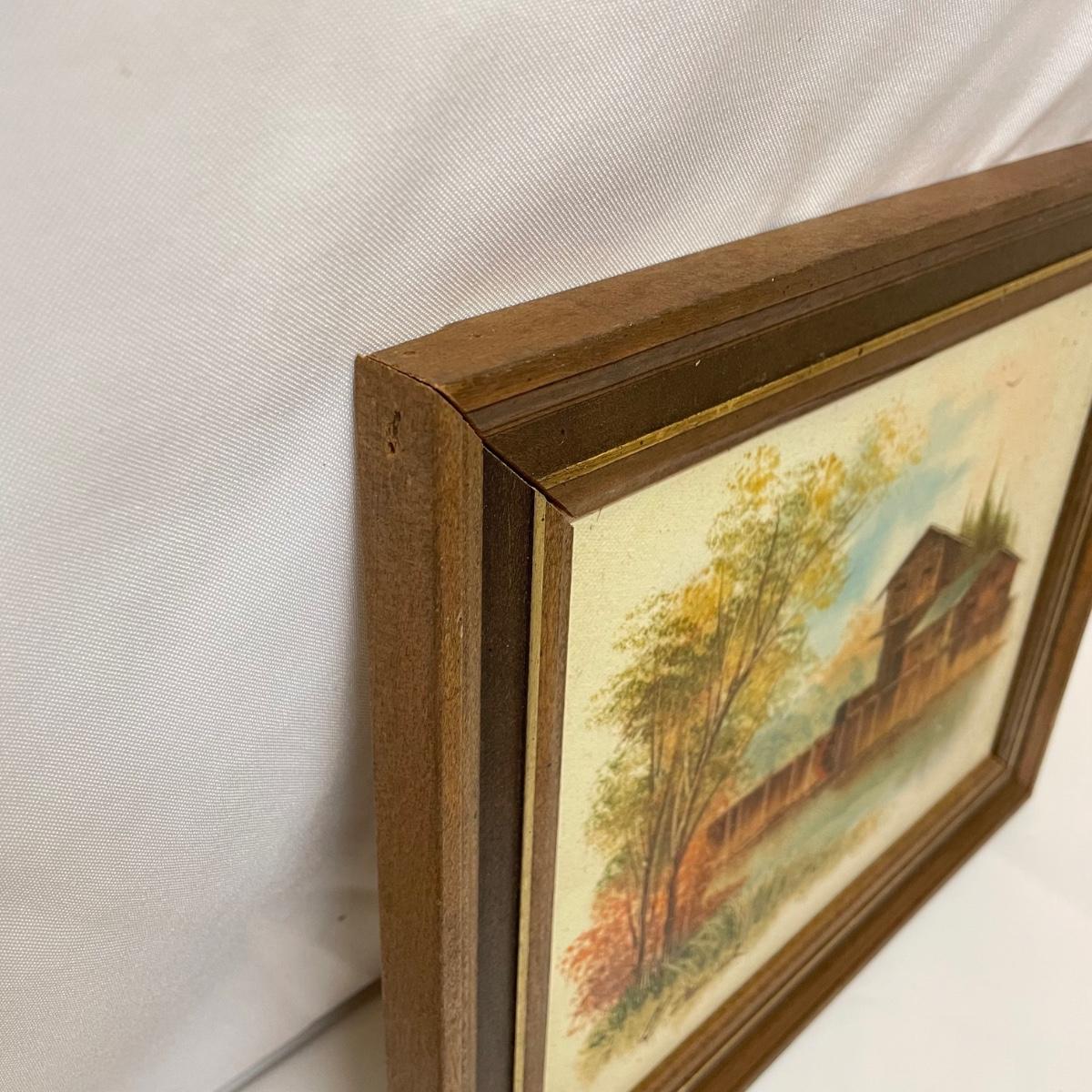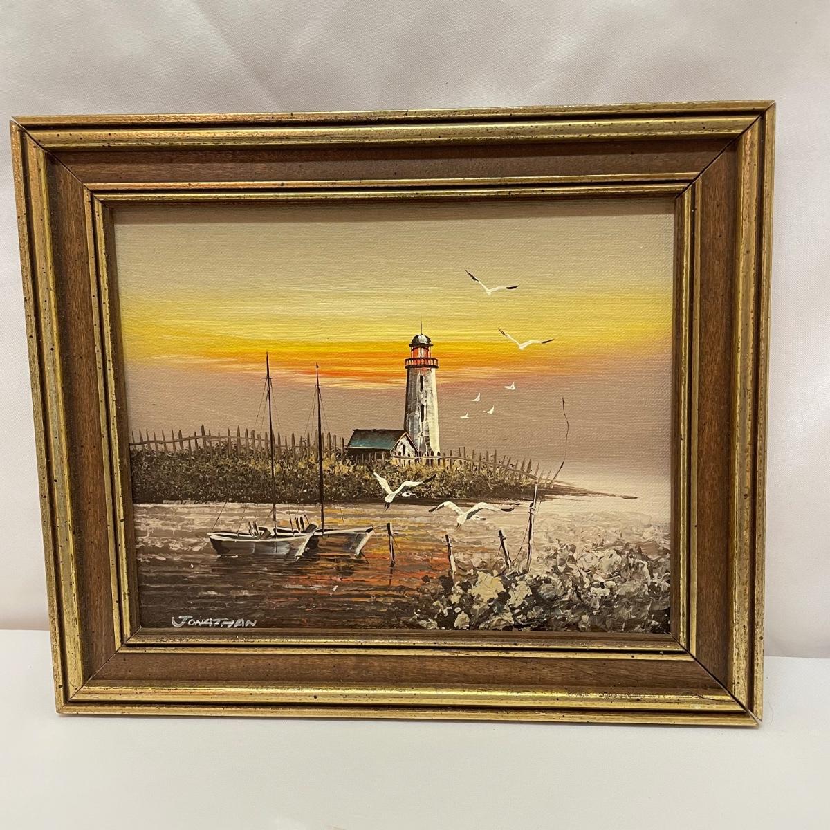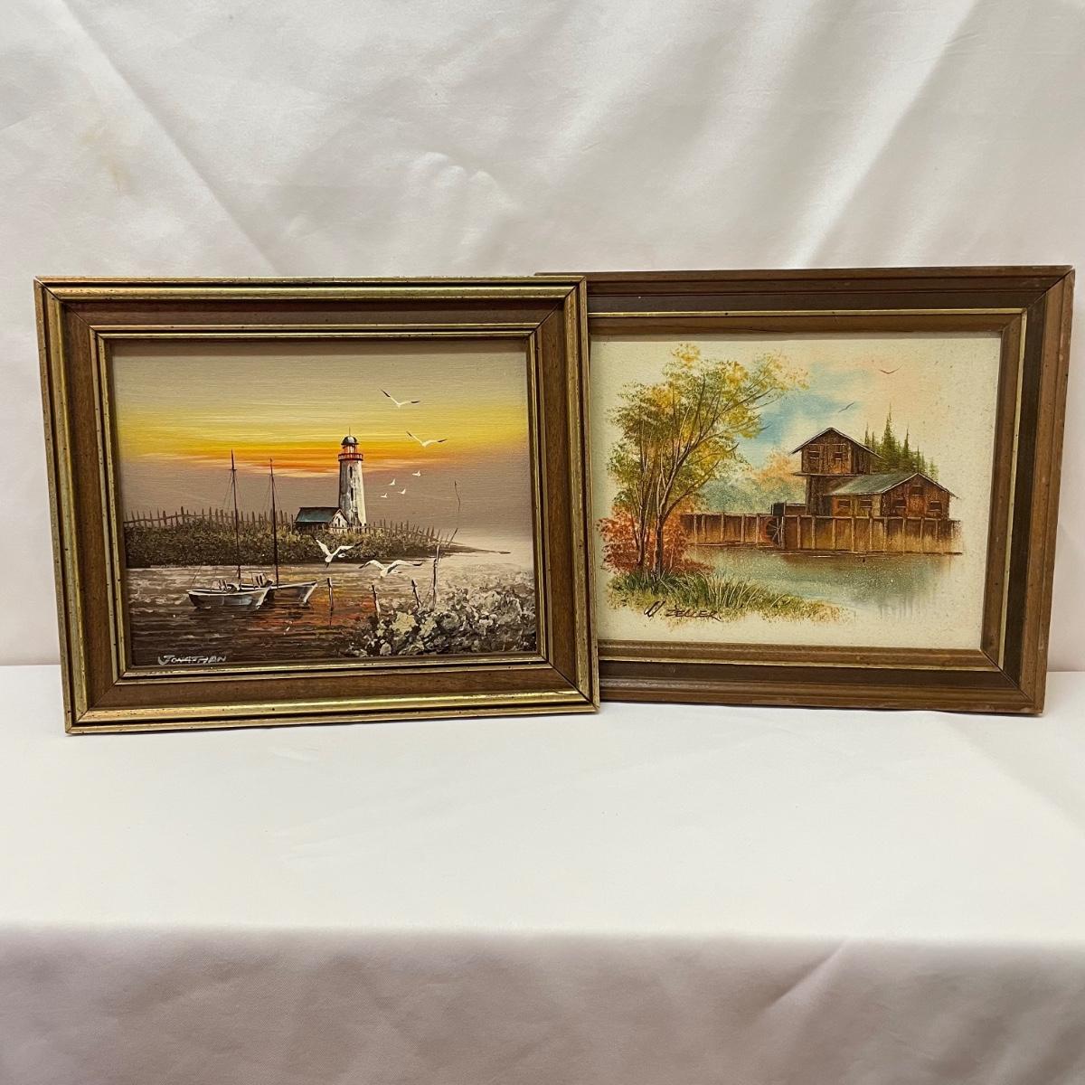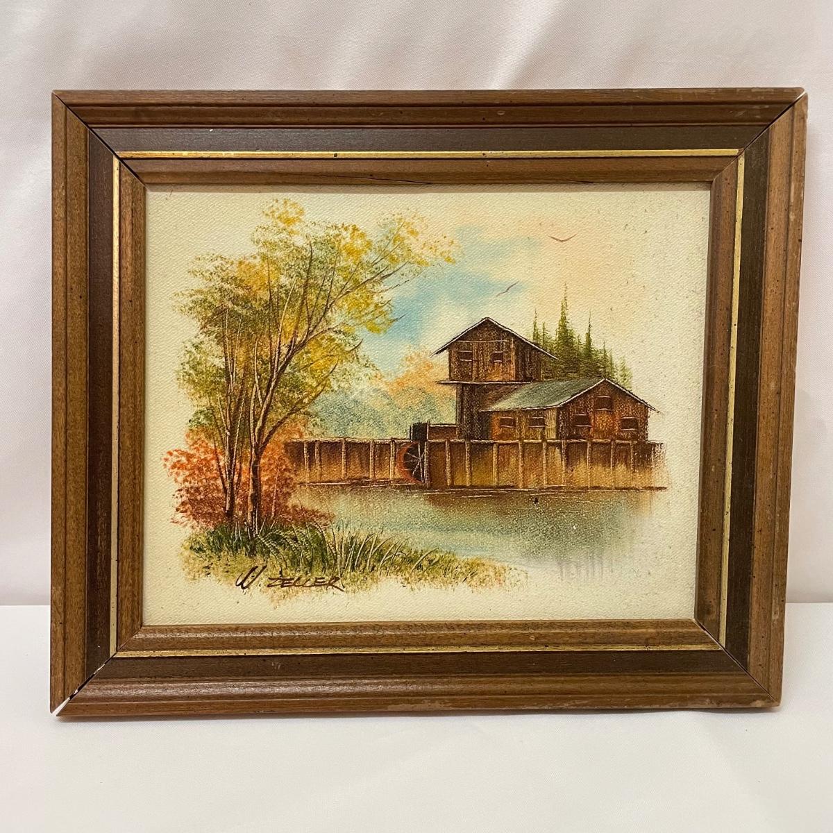 Two water scenes with wooden frames. The lighthouse art appears to be an oil painting with texture found throughout. The water mill cabin art is possibly signed by Wolfgang Zeller. This frame has some separation in the corners, but appears sturdy enough to hang. Both frames are 12.5” x 10.5”H. Shipping available.