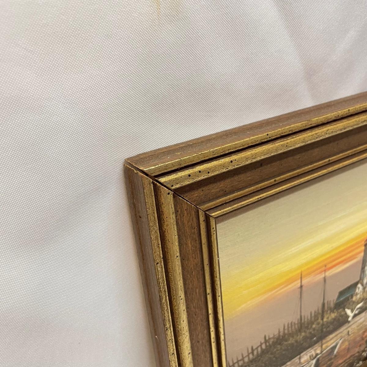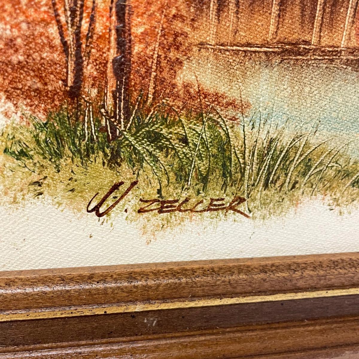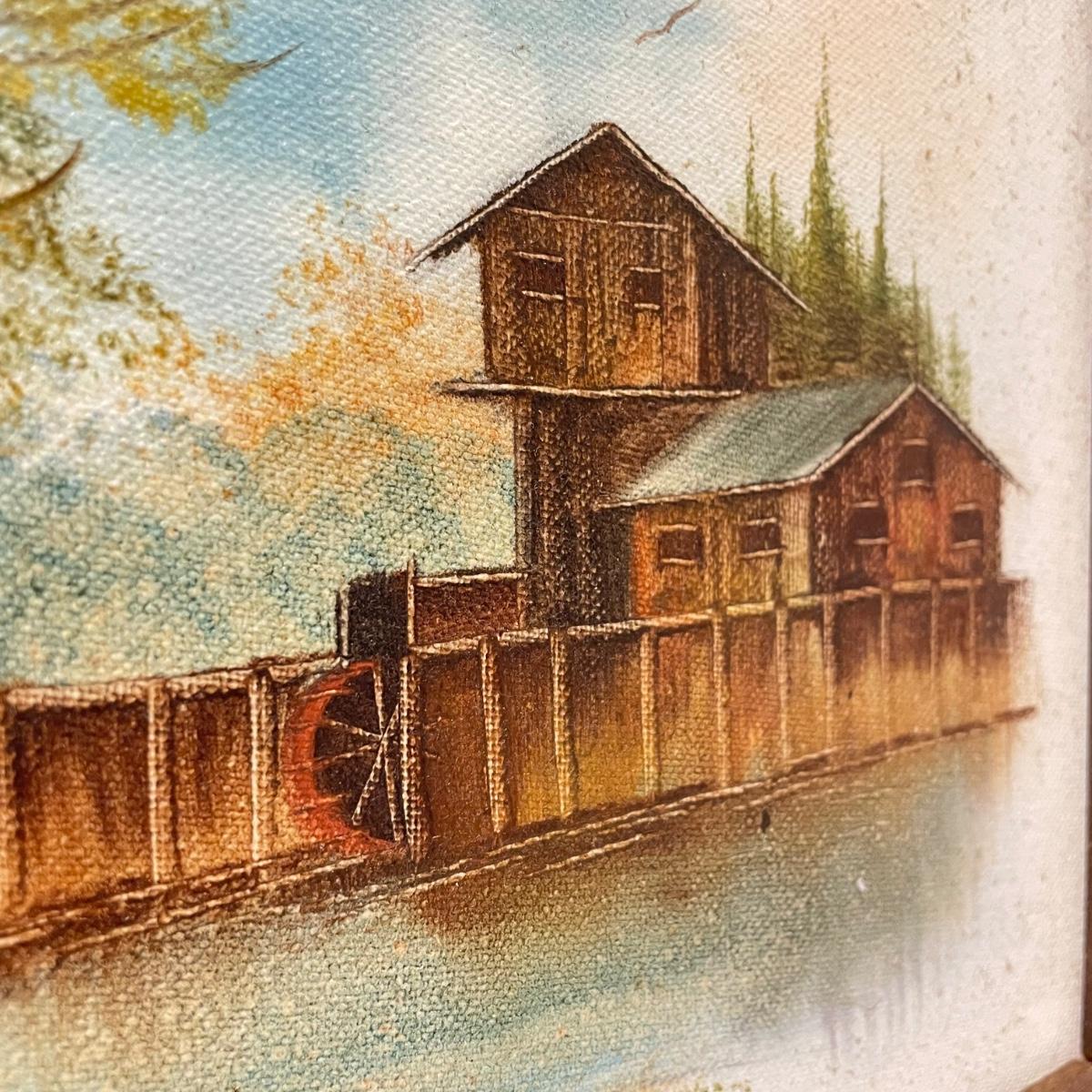Two water scenes with wooden frames. The lighthouse art appears to be an oil painting with texture found throughout. The water mill cabin art is possibly signed by Wolfgang Zeller. This frame has some separation in the corners, but appears sturdy enough to hang. Both frames are 12.5” x 10.5”H. Shipping available.