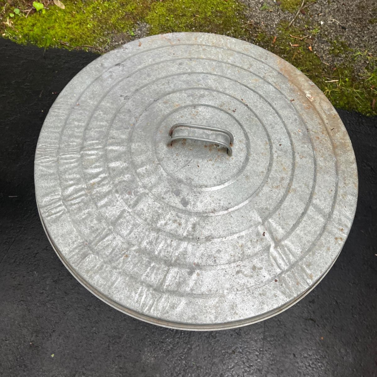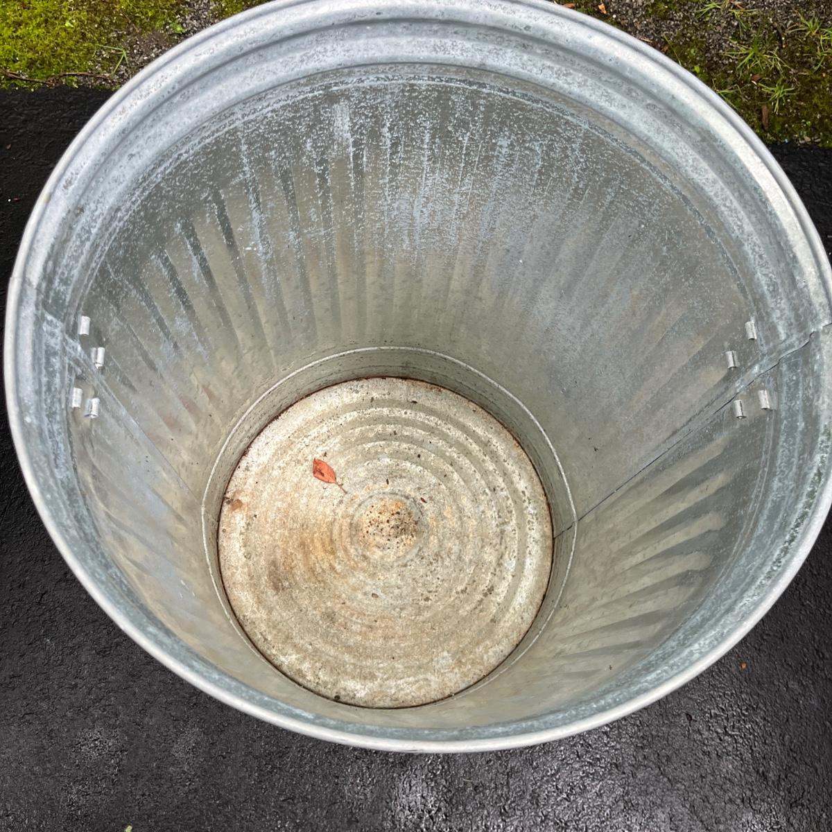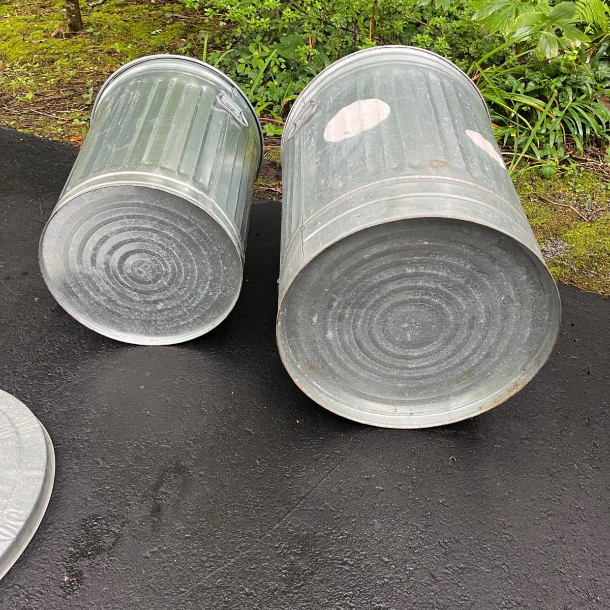 Lot includes two galvanized garbage cans with lids. Largest can measures 20.5”D x 30”H.