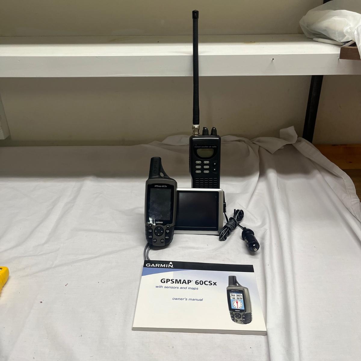 Lot includes a Garmin Nuvi, Garmin handheld GPS and a Uniden instant weather/ CB radio. All items powered on when plugged in. Also includes 110-12v plug.