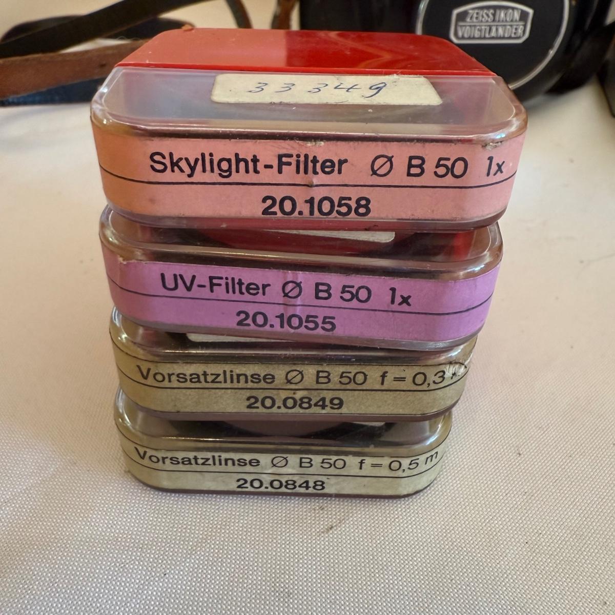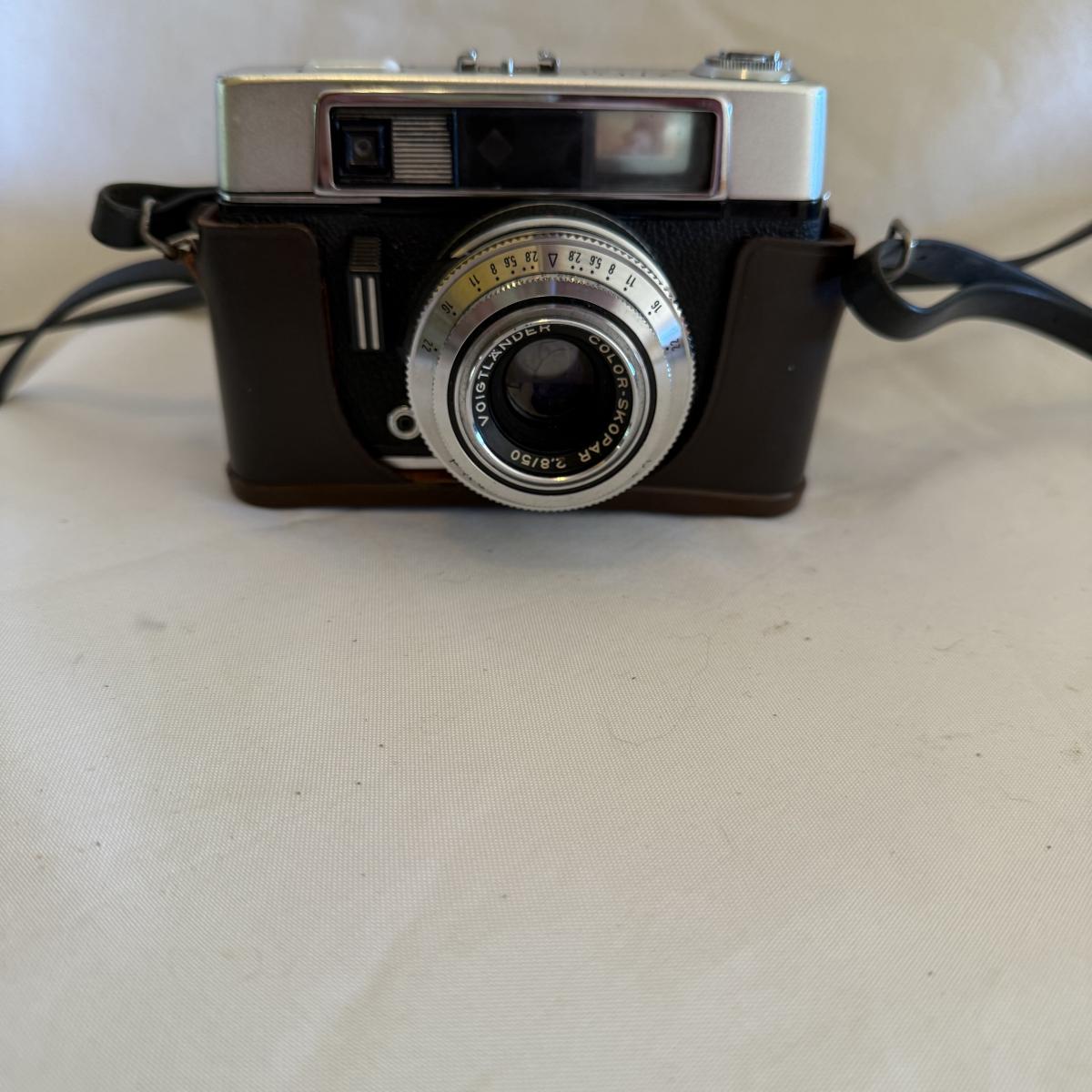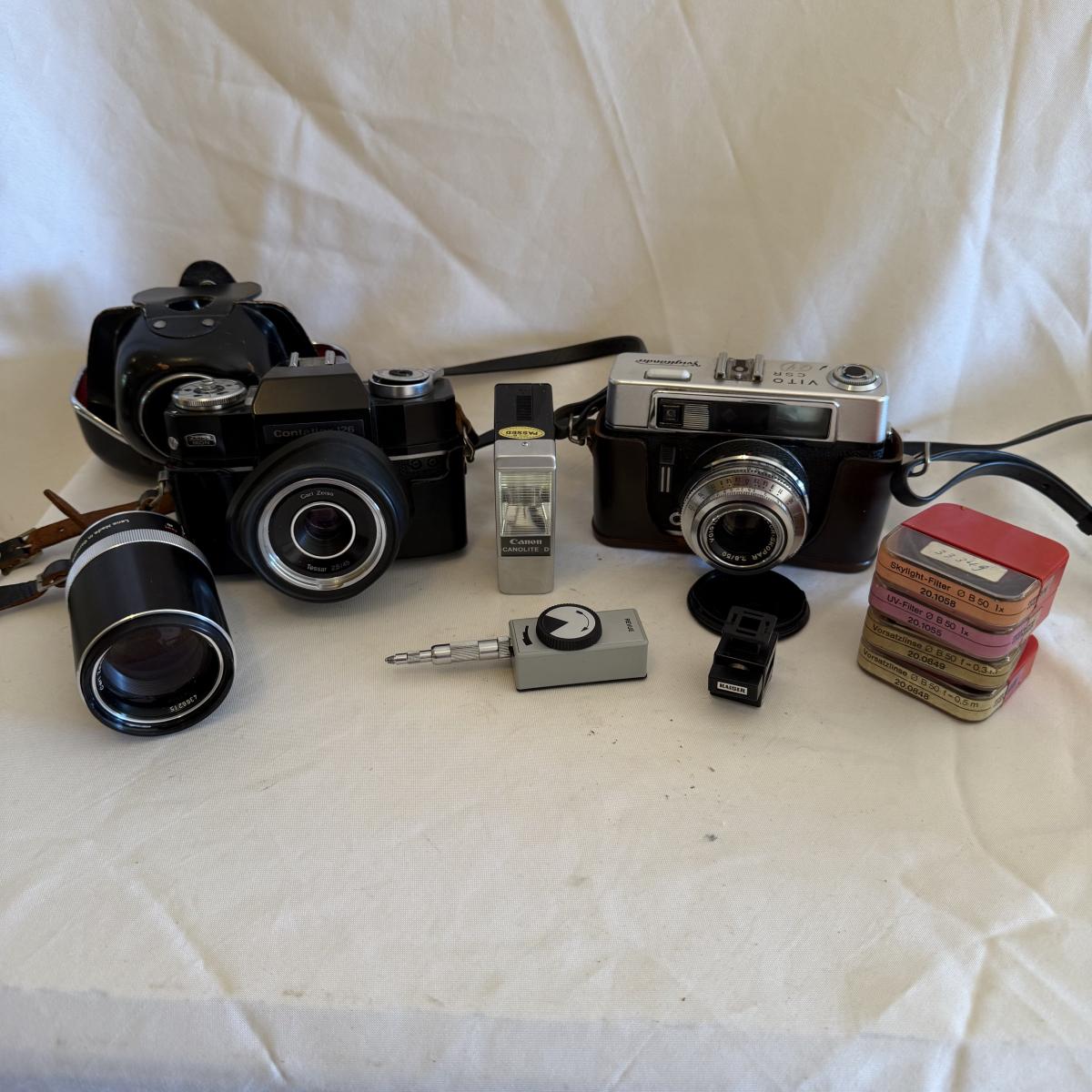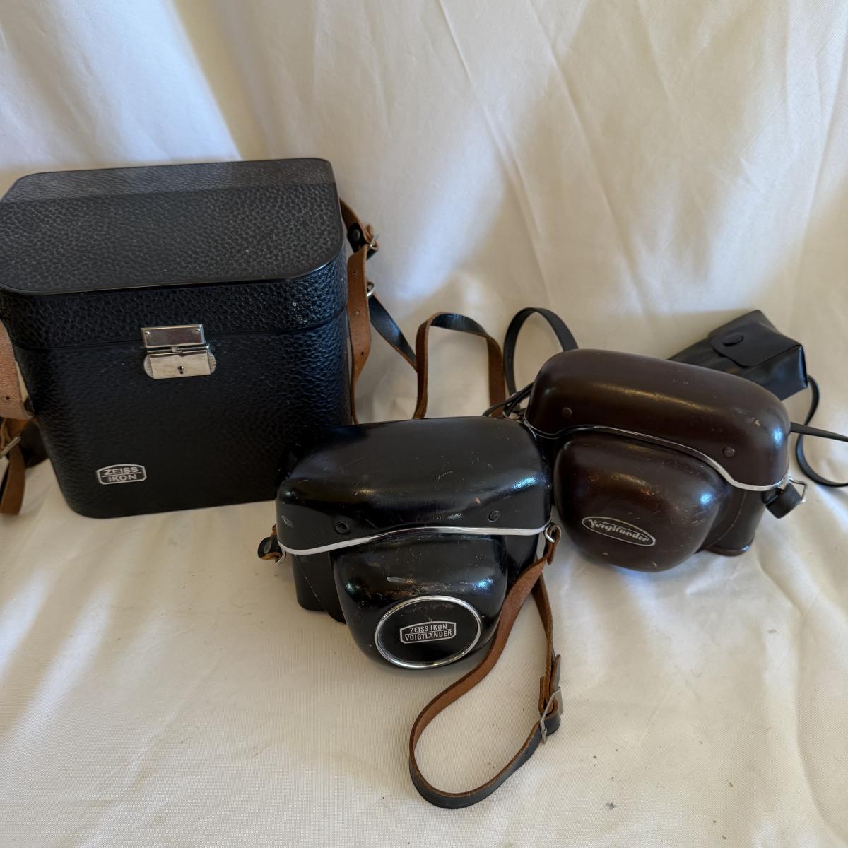 This lot contains two vintage cameras and some more parts. The first is a Voigtlander 35mm film camera, 5.5” x 4.5” x 4”H in case.. It comes with a case and a flash, the lens does appear to be cracked on the inside, see pictures for details. The next is a Zeiss Ikon 35mm SLR camera (5” x 4.5” x 4”H). This also comes in its own case. This camera has another lens with it. Also included in this lot is an additional case (7” x 5” x 6.25”H), a delay shutter release mechanical device, a Kaiser flash shoe adapter and four lens filters. Shipping available.