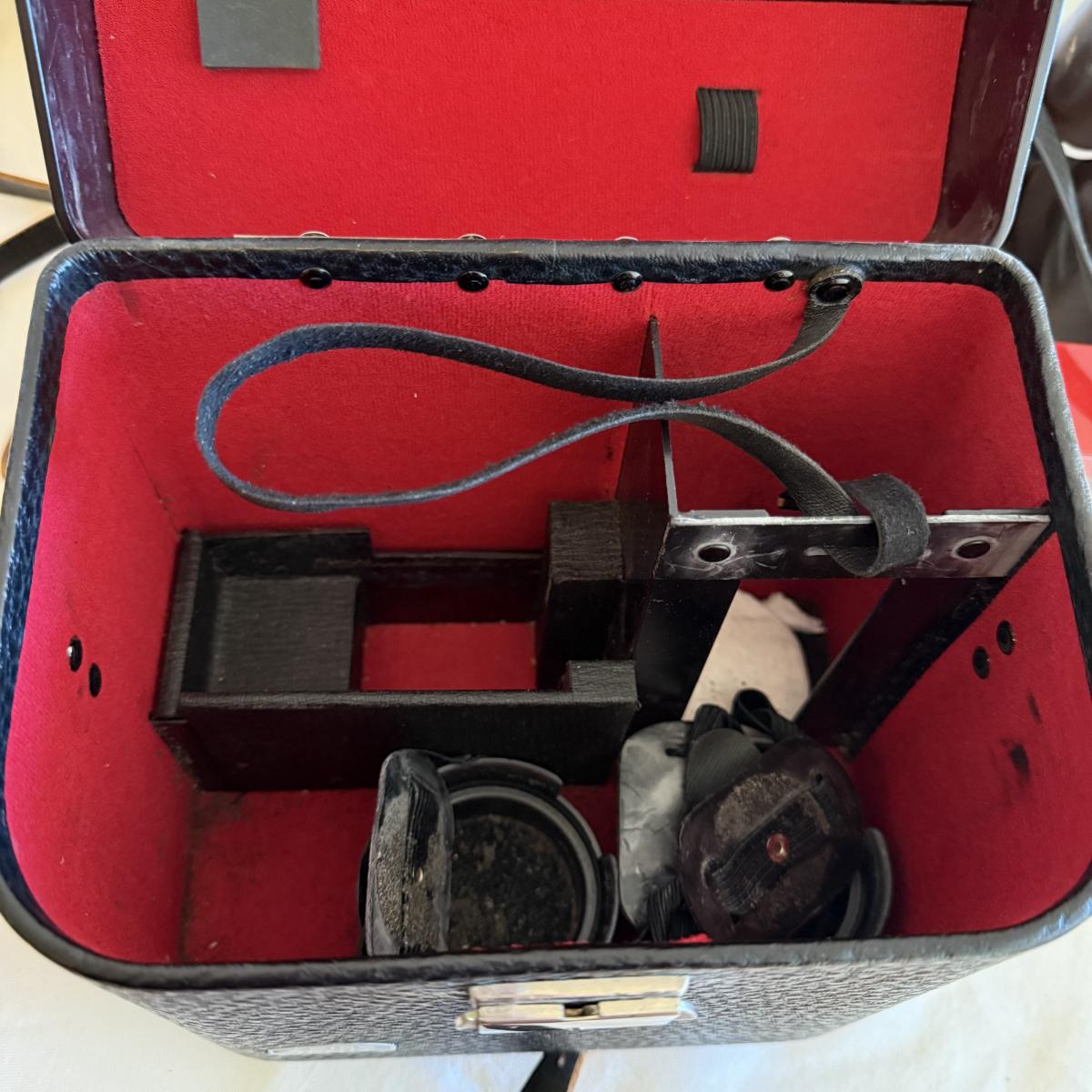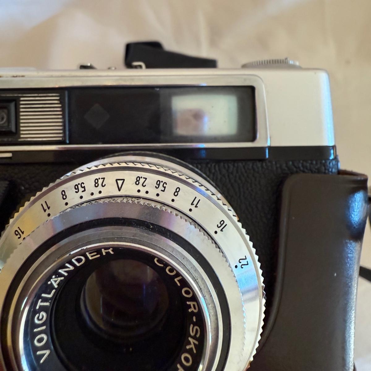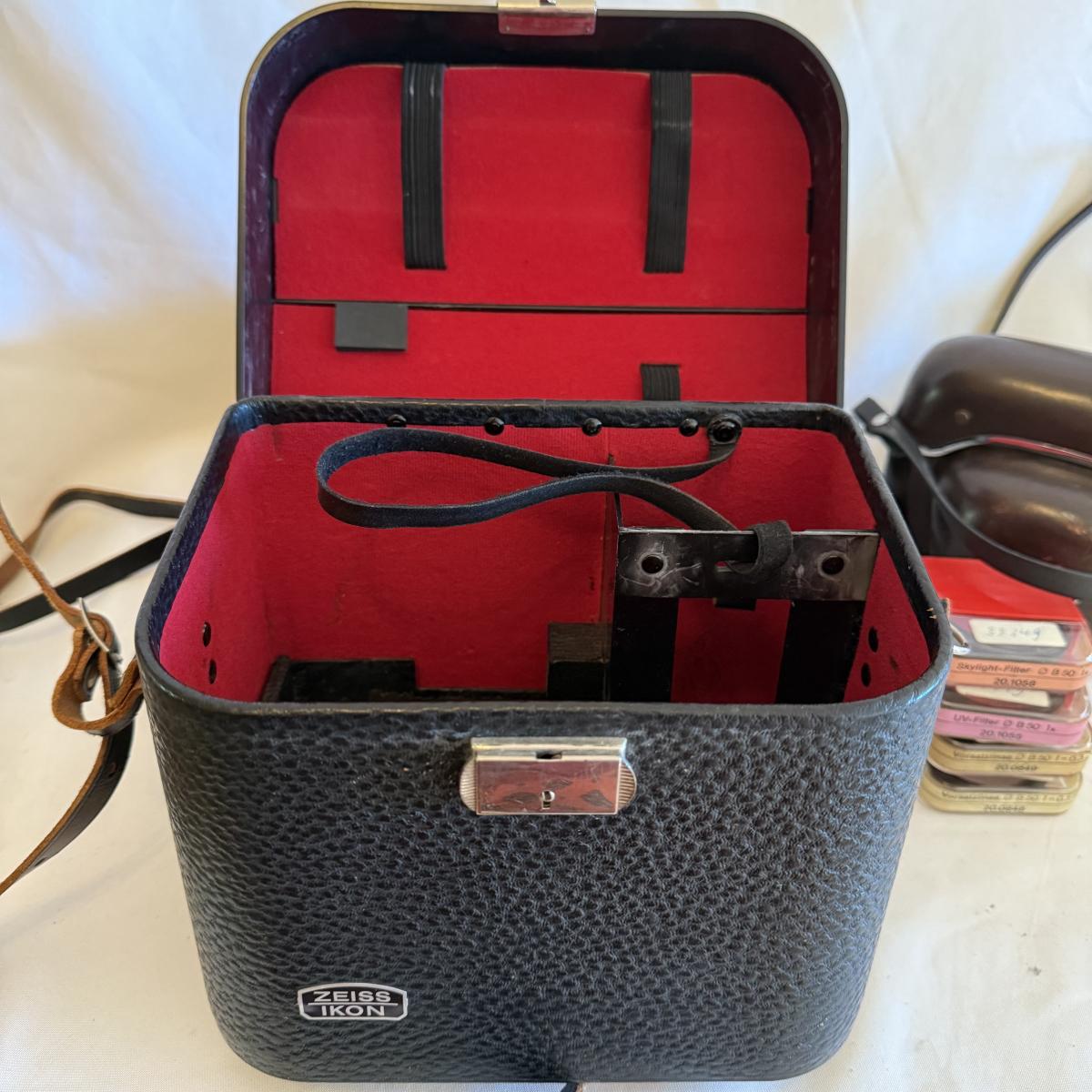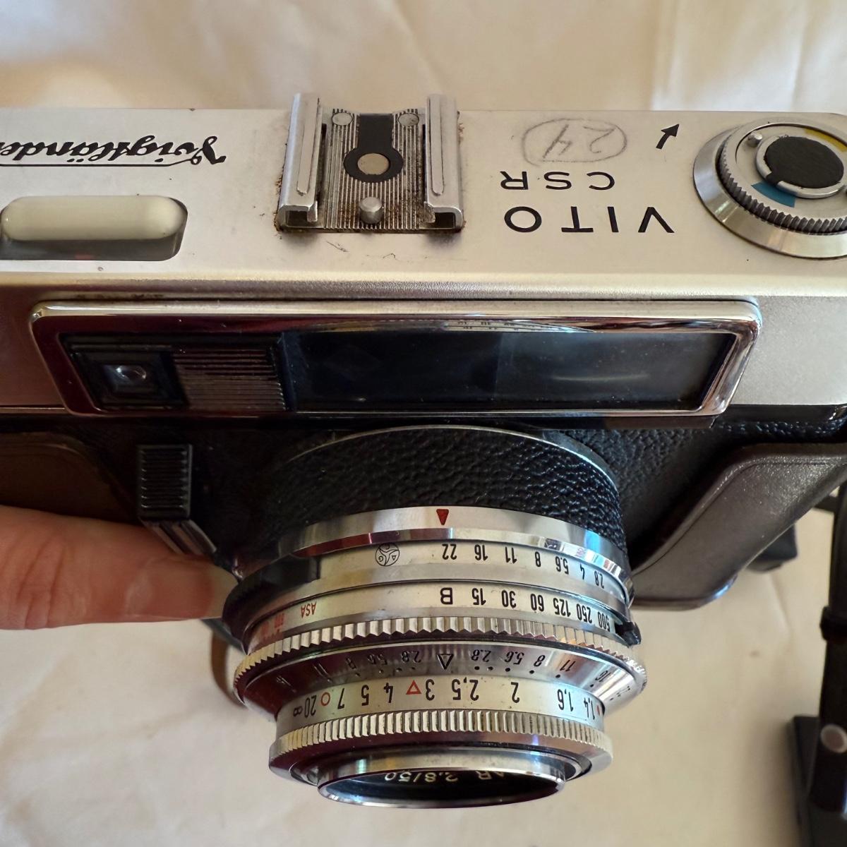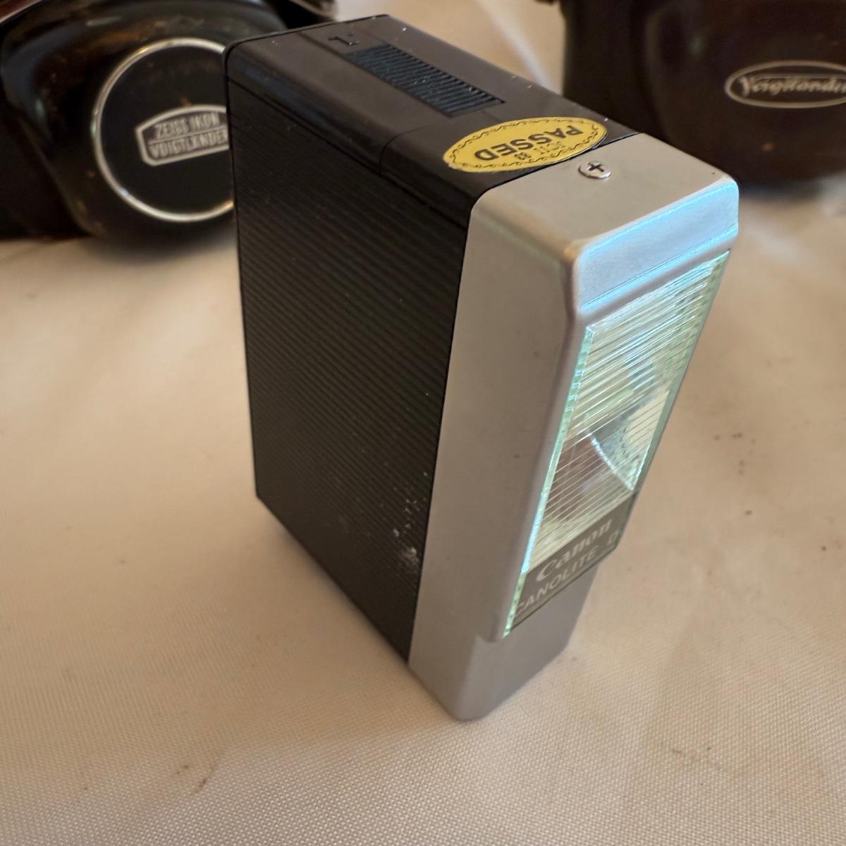 This lot contains two vintage cameras and some more parts. The first is a Voigtlander 35mm film camera, 5.5” x 4.5” x 4”H in case.. It comes with a case and a flash, the lens does appear to be cracked on the inside, see pictures for details. The next is a Zeiss Ikon 35mm SLR camera (5” x 4.5” x 4”H). This also comes in its own case. This camera has another lens with it. Also included in this lot is an additional case (7” x 5” x 6.25”H), a delay shutter release mechanical device, a Kaiser flash shoe adapter and four lens filters. Shipping available.