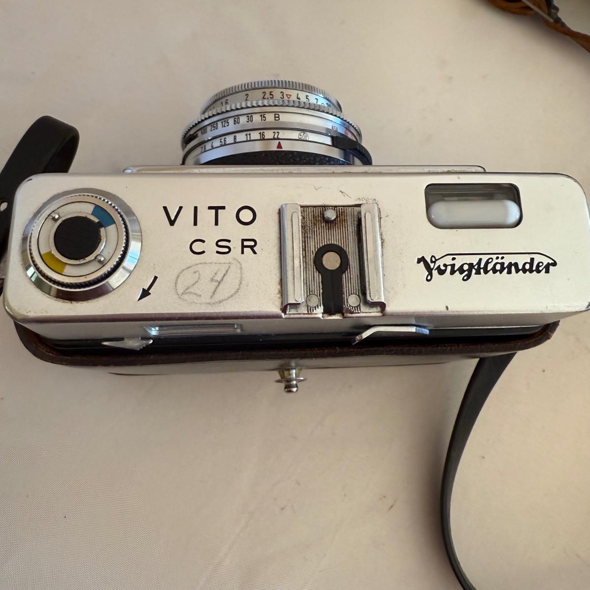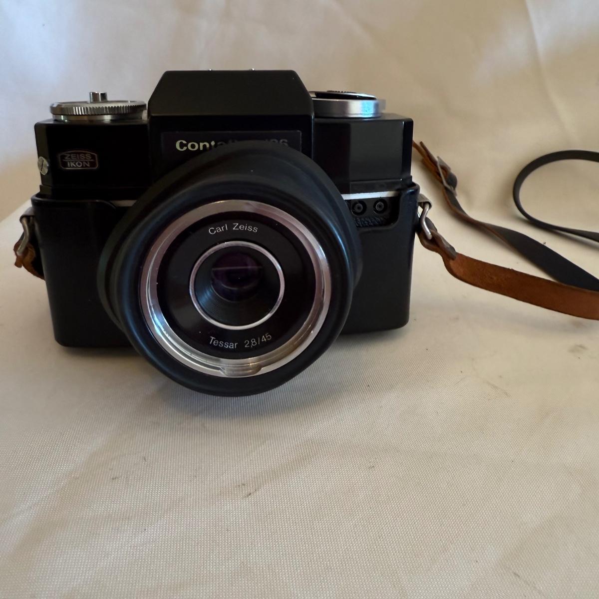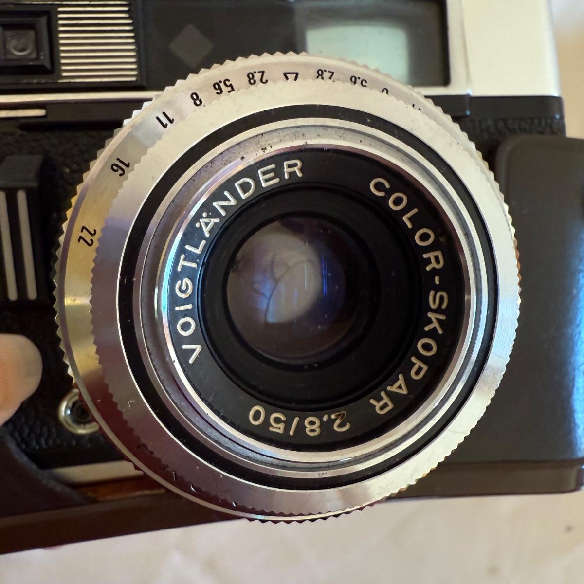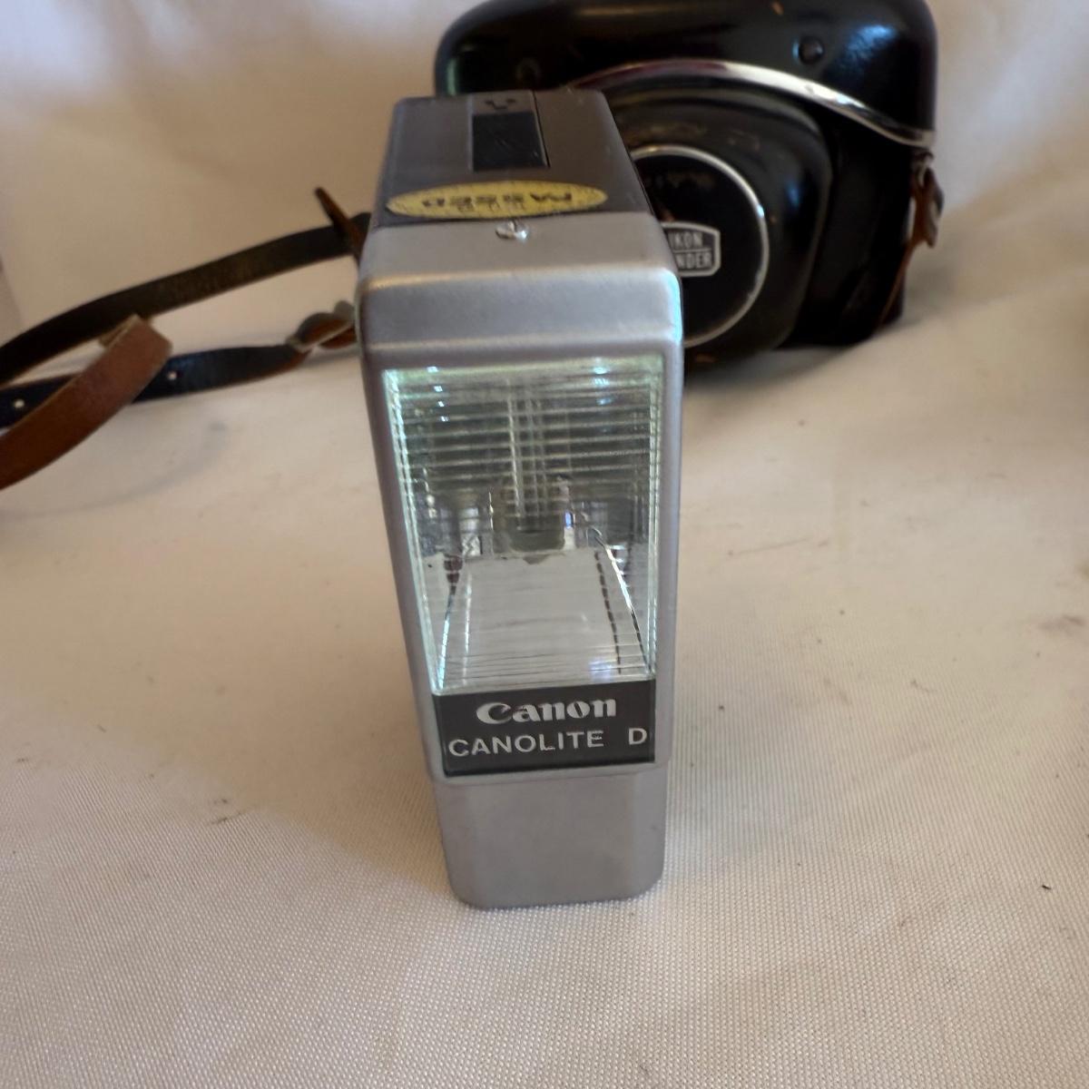 This lot contains two vintage cameras and some more parts. The first is a Voigtlander 35mm film camera, 5.5” x 4.5” x 4”H in case.. It comes with a case and a flash, the lens does appear to be cracked on the inside, see pictures for details. The next is a Zeiss Ikon 35mm SLR camera (5” x 4.5” x 4”H). This also comes in its own case. This camera has another lens with it. Also included in this lot is an additional case (7” x 5” x 6.25”H), a delay shutter release mechanical device, a Kaiser flash shoe adapter and four lens filters. Shipping available.