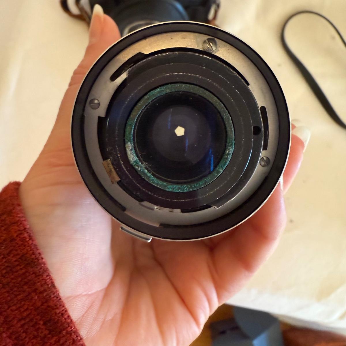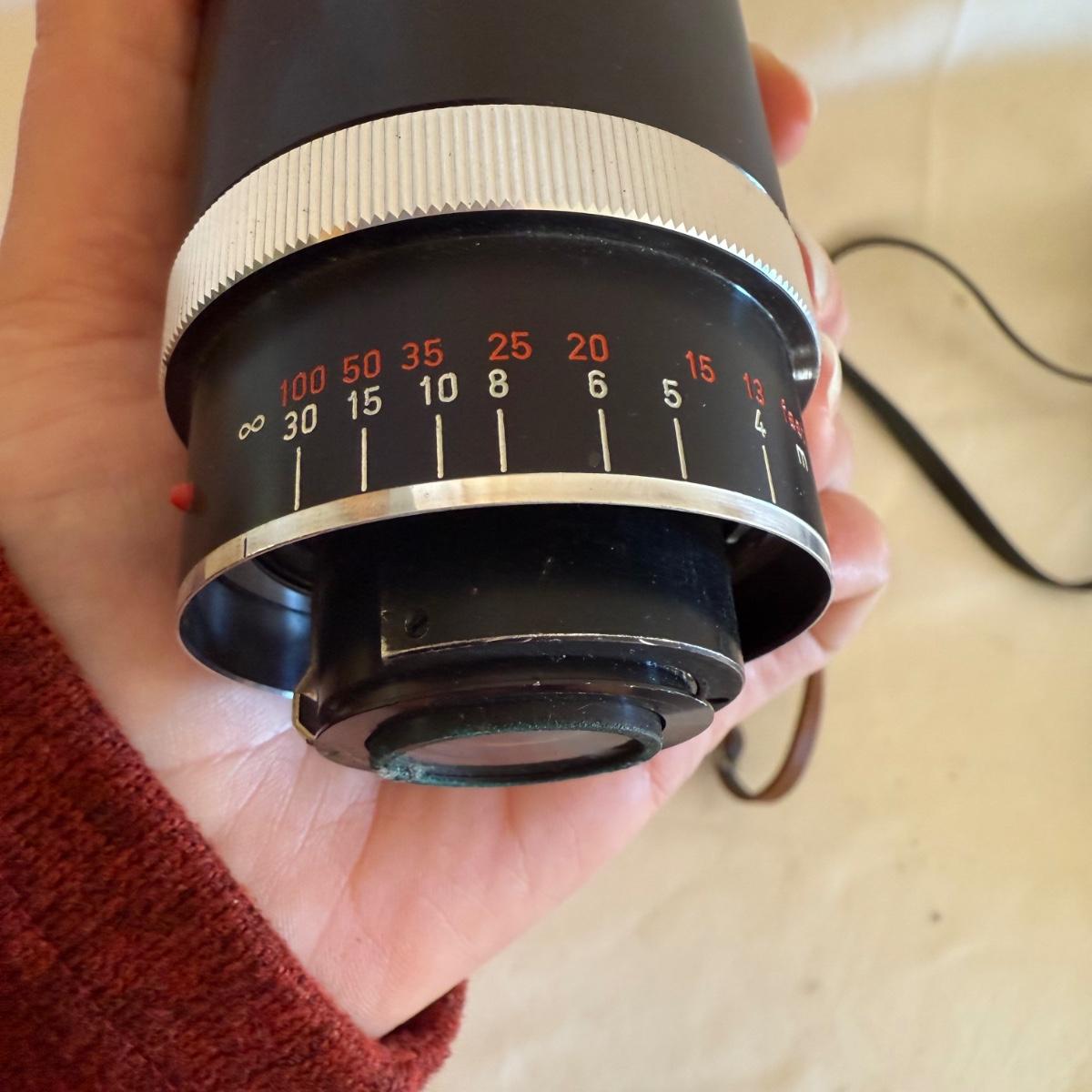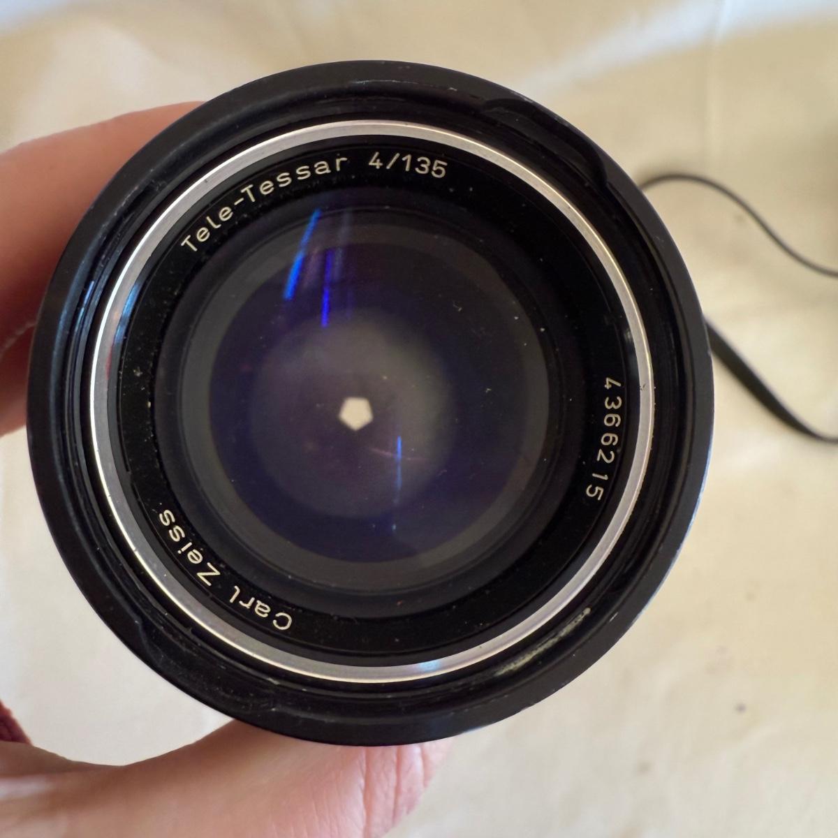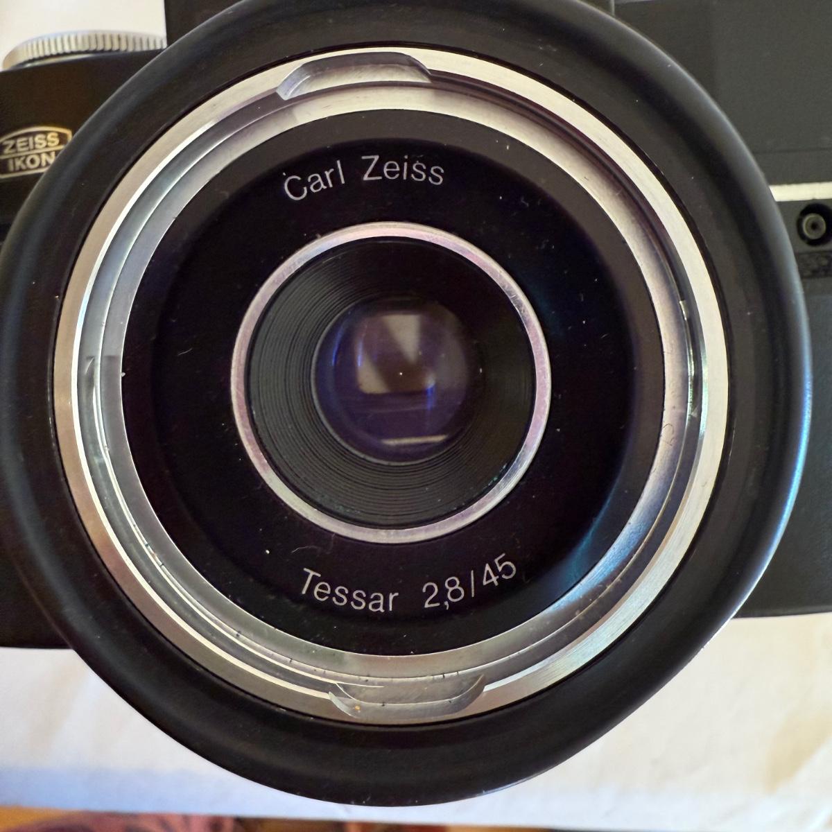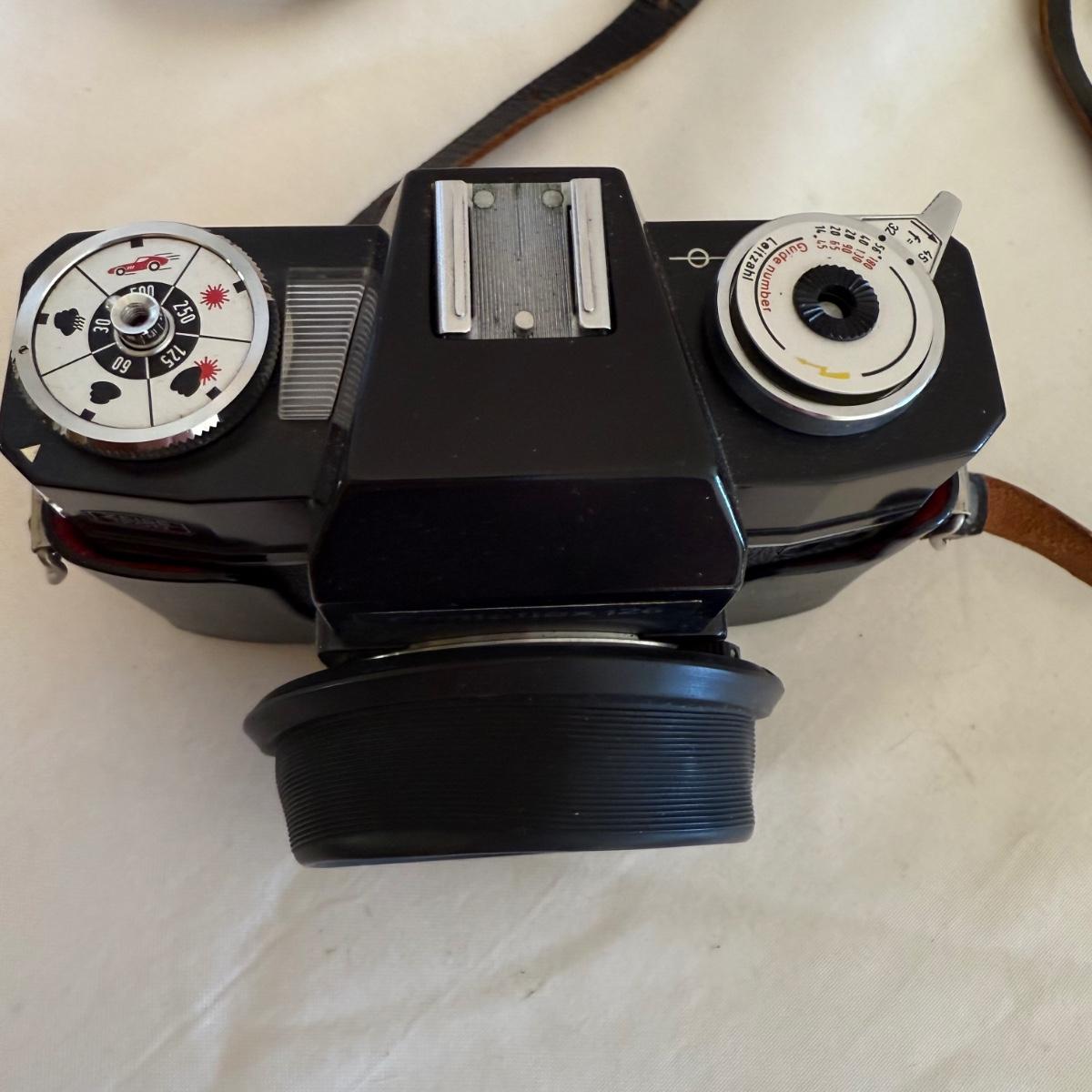 This lot contains two vintage cameras and some more parts. The first is a Voigtlander 35mm film camera, 5.5” x 4.5” x 4”H in case.. It comes with a case and a flash, the lens does appear to be cracked on the inside, see pictures for details. The next is a Zeiss Ikon 35mm SLR camera (5” x 4.5” x 4”H). This also comes in its own case. This camera has another lens with it. Also included in this lot is an additional case (7” x 5” x 6.25”H), a delay shutter release mechanical device, a Kaiser flash shoe adapter and four lens filters. Shipping available.