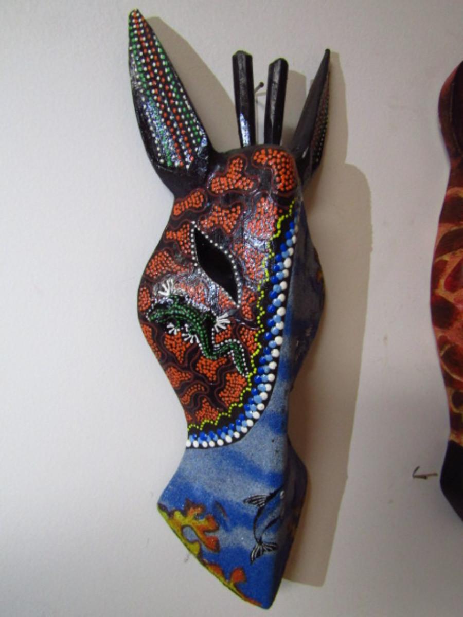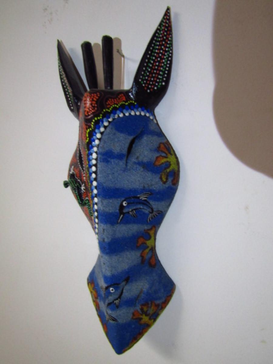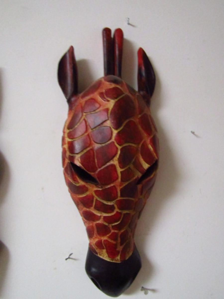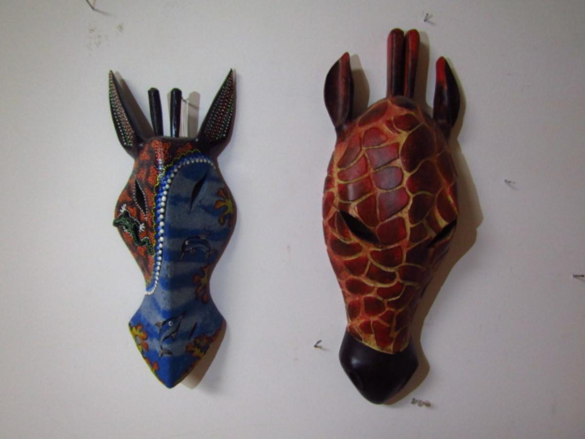 Two Giraffe Figural Masks for Wall Hanging. Blue one is wooden, the other is resin from Hobby Lobby.