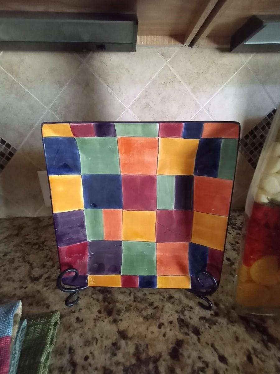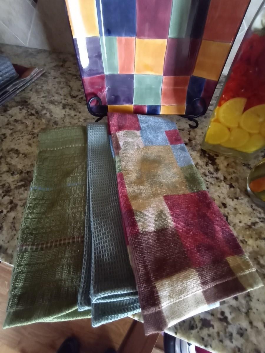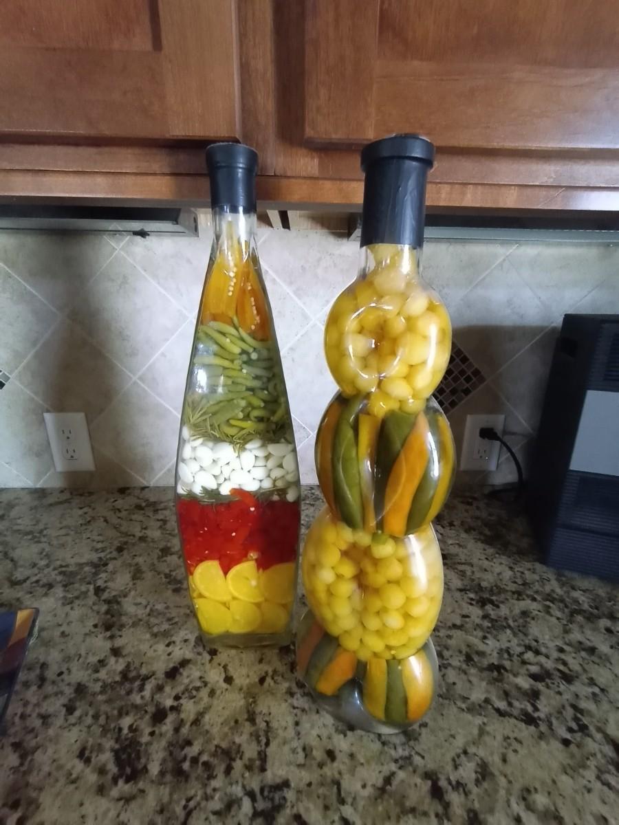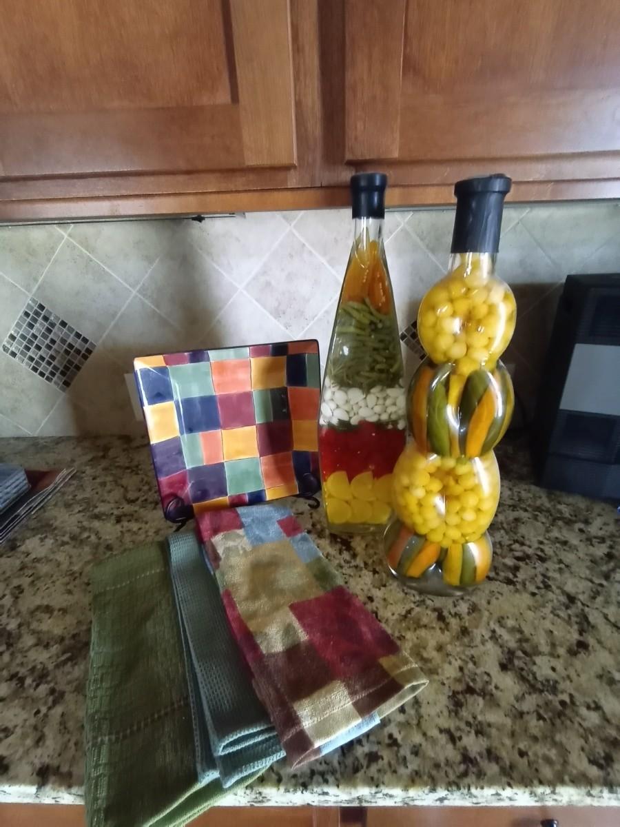 TWO GLASS BOTTLES FILLED WITH PEPPERS-DISH TOWELS AND DECO PLATE ON STAND