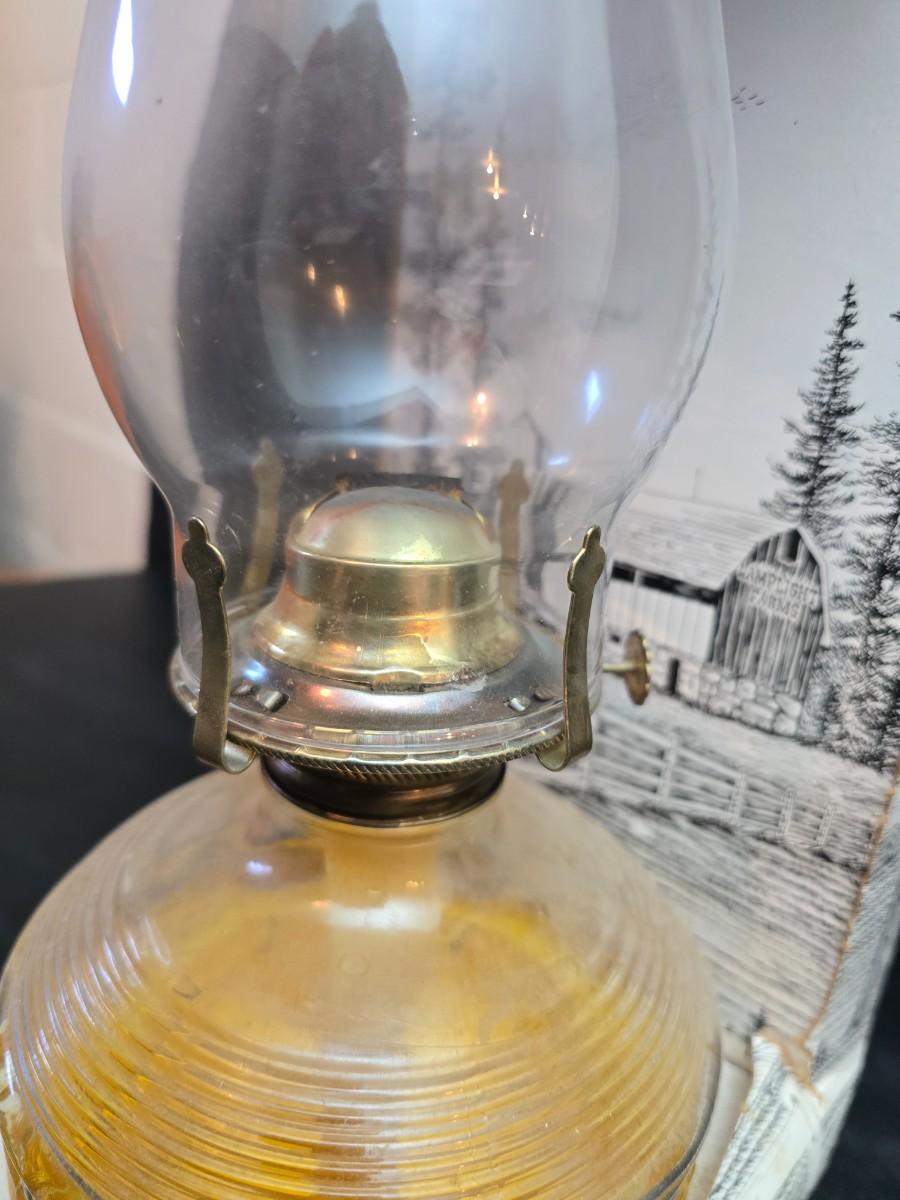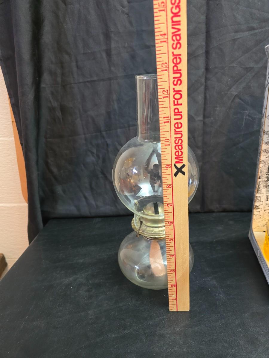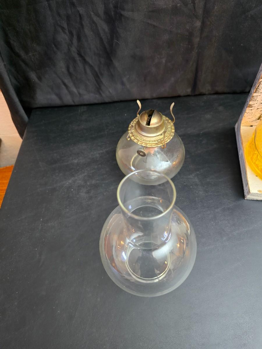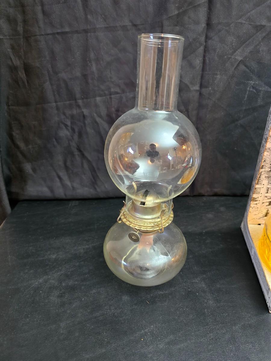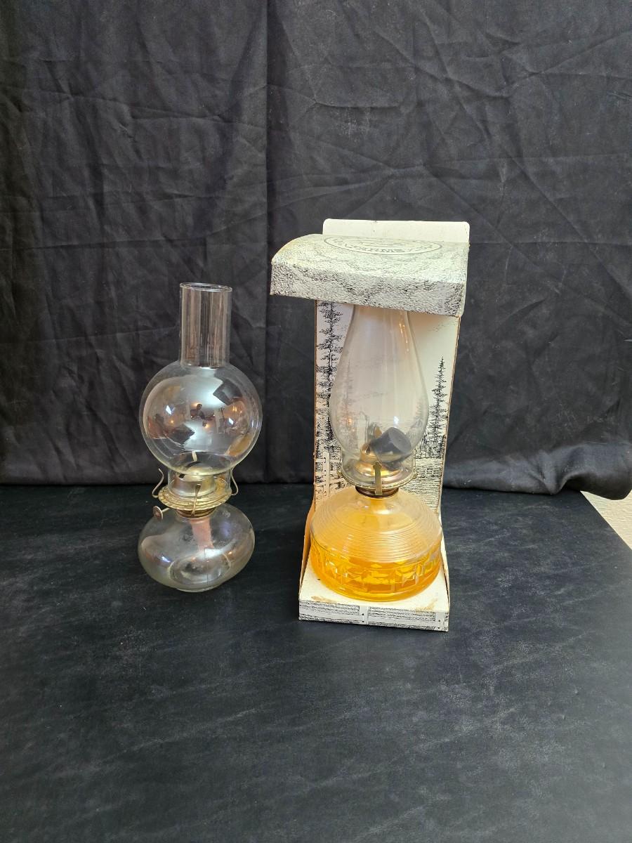 Two glass chamber-style oil lamps -Lamplight Farms.