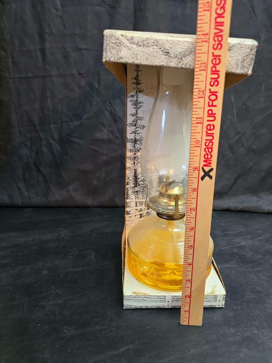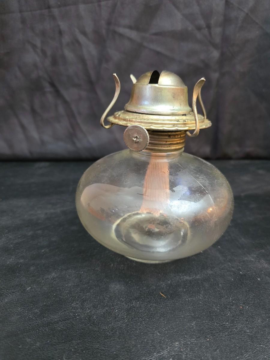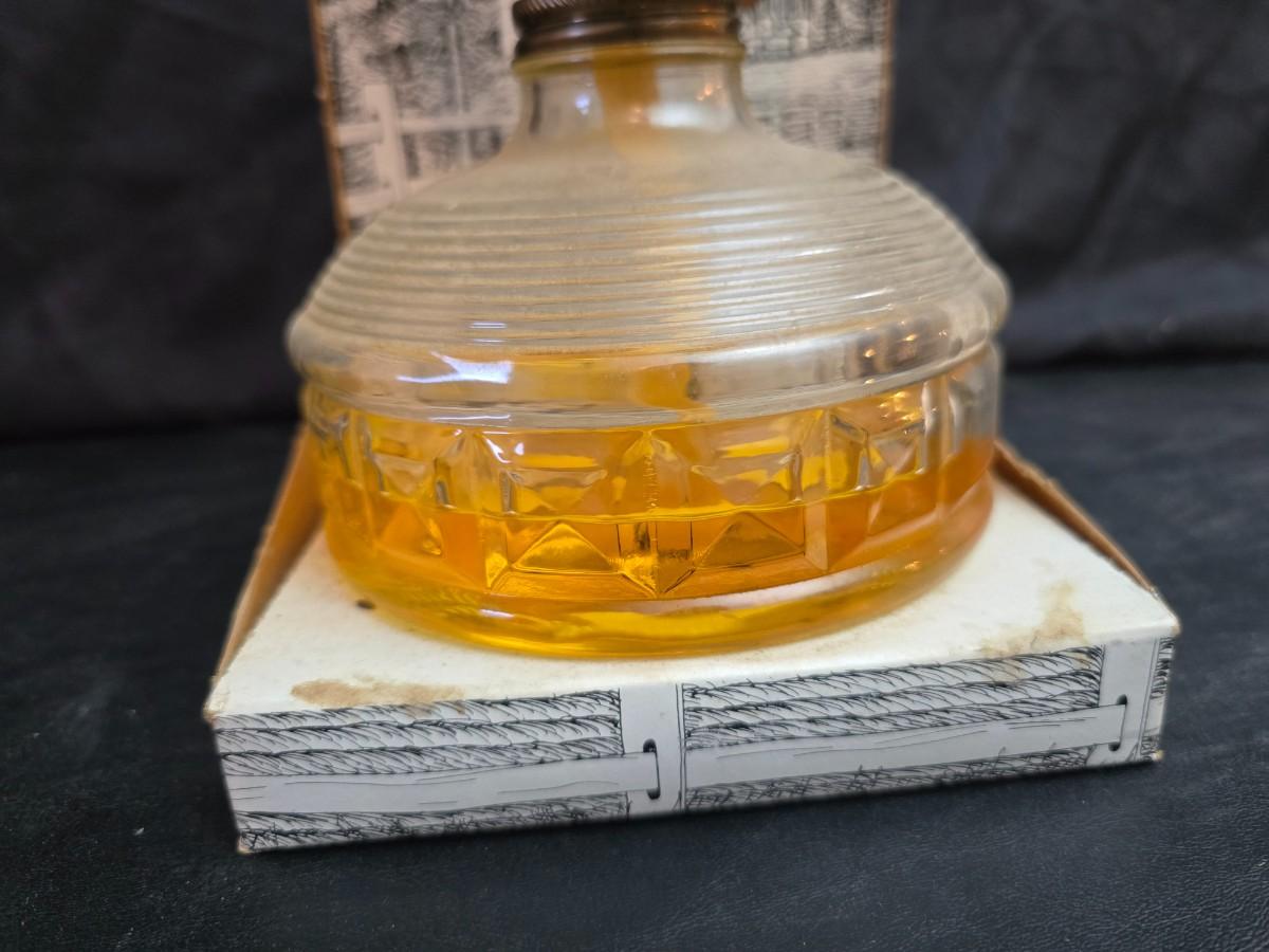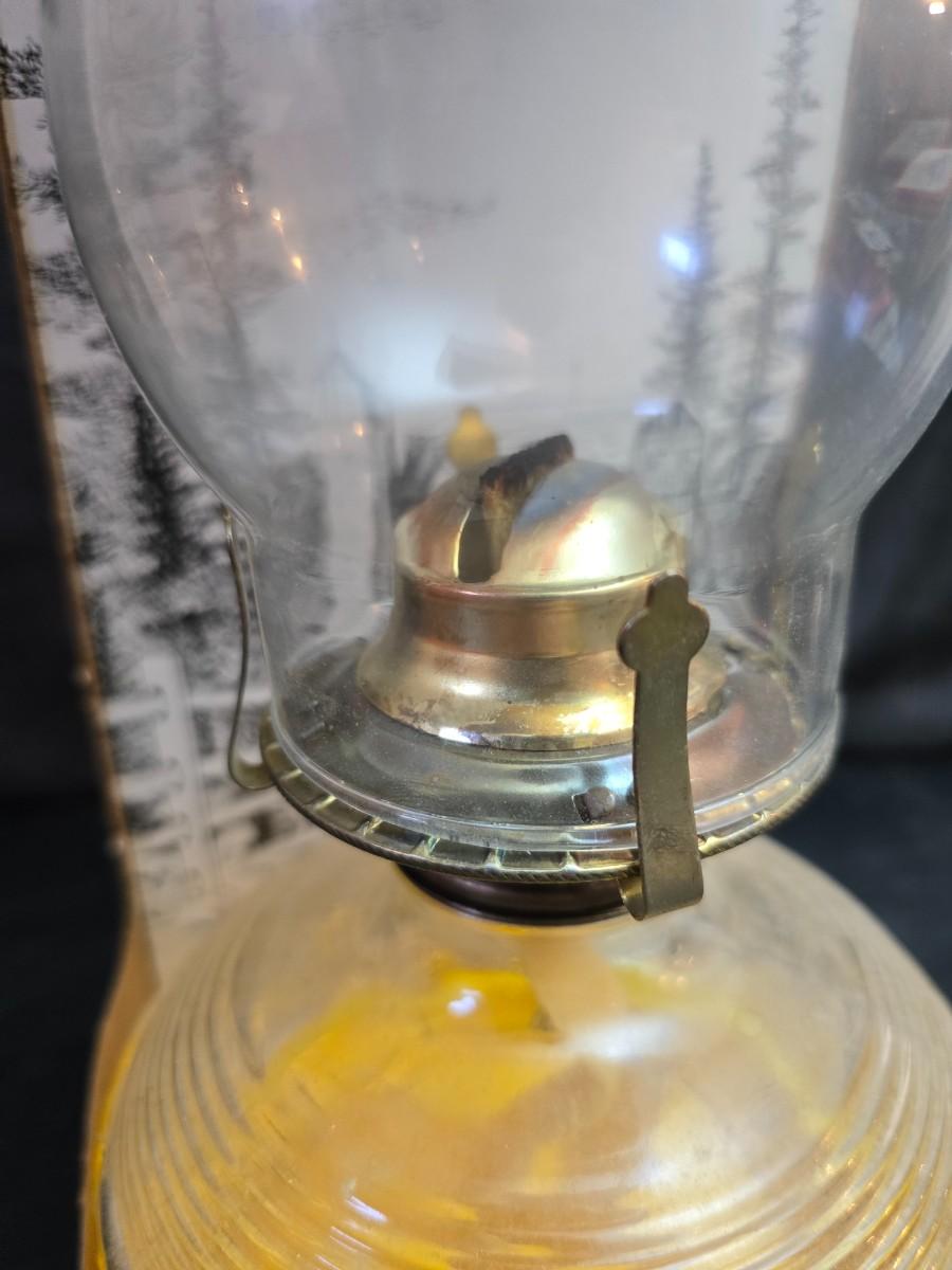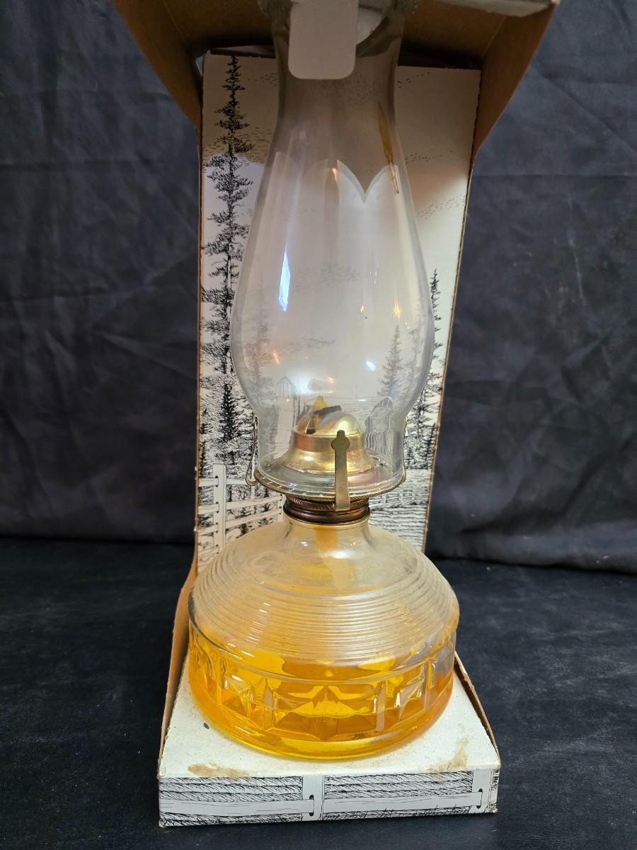 Two glass chamber-style oil lamps -Lamplight Farms.