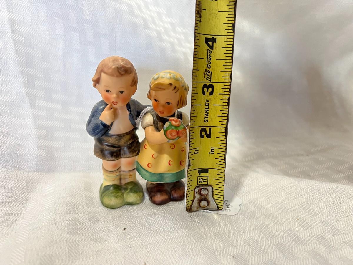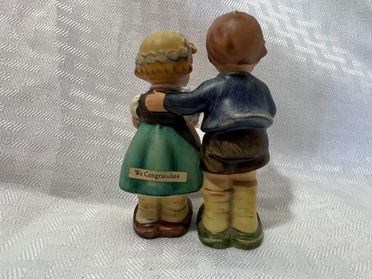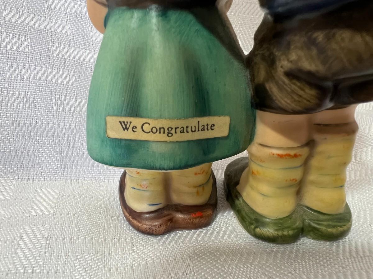 TWO GLASS HUMMELS, BOY SITTING ON FENCE (4 INCHES), "WE CONGRATULATE" GIRL AND BOY STANDING. (3 INCHES)