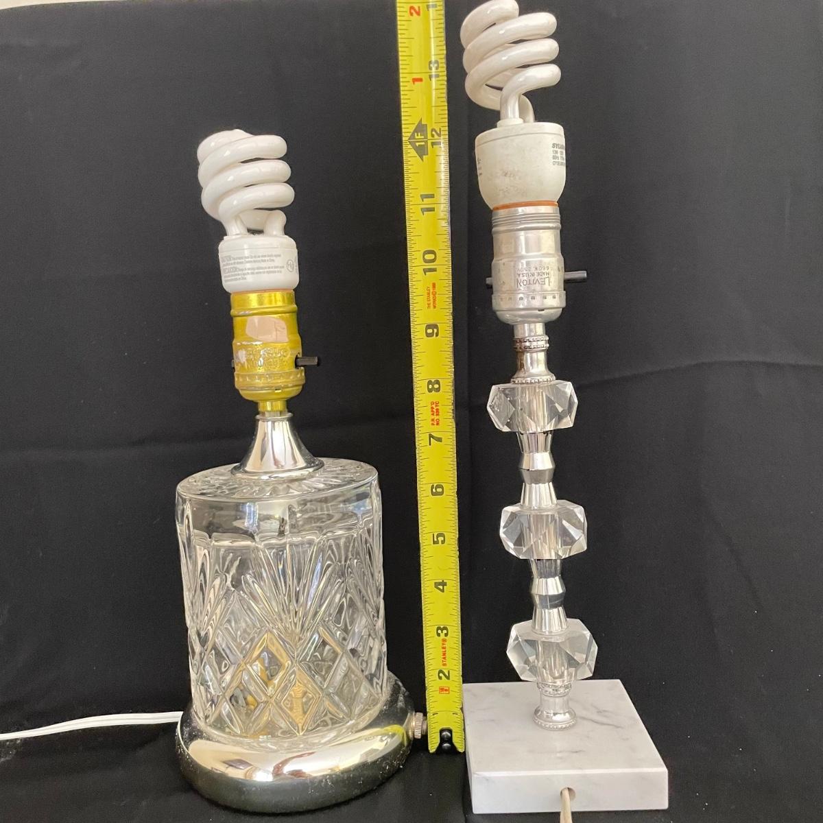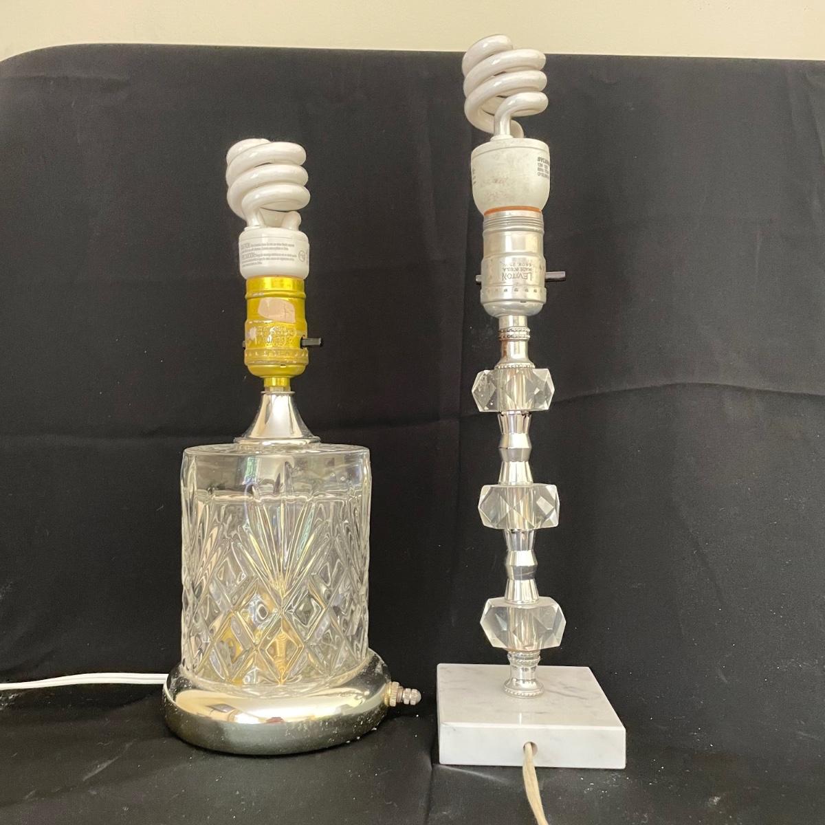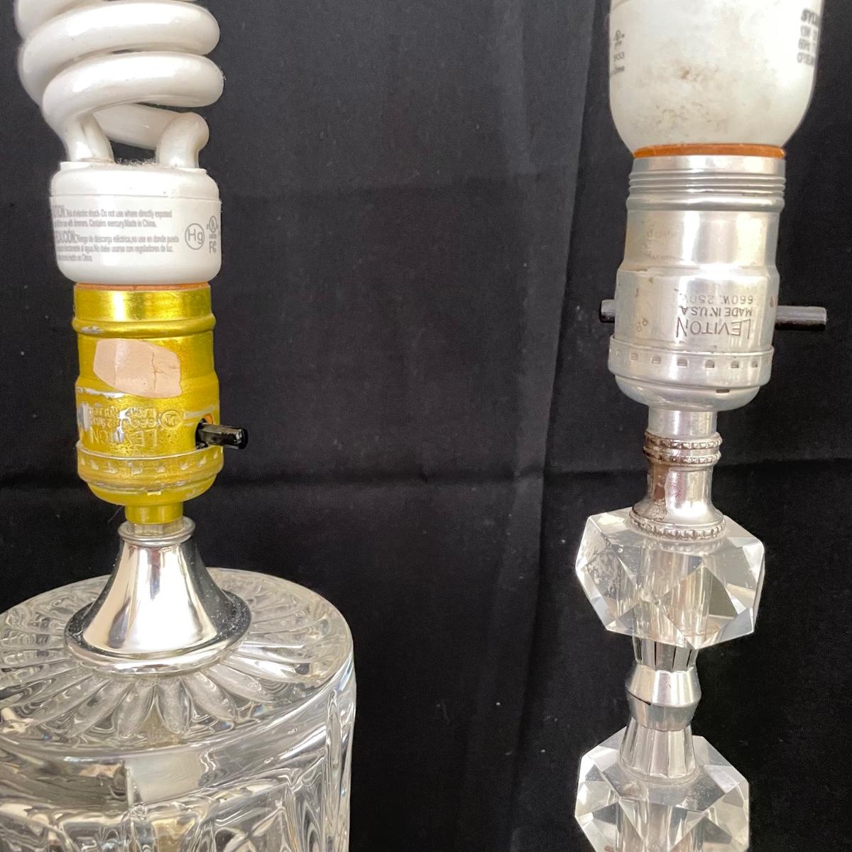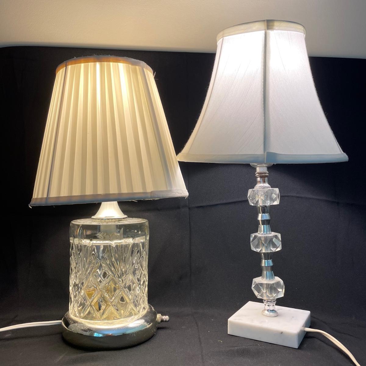 Two lovely glass or crystal lamps. One lamp is alternating glass and silver while the other has a glass “reservoir” that can be lit by the switch on the base. Both lamps have nice shades that fit on the current LEDs.. See images. Local pick up only.