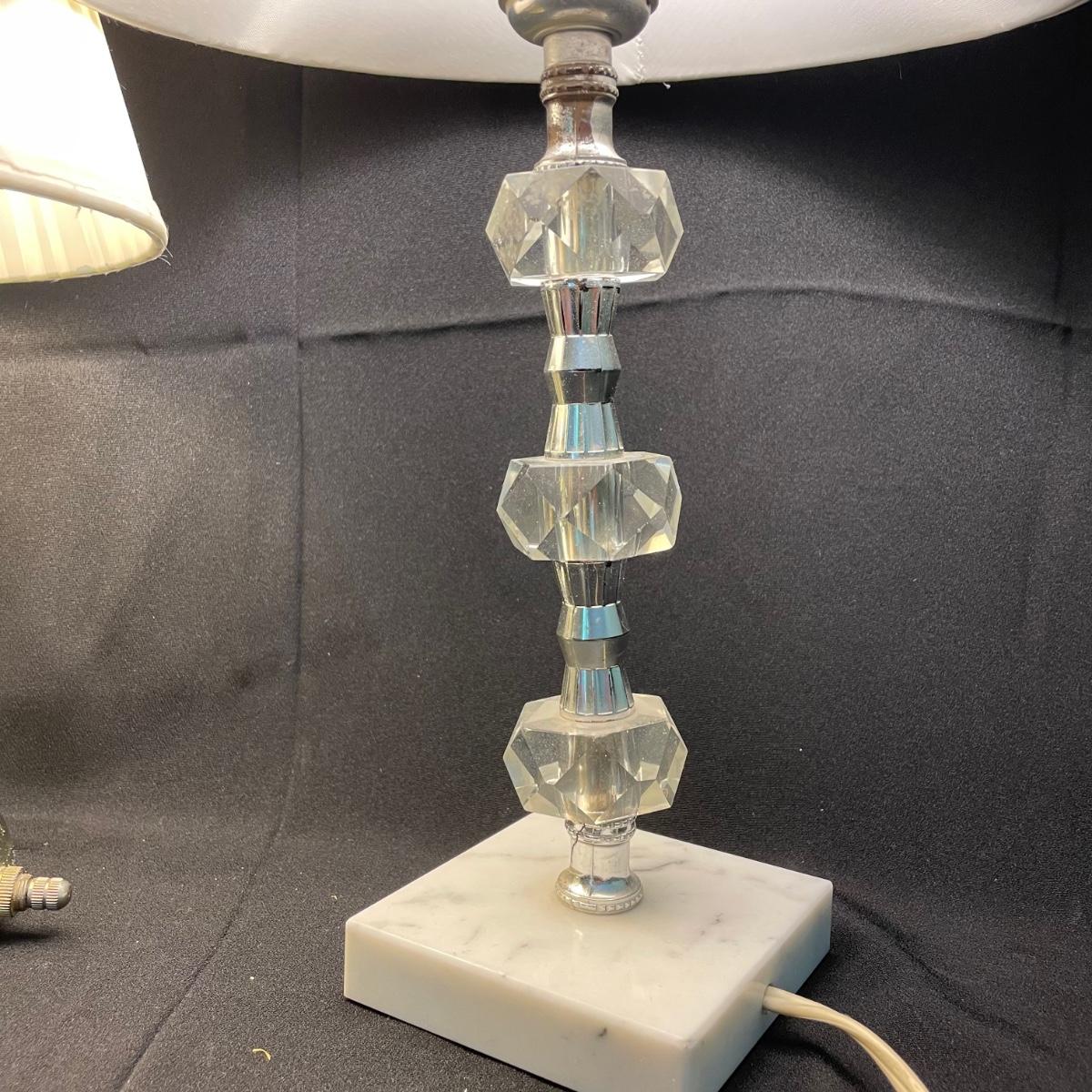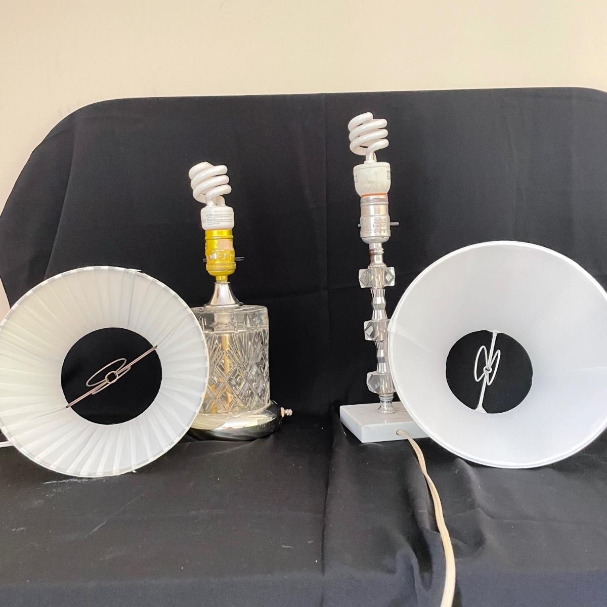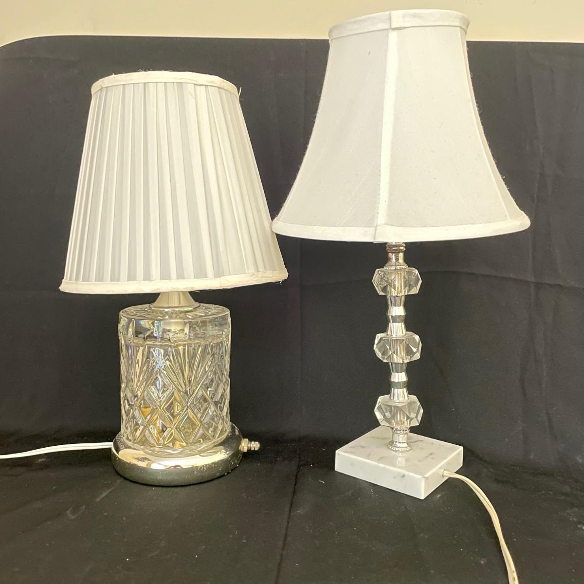 Two lovely glass or crystal lamps. One lamp is alternating glass and silver while the other has a glass “reservoir” that can be lit by the switch on the base. Both lamps have nice shades that fit on the current LEDs.. See images. Local pick up only.