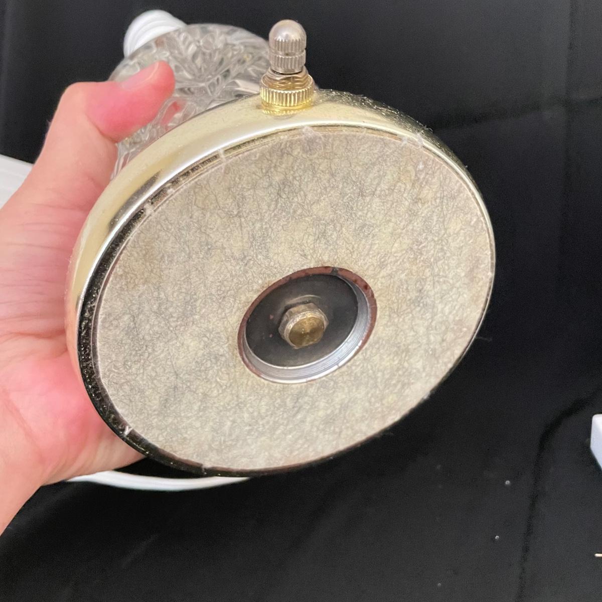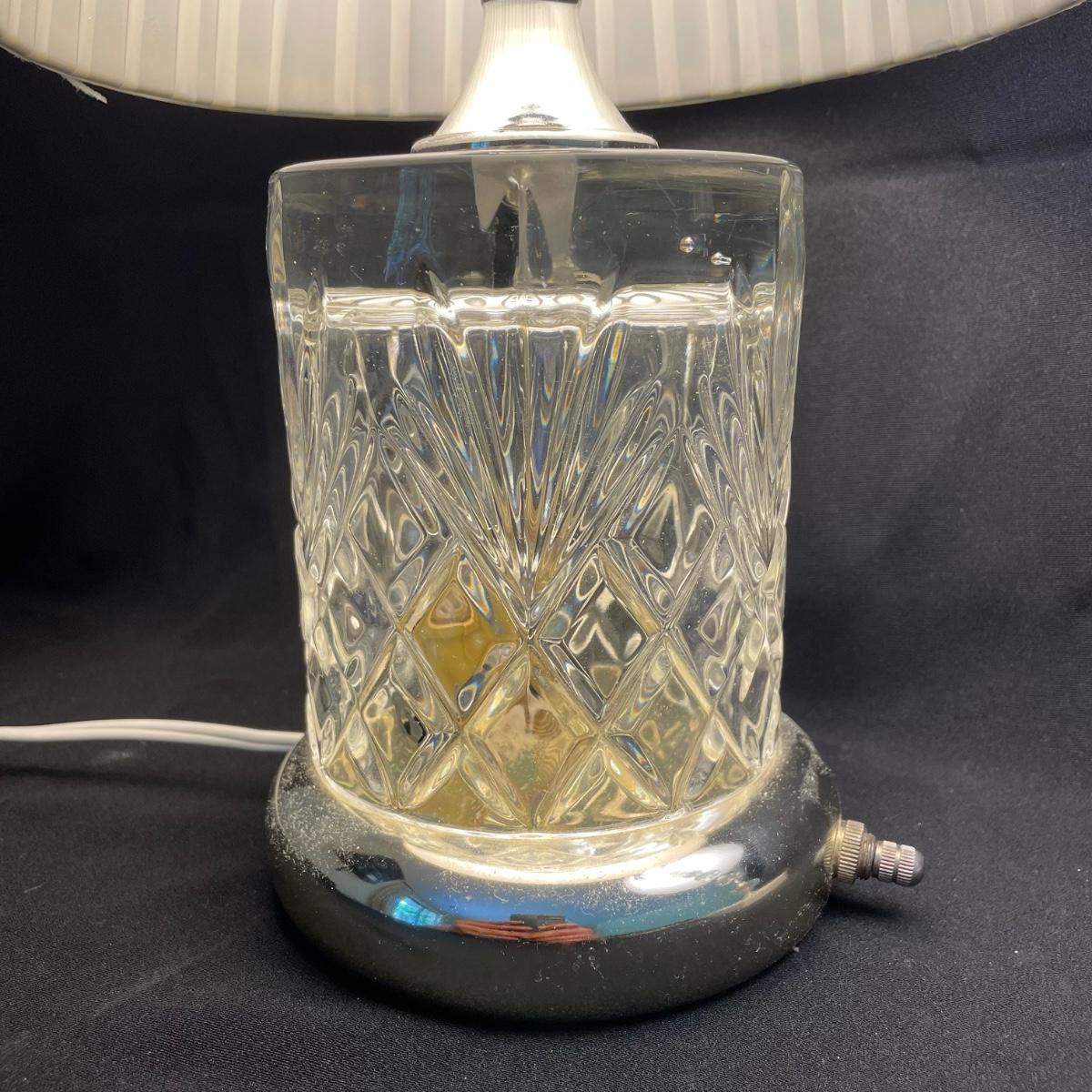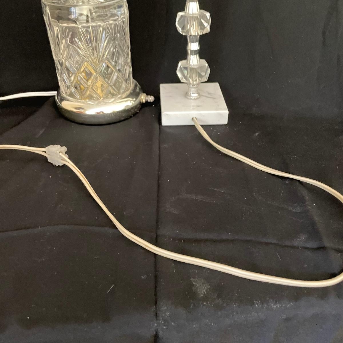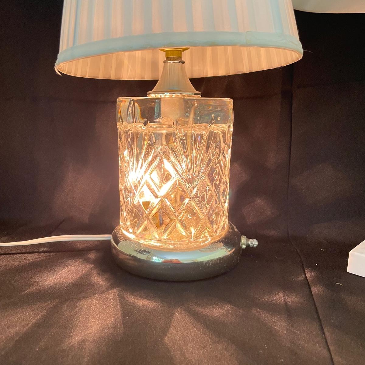 Two lovely glass or crystal lamps. One lamp is alternating glass and silver while the other has a glass “reservoir” that can be lit by the switch on the base. Both lamps have nice shades that fit on the current LEDs.. See images. Local pick up only.
