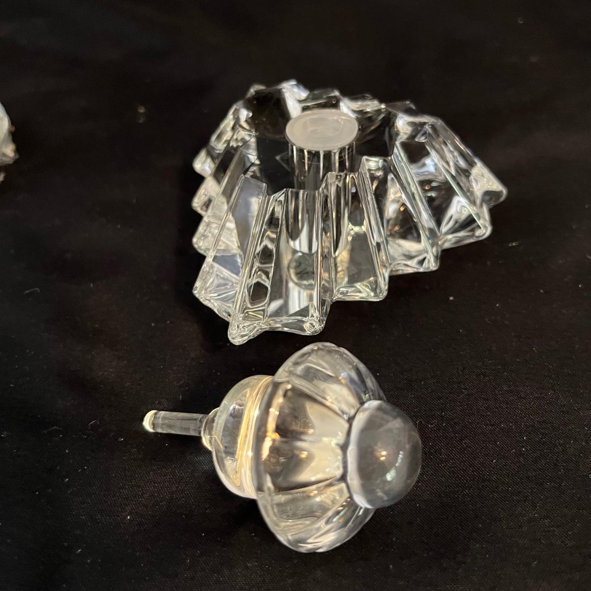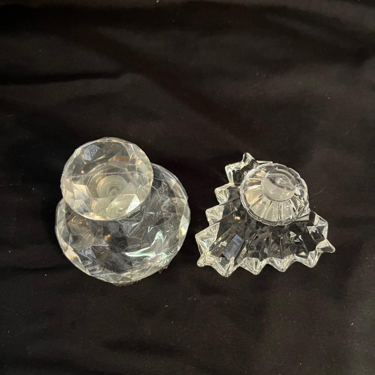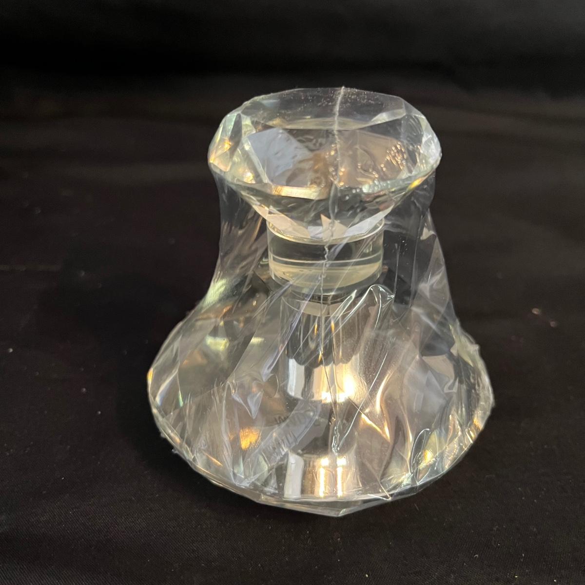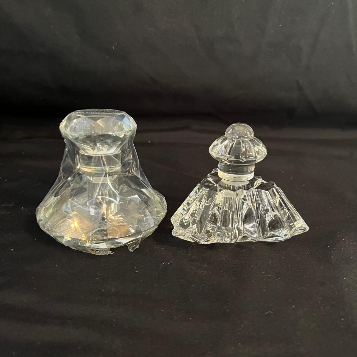 Lot includes one triangle shaped glass perfume bottle with stopper and a circular shaped glass perfume bottle with stopper that measures 3.5” x 3”.