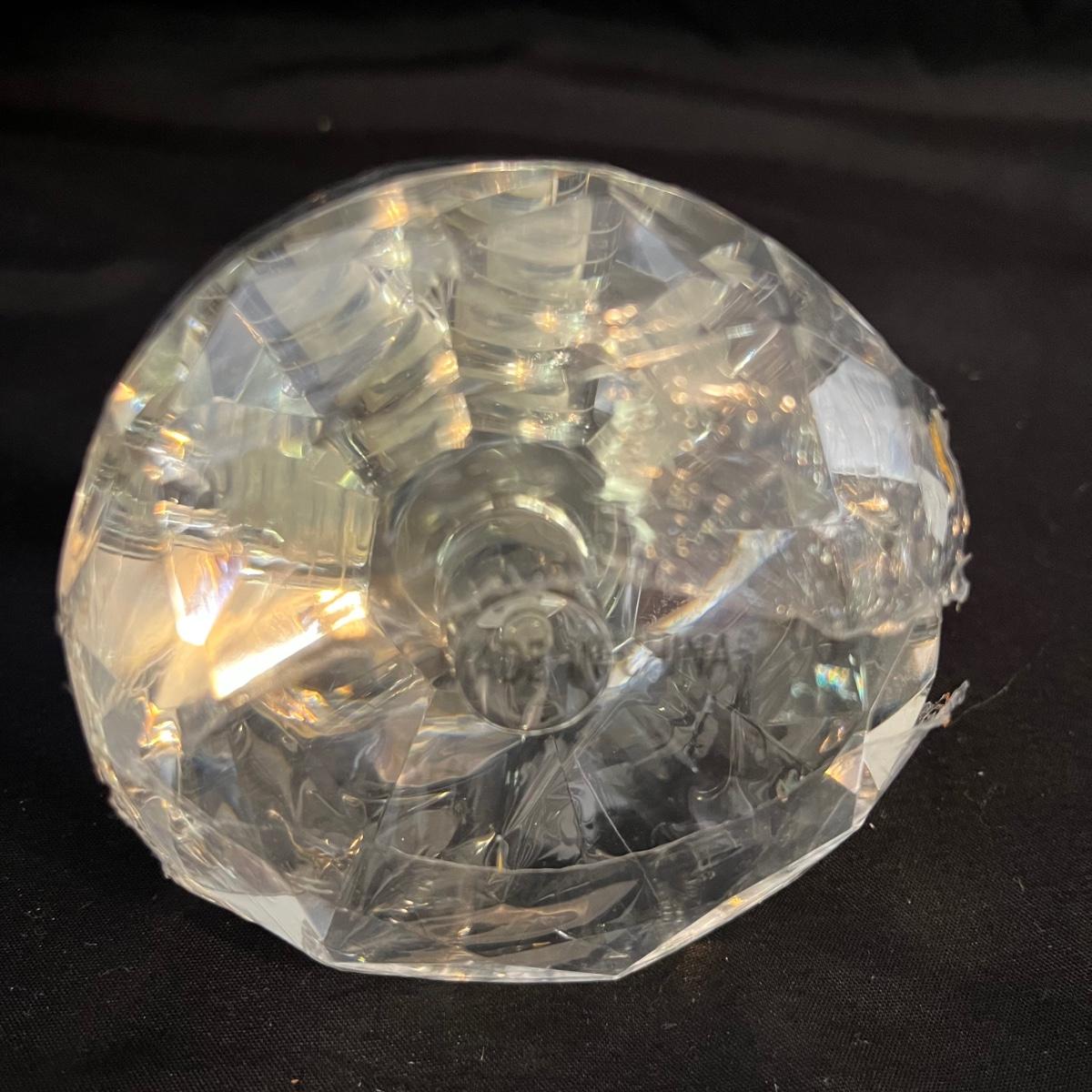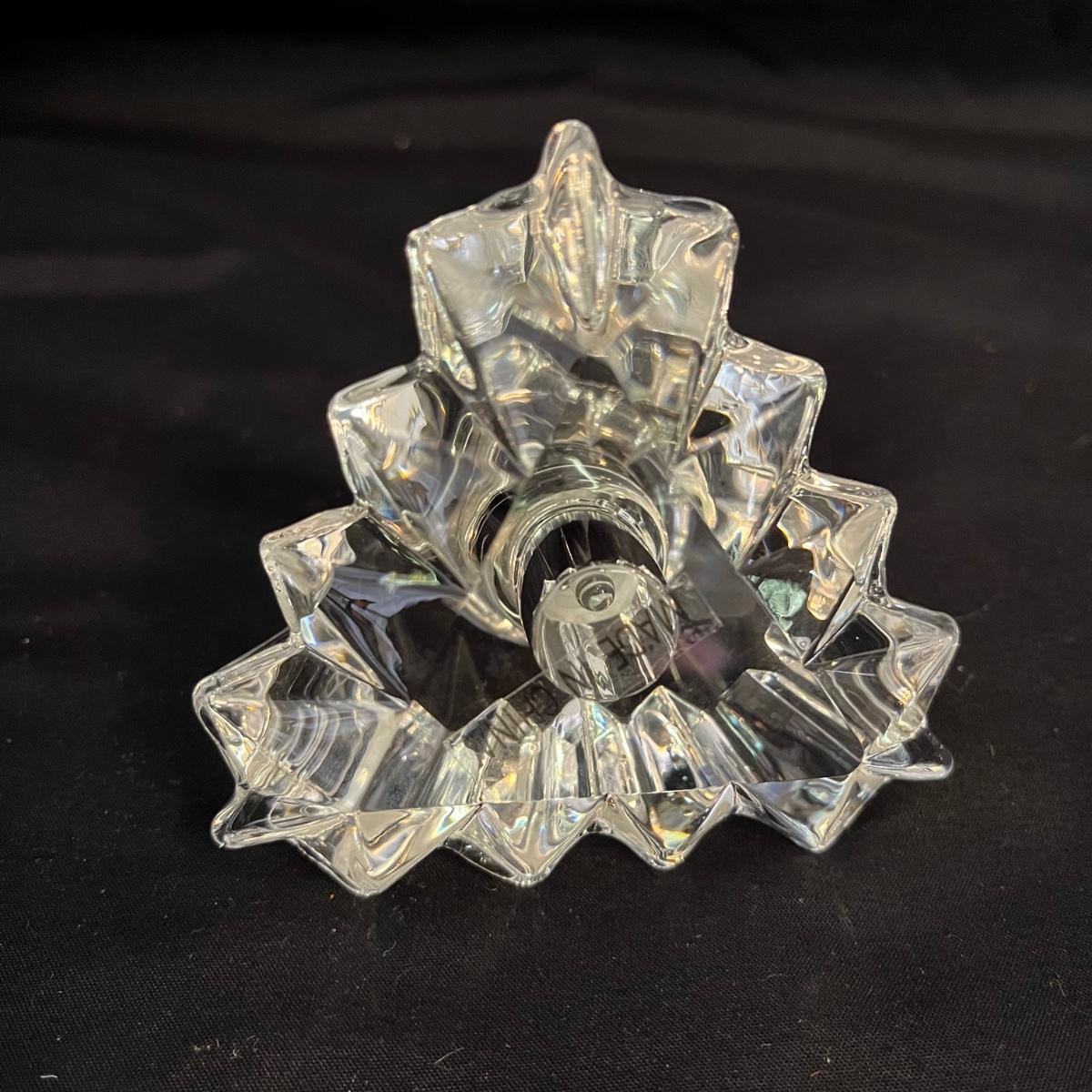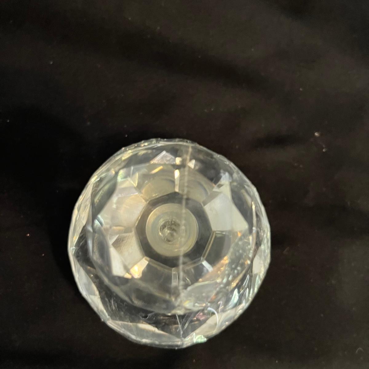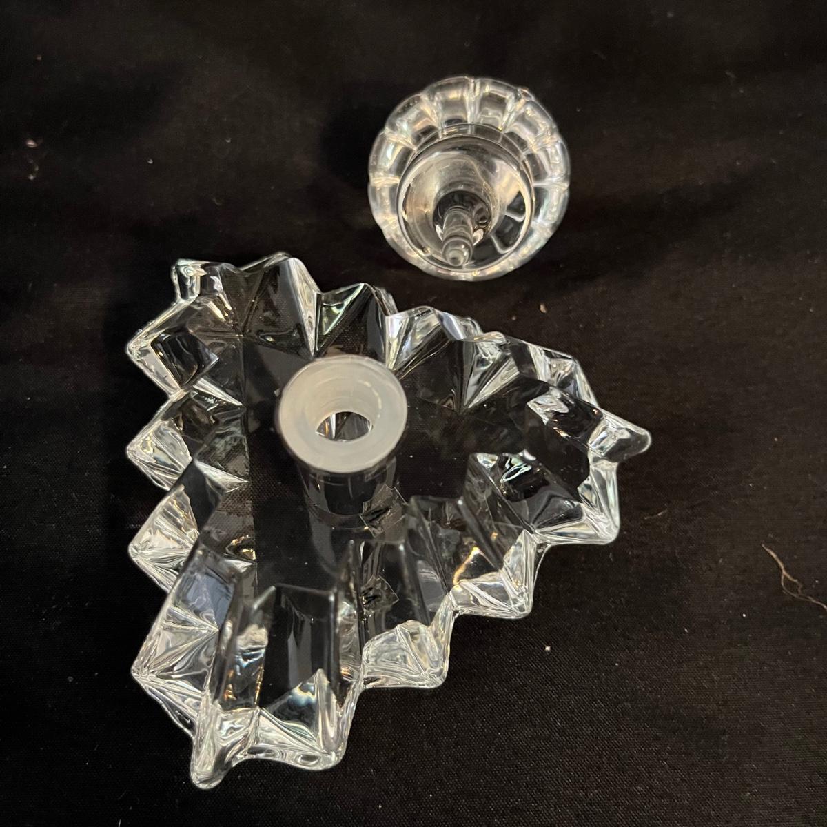 Lot includes one triangle shaped glass perfume bottle with stopper and a circular shaped glass perfume bottle with stopper that measures 3.5” x 3”.
