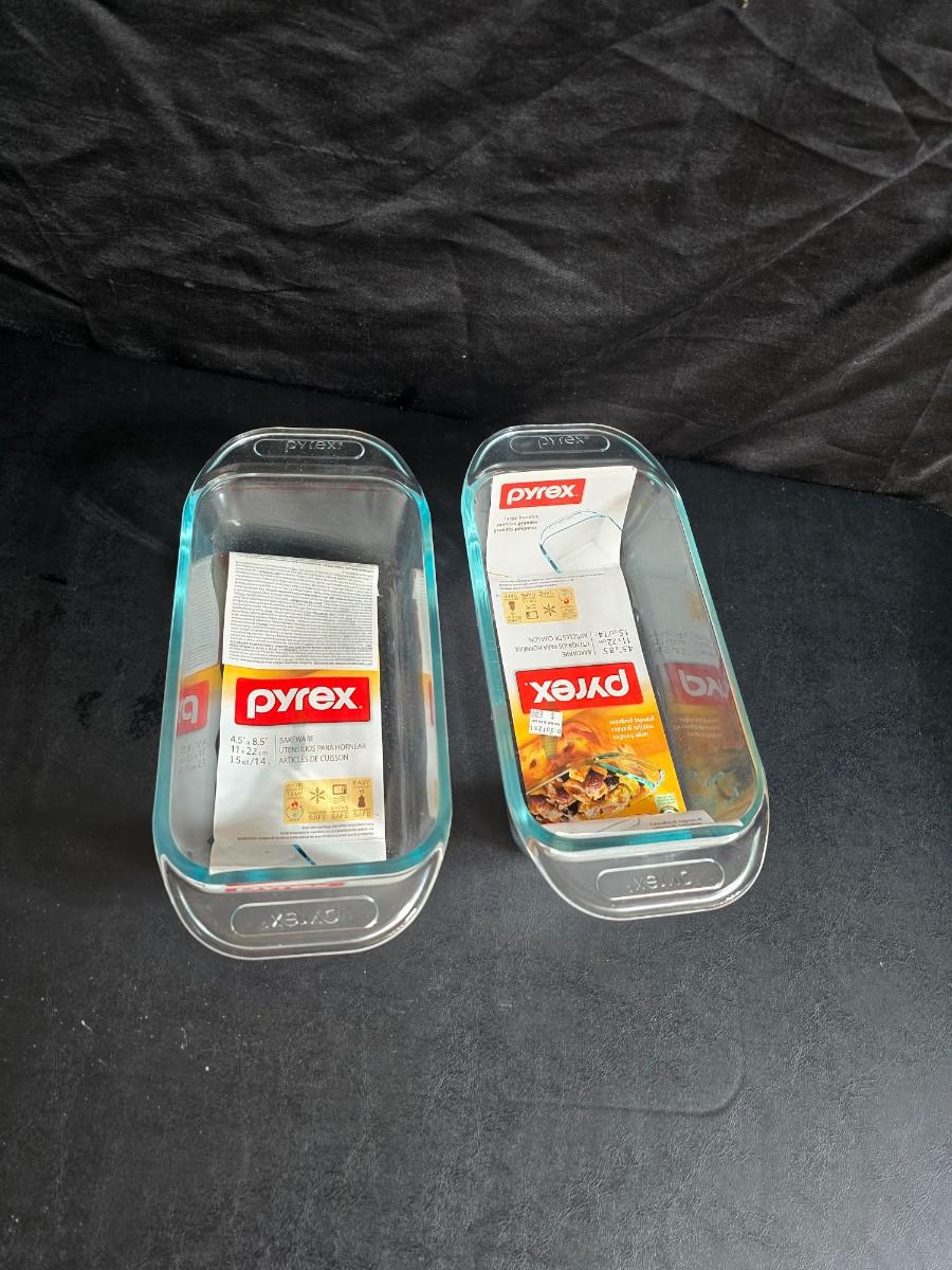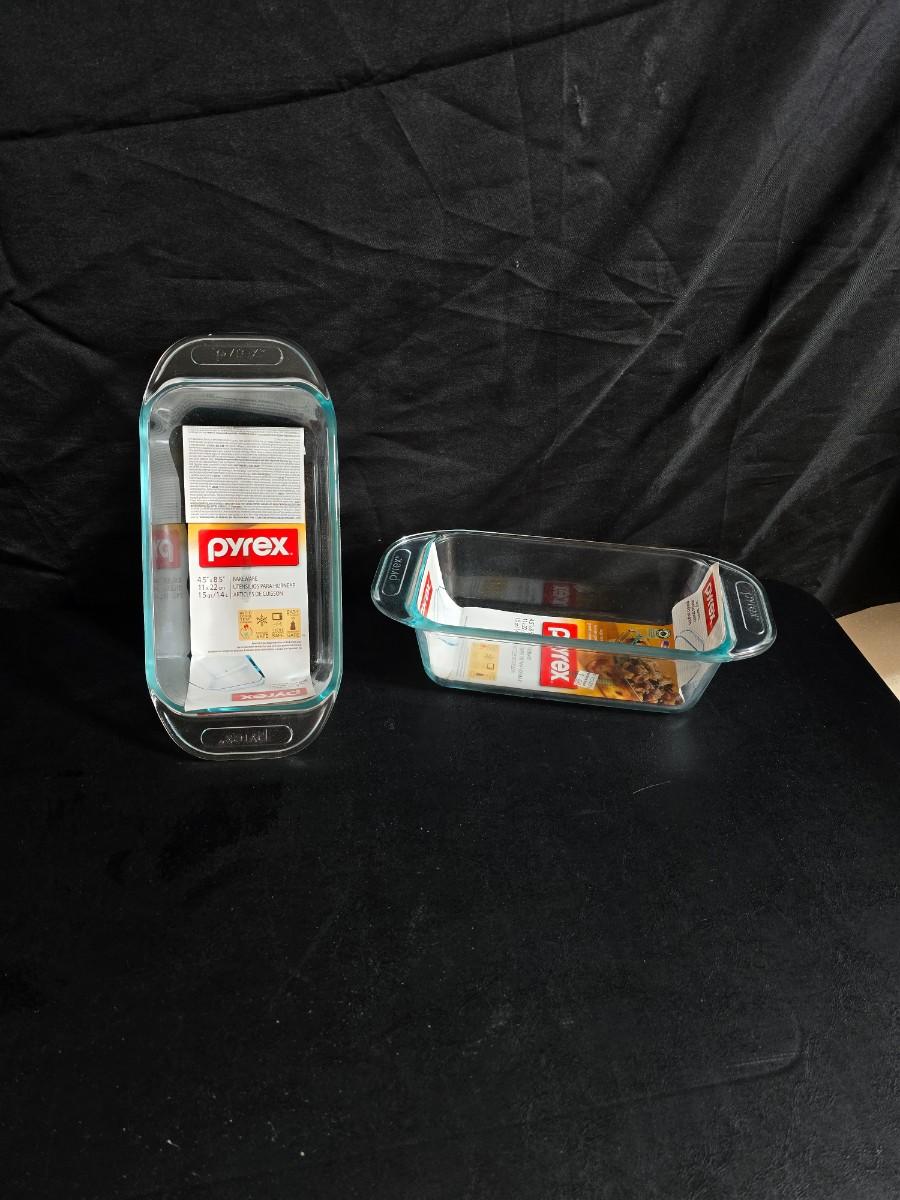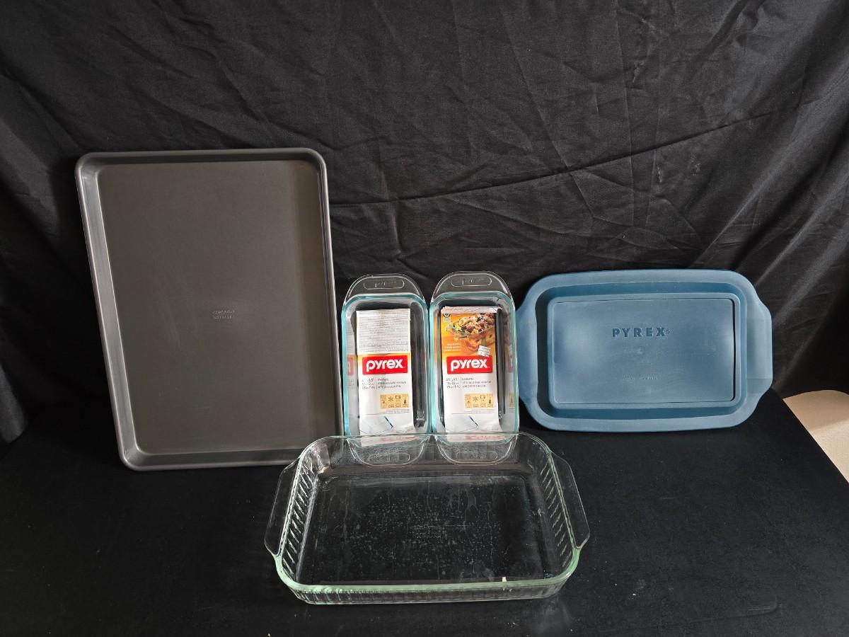 Two glass pyrex cake pans, two new glass Pyrex bread loaf pans and a nice cookie sheet