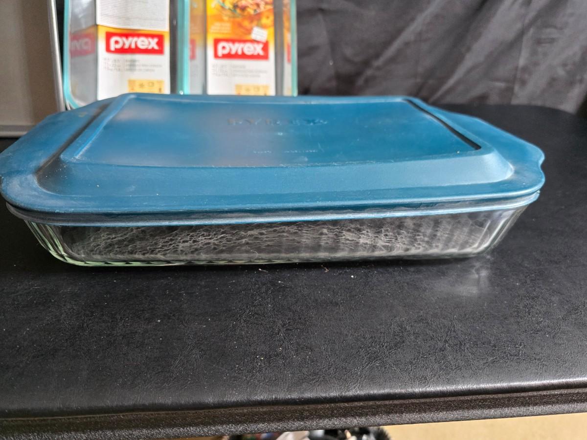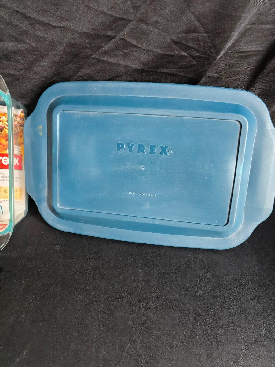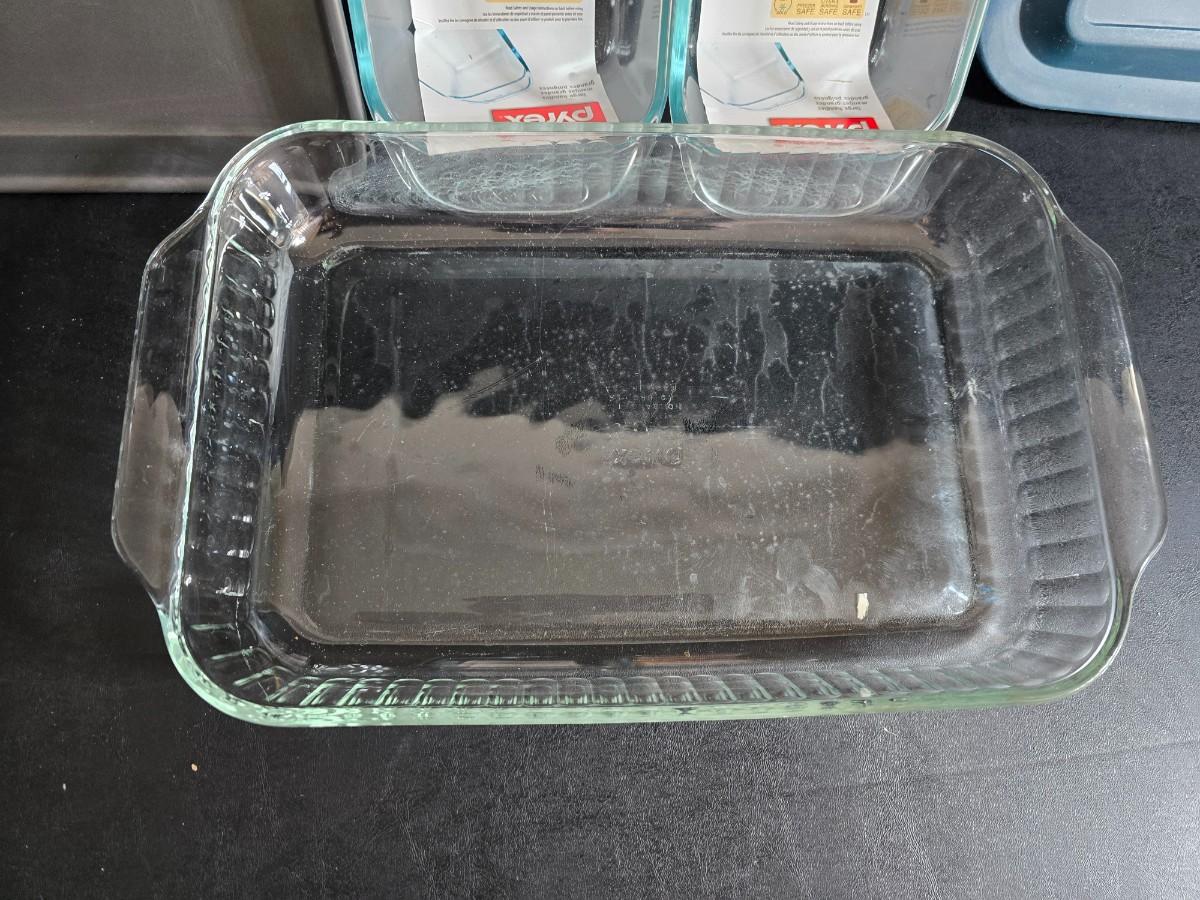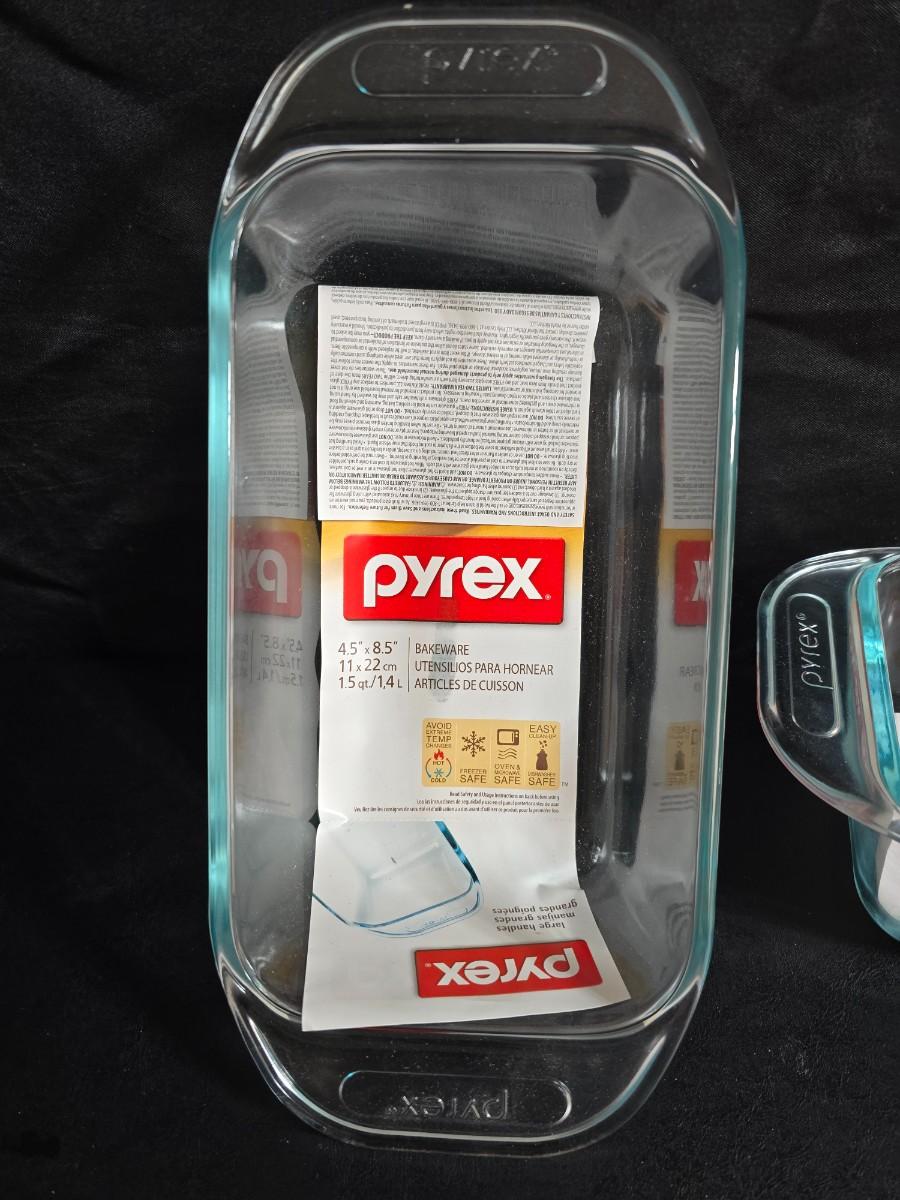 Two glass pyrex cake pans, two new glass Pyrex bread loaf pans and a nice cookie sheet