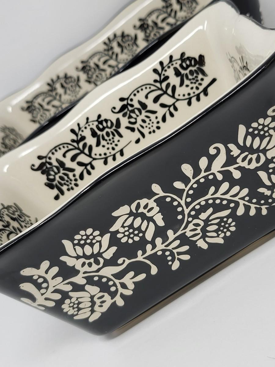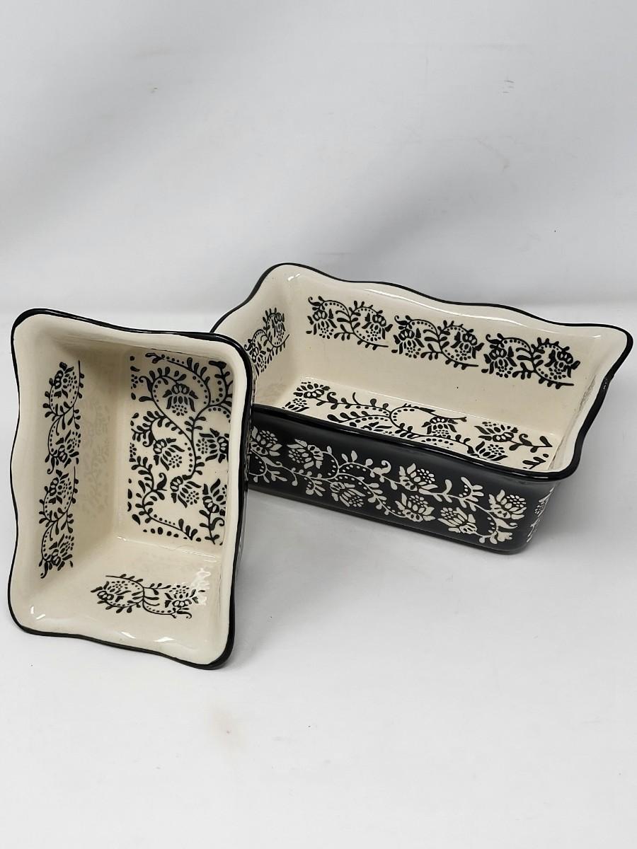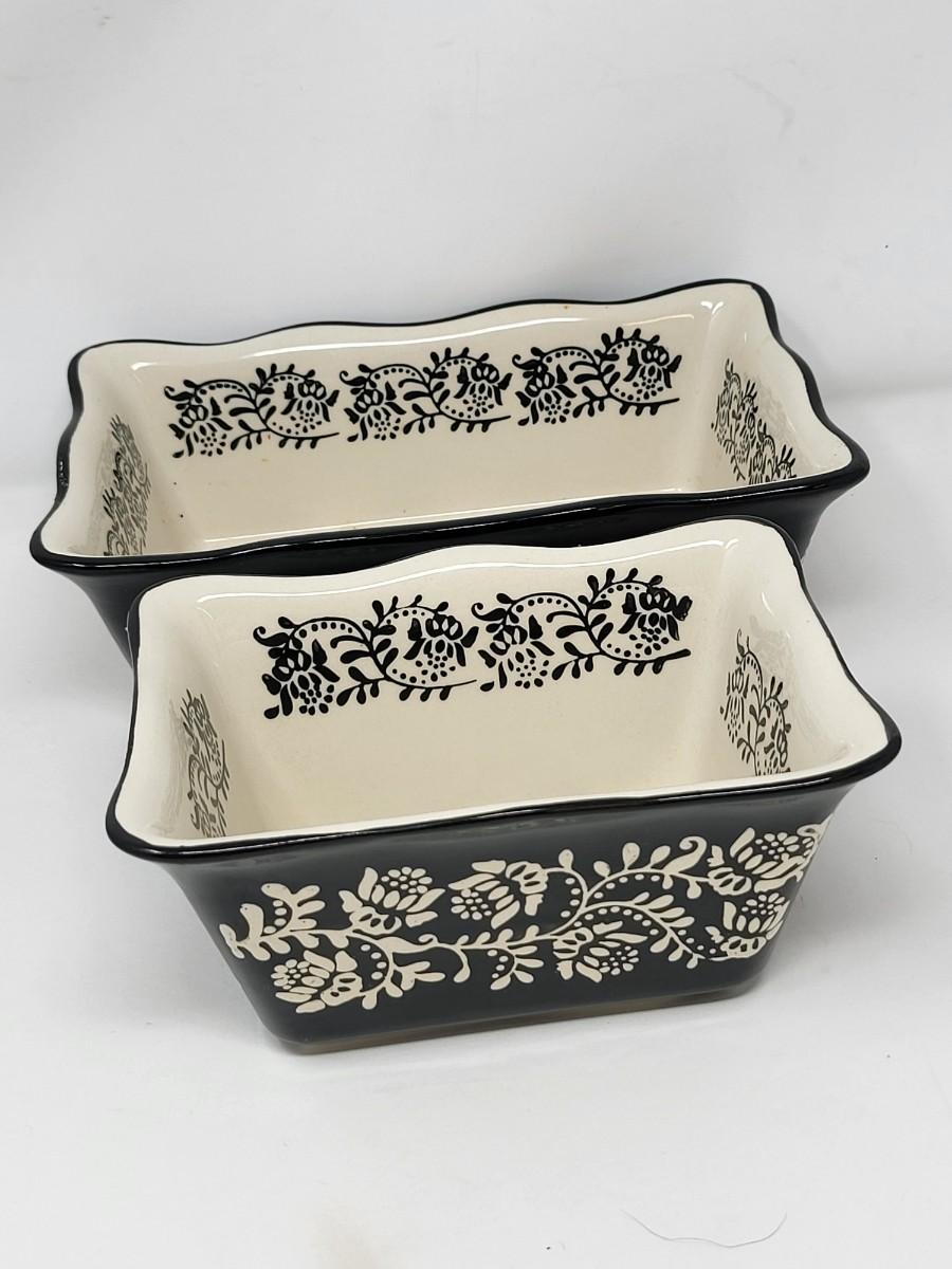 Cream & black paisley floral, scalloped edge, decorated baking/loaf pans, 6" and 9".