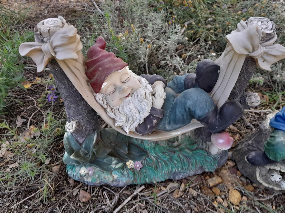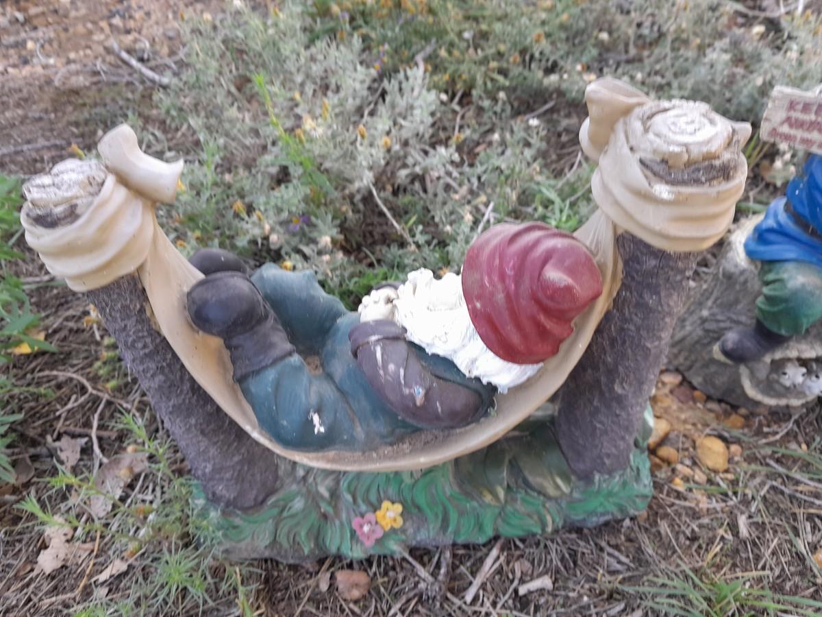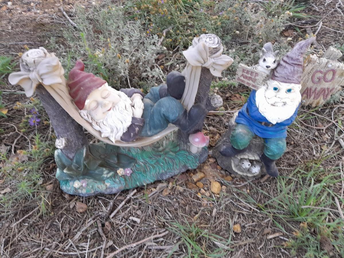 GNOME NAPPING IN A HAMMOCK AND A GO AWAY KEEP AWAY FROM MY NUTS GRUMPY GNOME 11" TALL