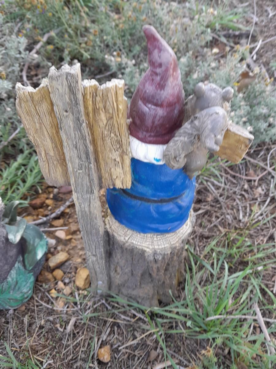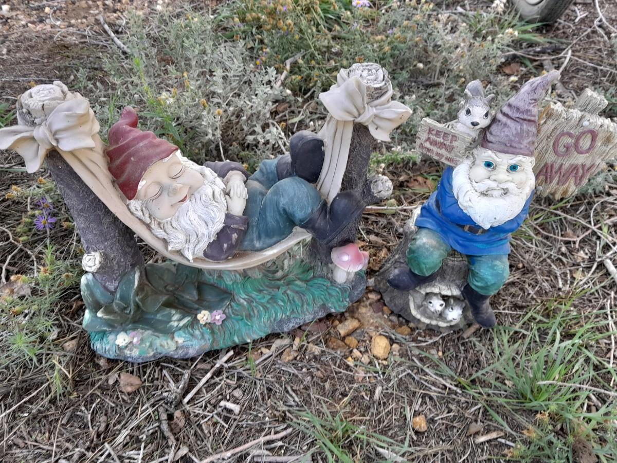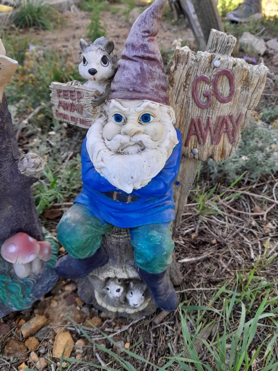 GNOME NAPPING IN A HAMMOCK AND A GO AWAY KEEP AWAY FROM MY NUTS GRUMPY GNOME 11" TALL