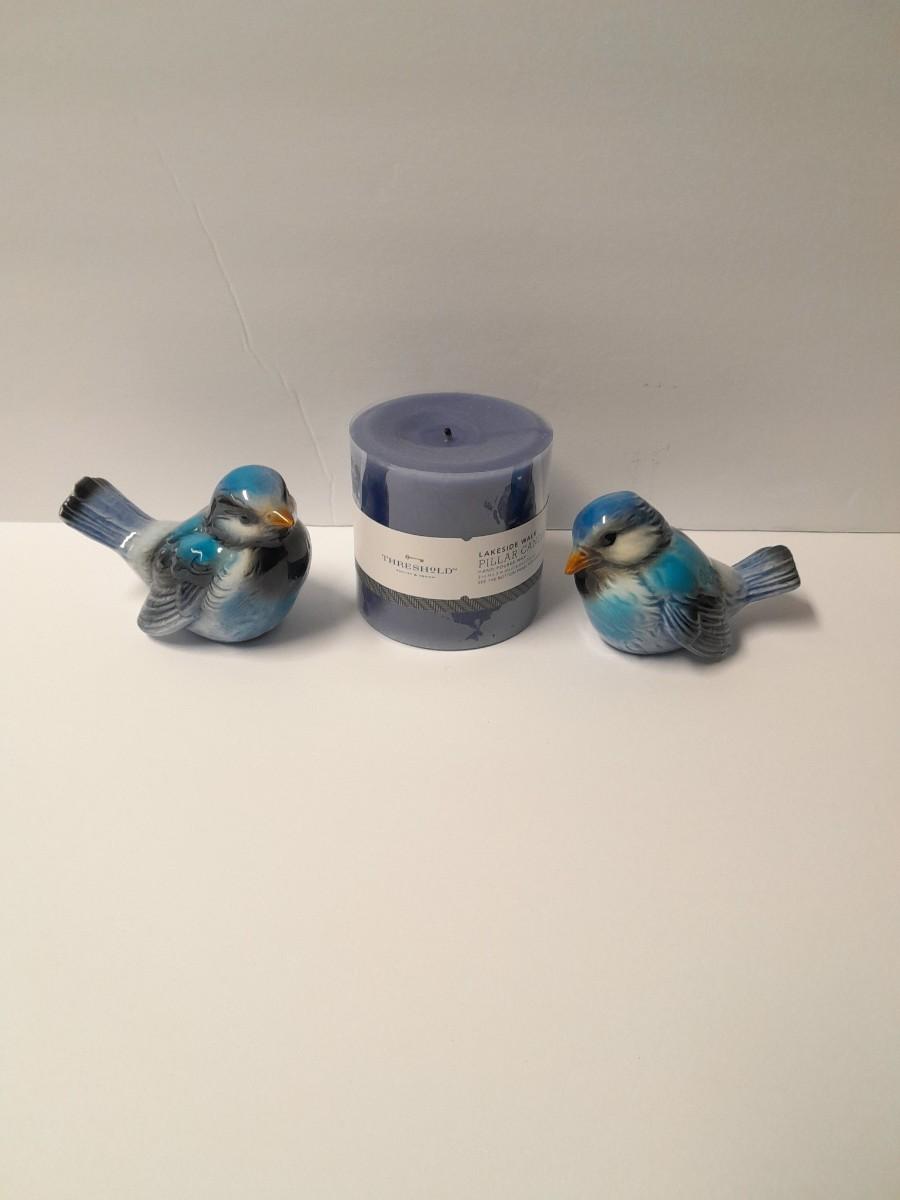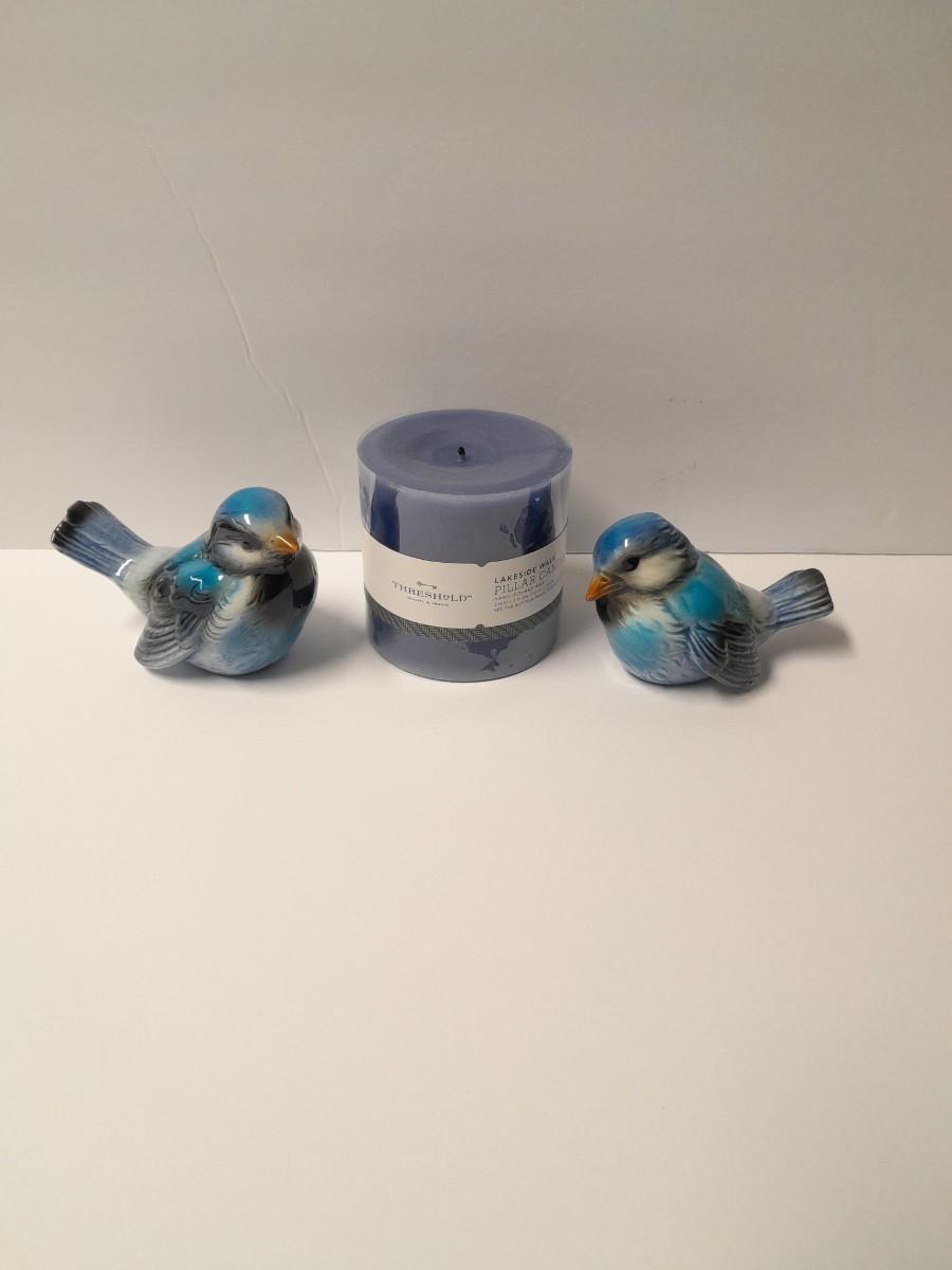 Two Goebel Germany blue birds marked on base, CV73 with a Threshold pillar Lakeside walk Scented candle 3" x 3" hand poured.