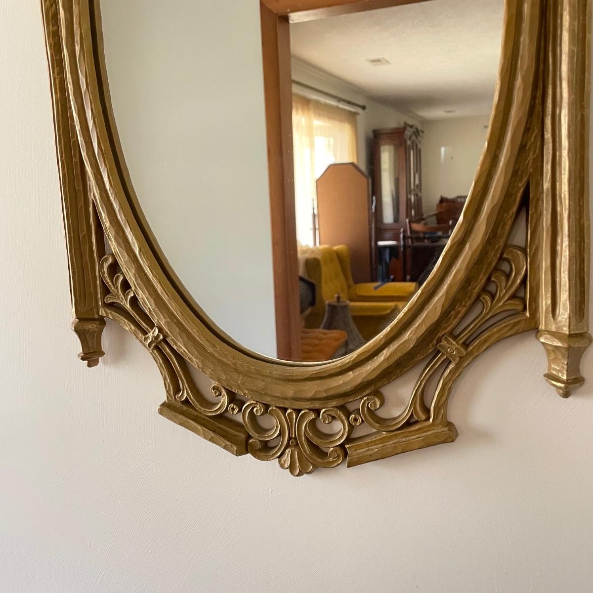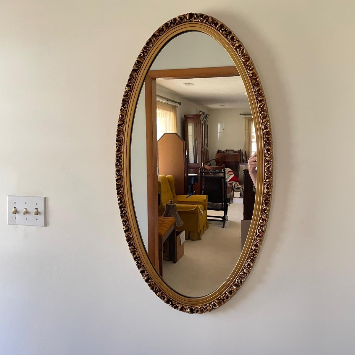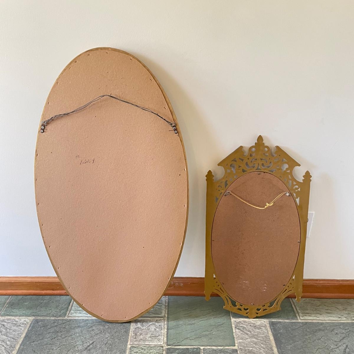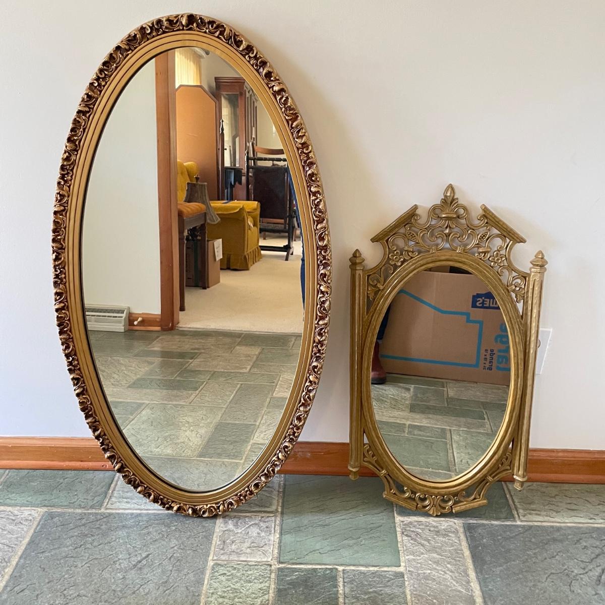 Two gold framed mirrors. They are both heavy given their size. The oval mirror has a gold painted wood frame while the smaller mirror appears to be a high quality resin or plastic. The oval measures 21.5” x 39.5”. The smaller mirror is 14.5” x 28”. Both are in very nice condition. See images. Shipping available. Shipping can be costly. We suggest calling our local UPS with dimensions and getting an estimate before bidding: (828) 252-6930.