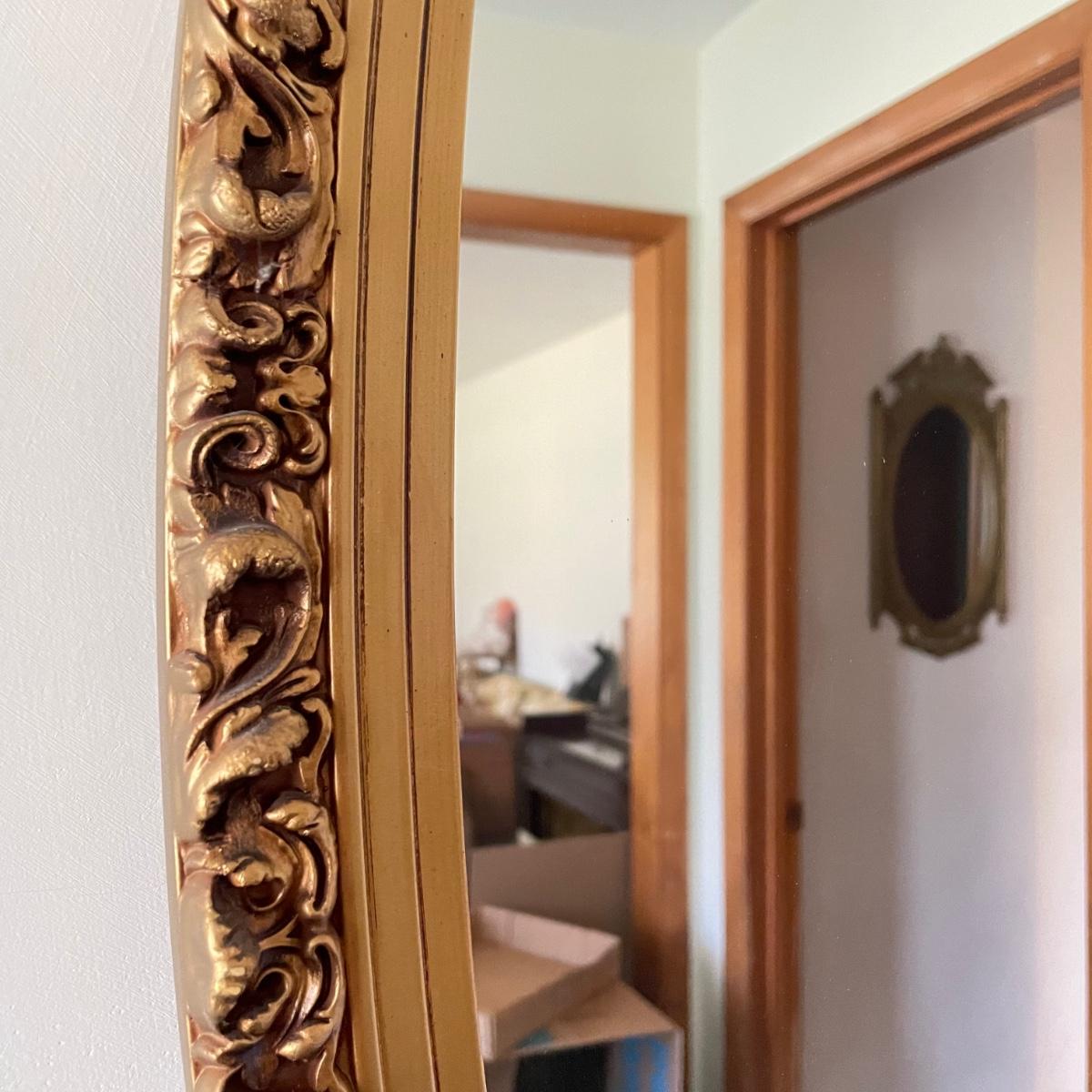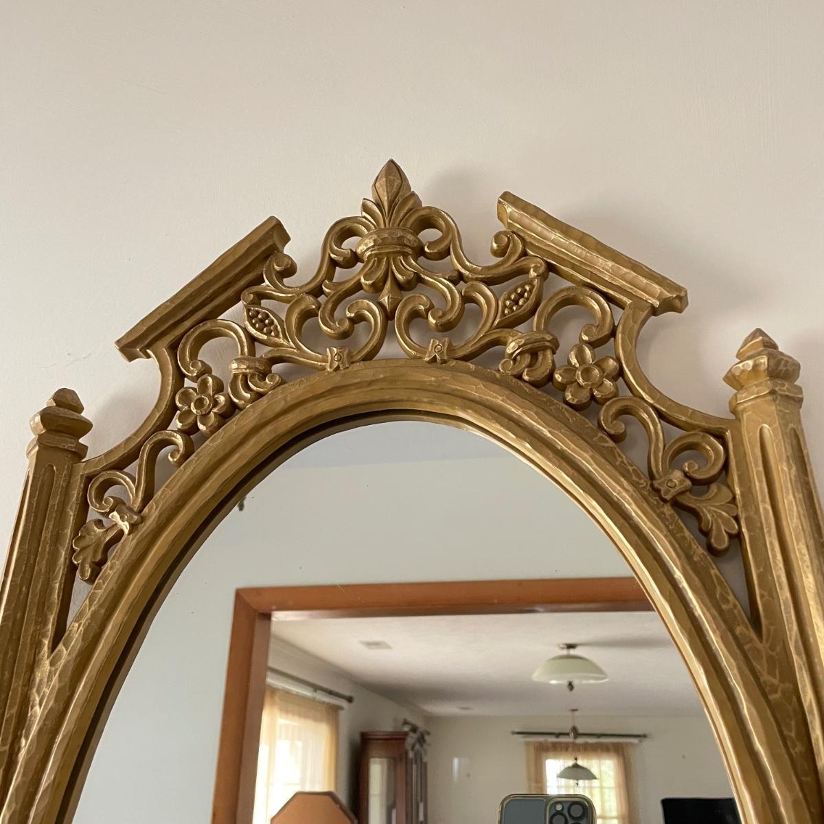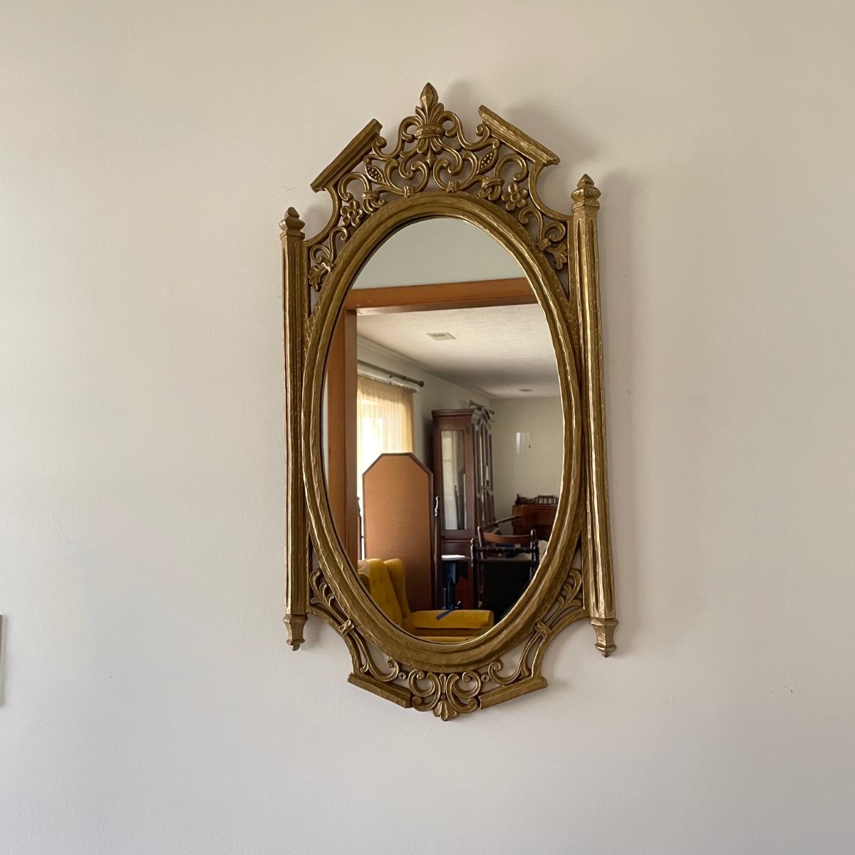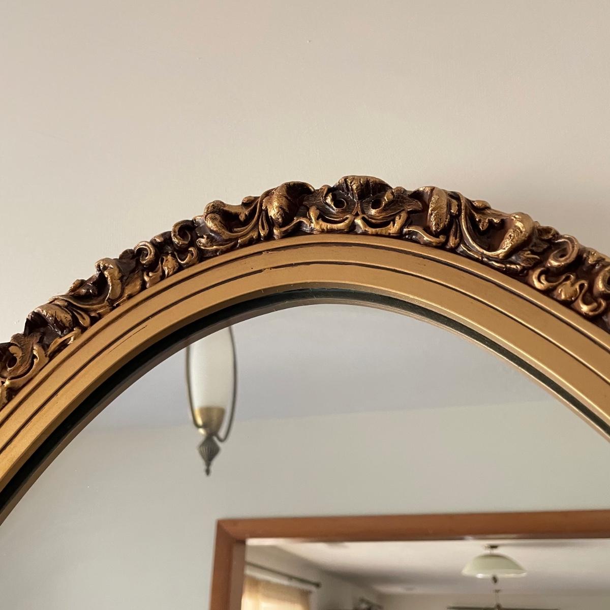 Two gold framed mirrors. They are both heavy given their size. The oval mirror has a gold painted wood frame while the smaller mirror appears to be a high quality resin or plastic. The oval measures 21.5” x 39.5”. The smaller mirror is 14.5” x 28”. Both are in very nice condition. See images. Shipping available. Shipping can be costly. We suggest calling our local UPS with dimensions and getting an estimate before bidding: (828) 252-6930.