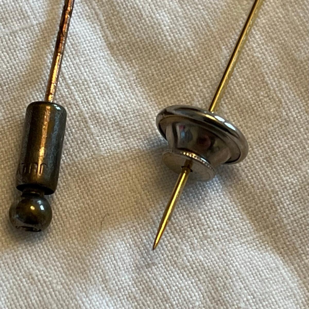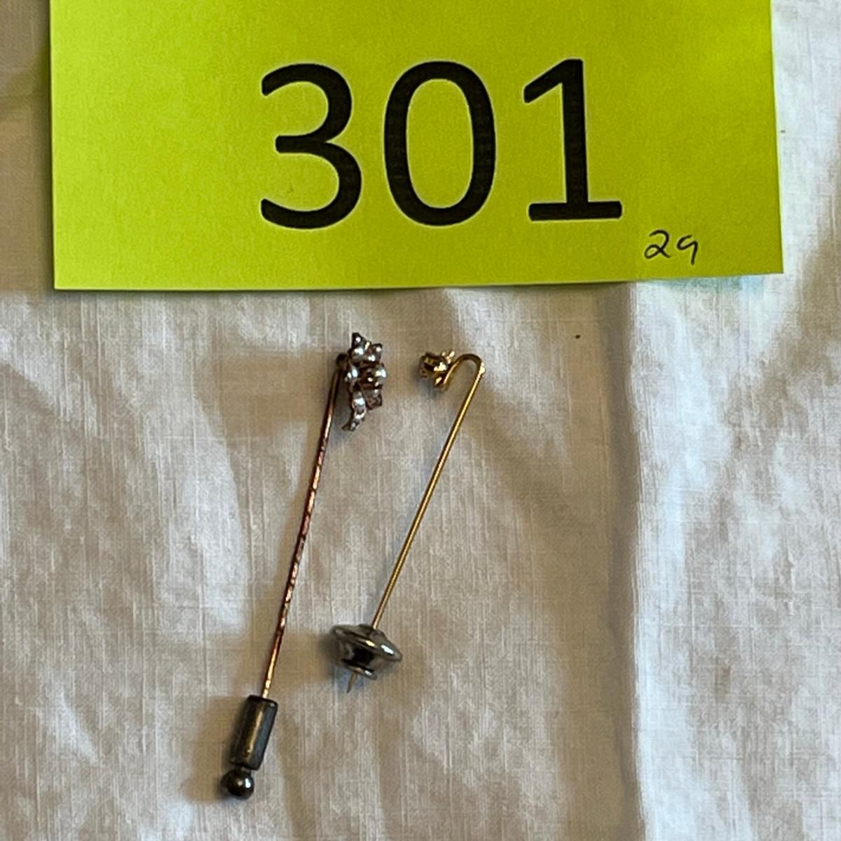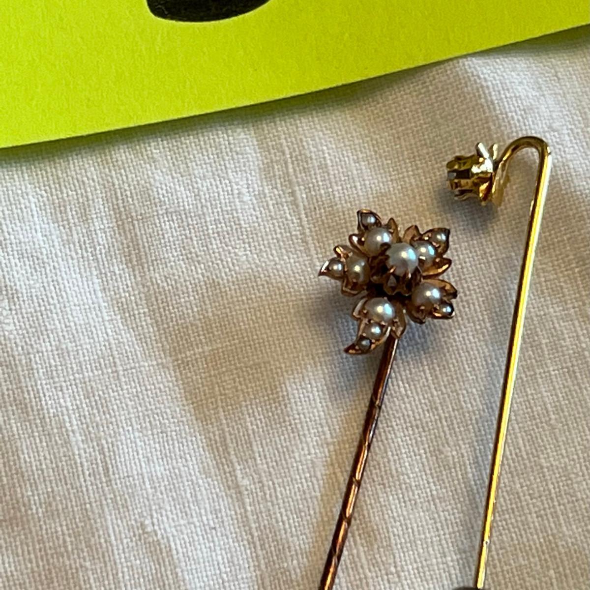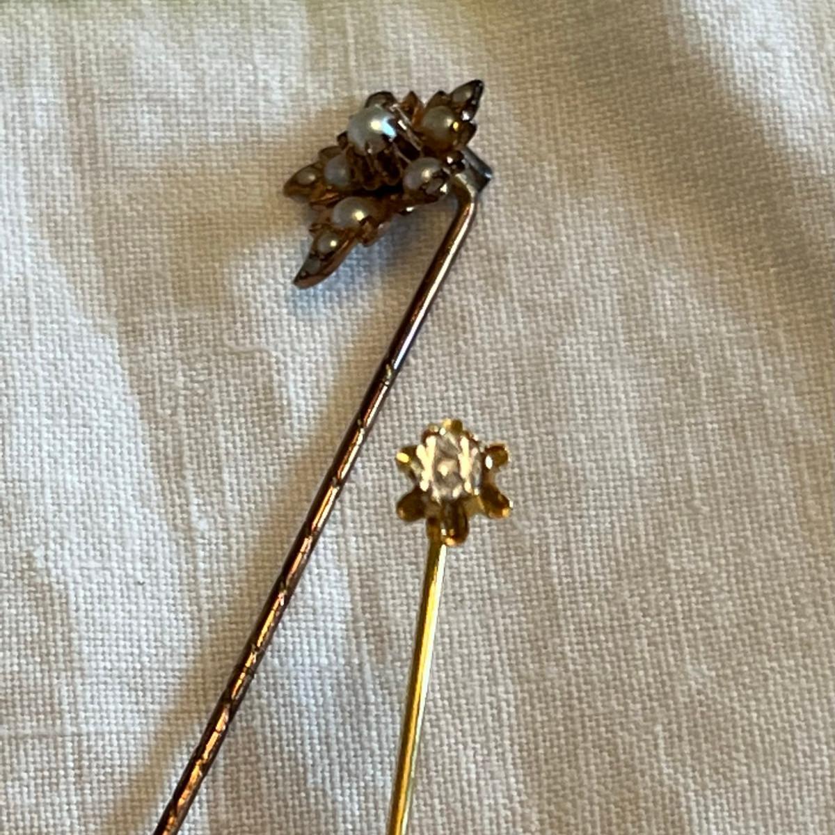 2 grams total weight (pin seals not included). The leaf clusters with seed pearls is marked 10K, the diamond one does not show a mark. 2 grams total weight.