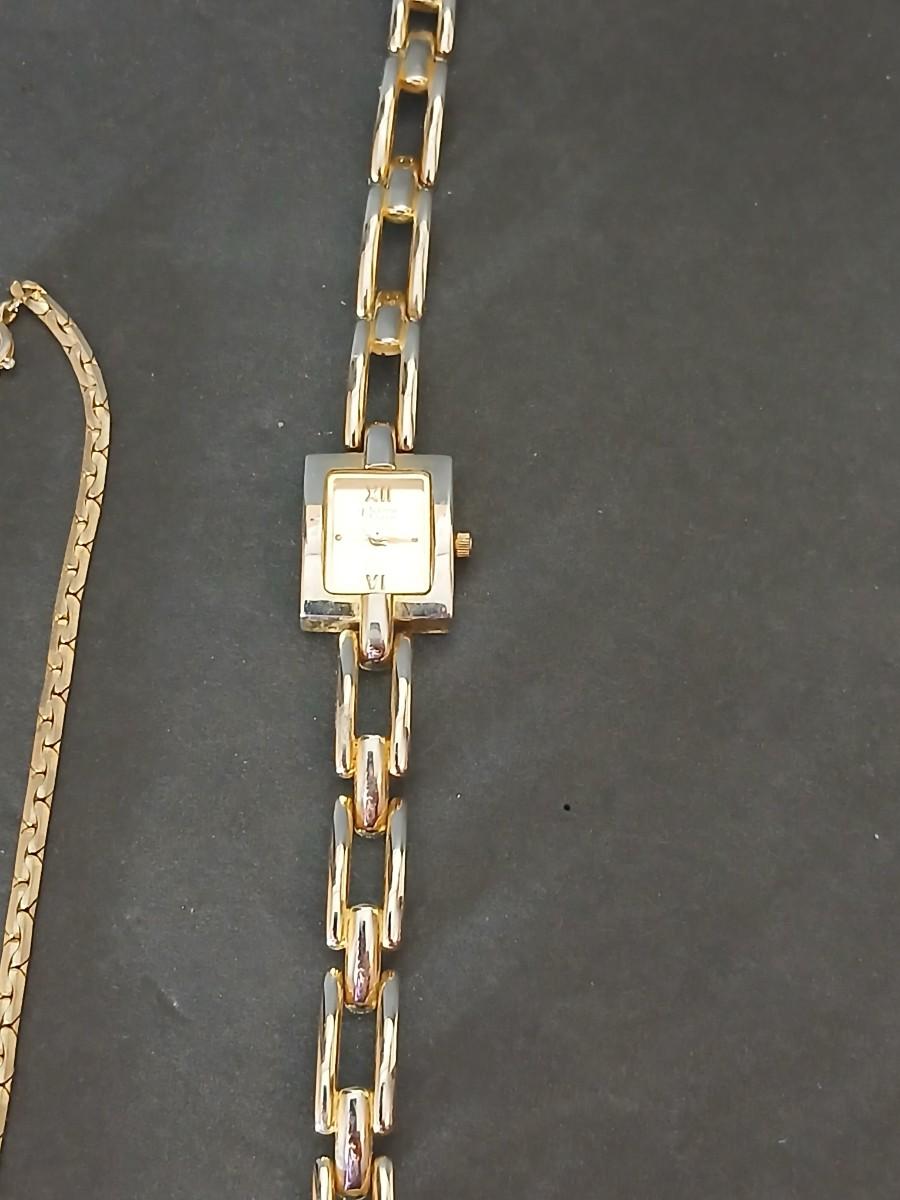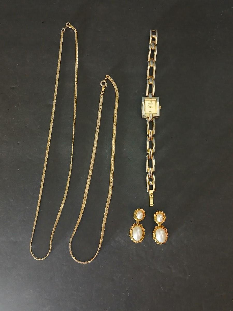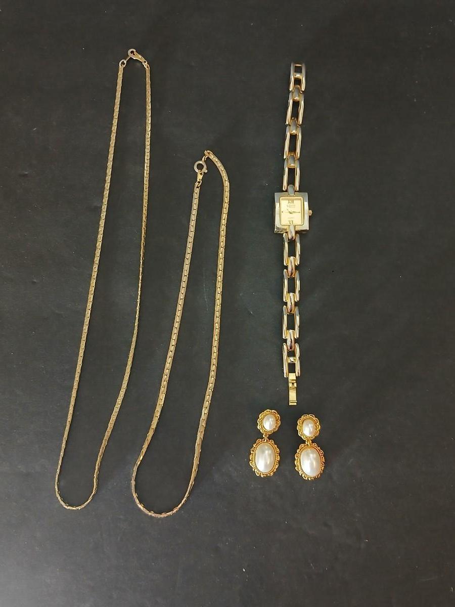 Two gold tone necklaces a pair of earrings and a vintage Victoria Rhein quartz watch