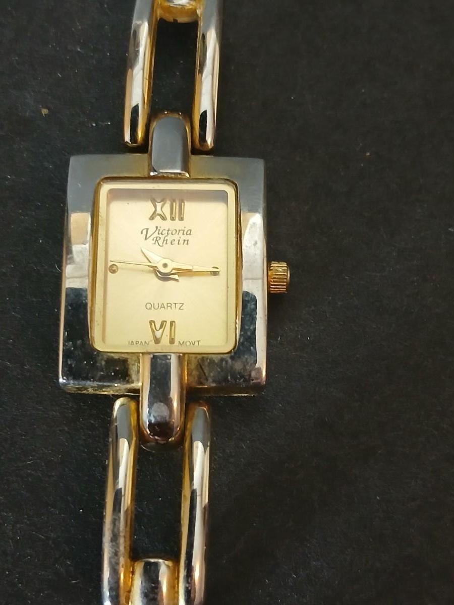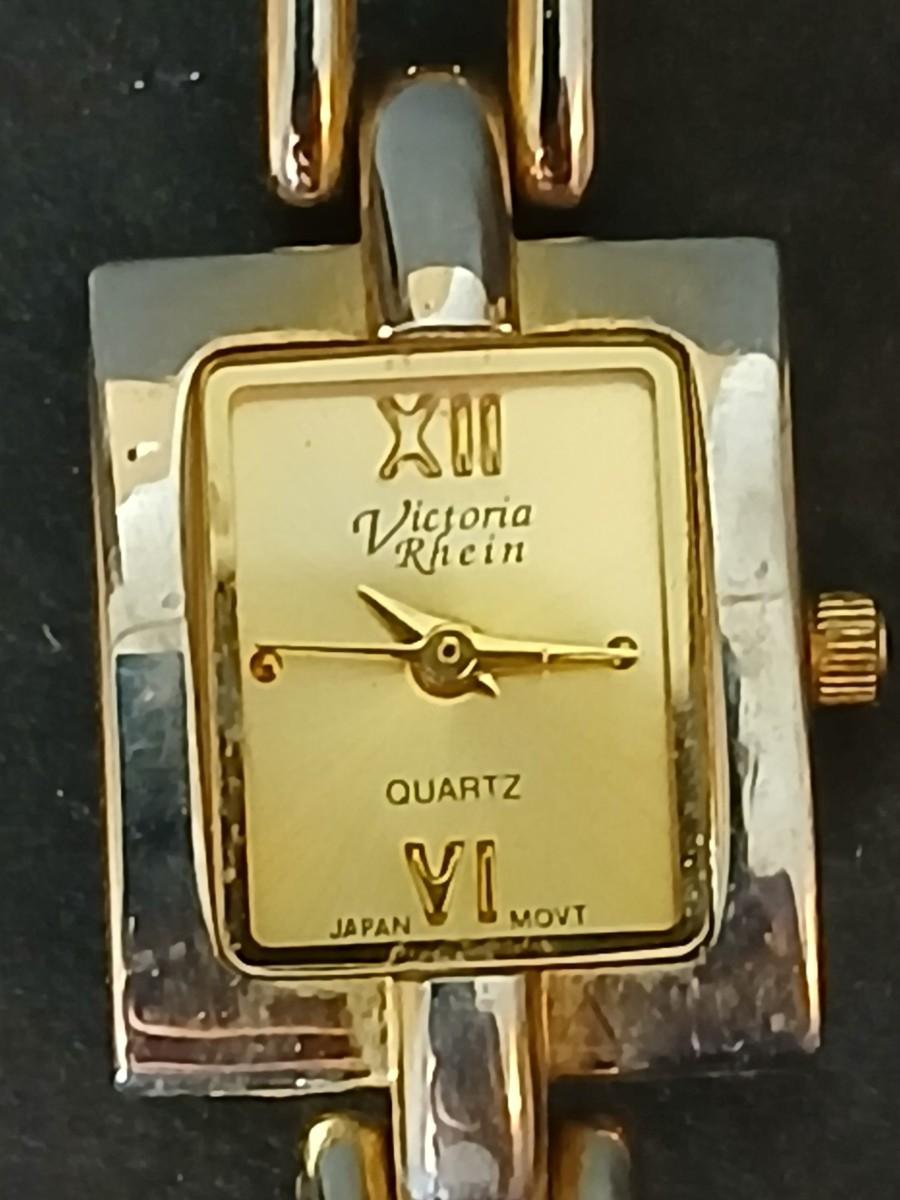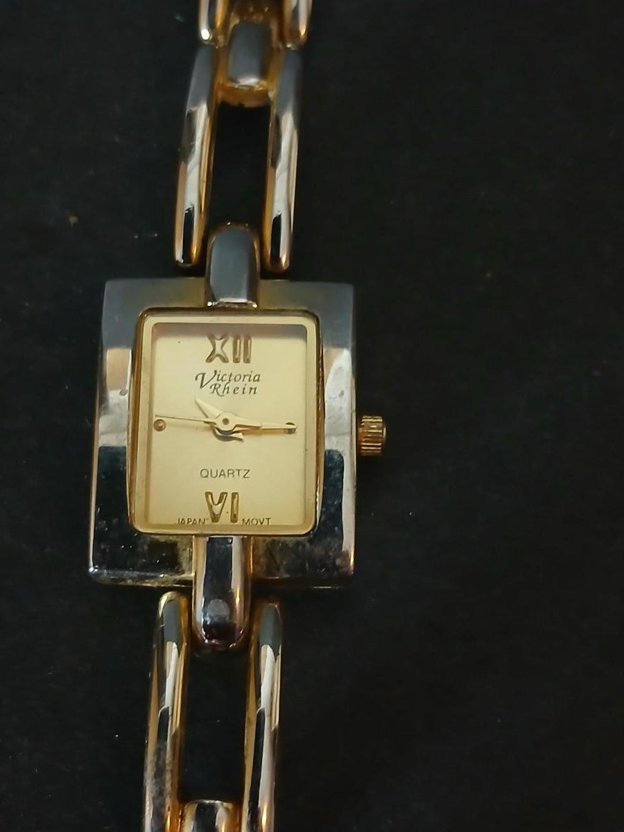 Two gold tone necklaces a pair of earrings and a vintage Victoria Rhein quartz watch