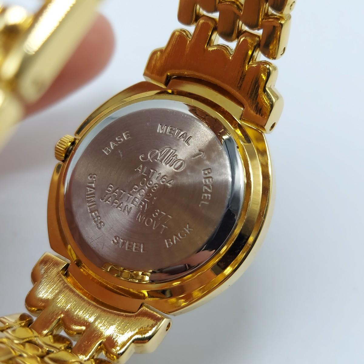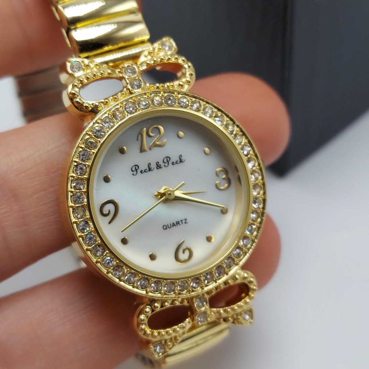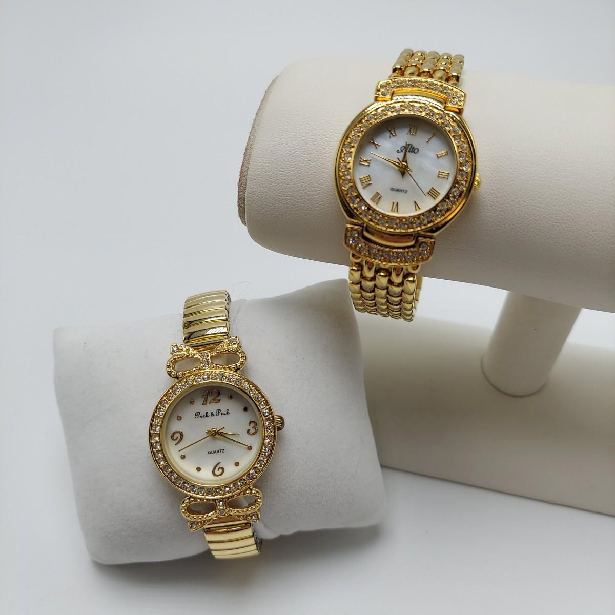 Lot includes two gold tone Quartz watches with rhinestone accents. The Peck & Peck watch has a stretch band and comes in the original box. The Alto watch has a clasped band. Both watches appear to need the batteries replaced. Please see photos for all markings found. All sales are final. No returns or refunds. Please bid accordingly.