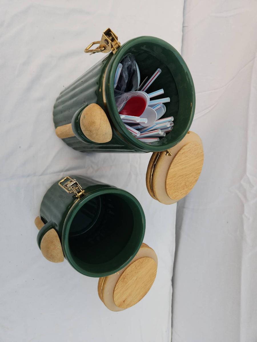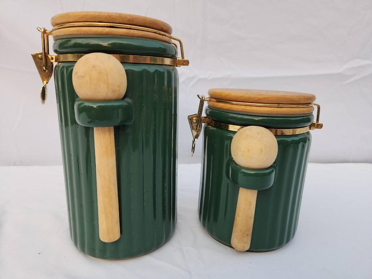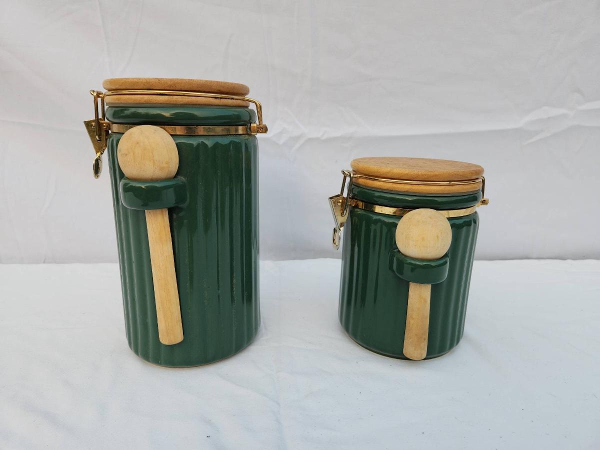Two Green Ribbed Ceramic Canisters with Wooden Lids and Spoons