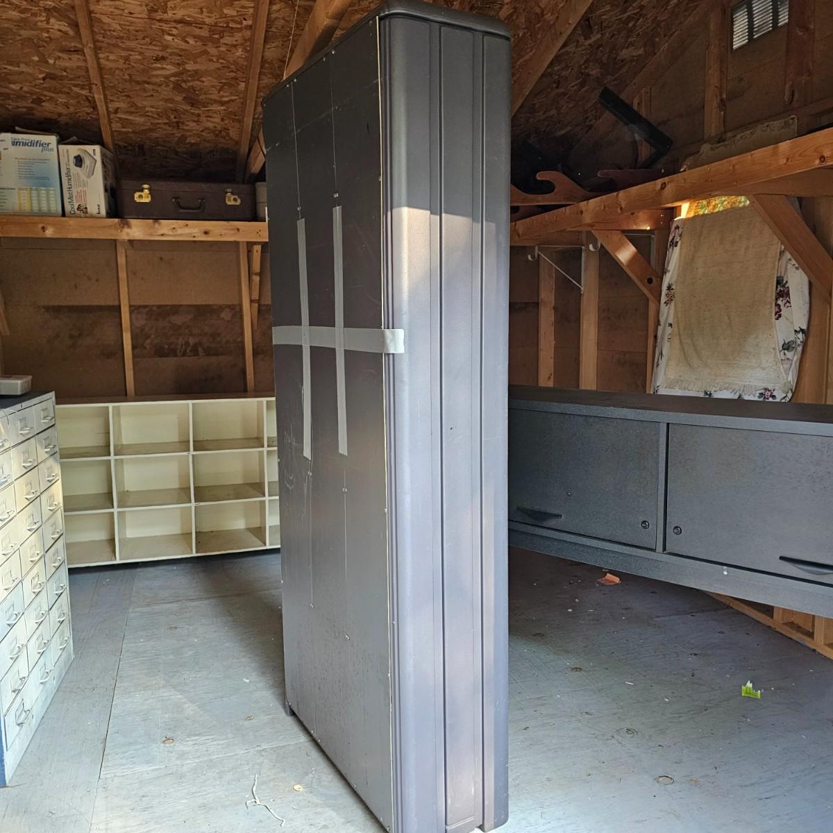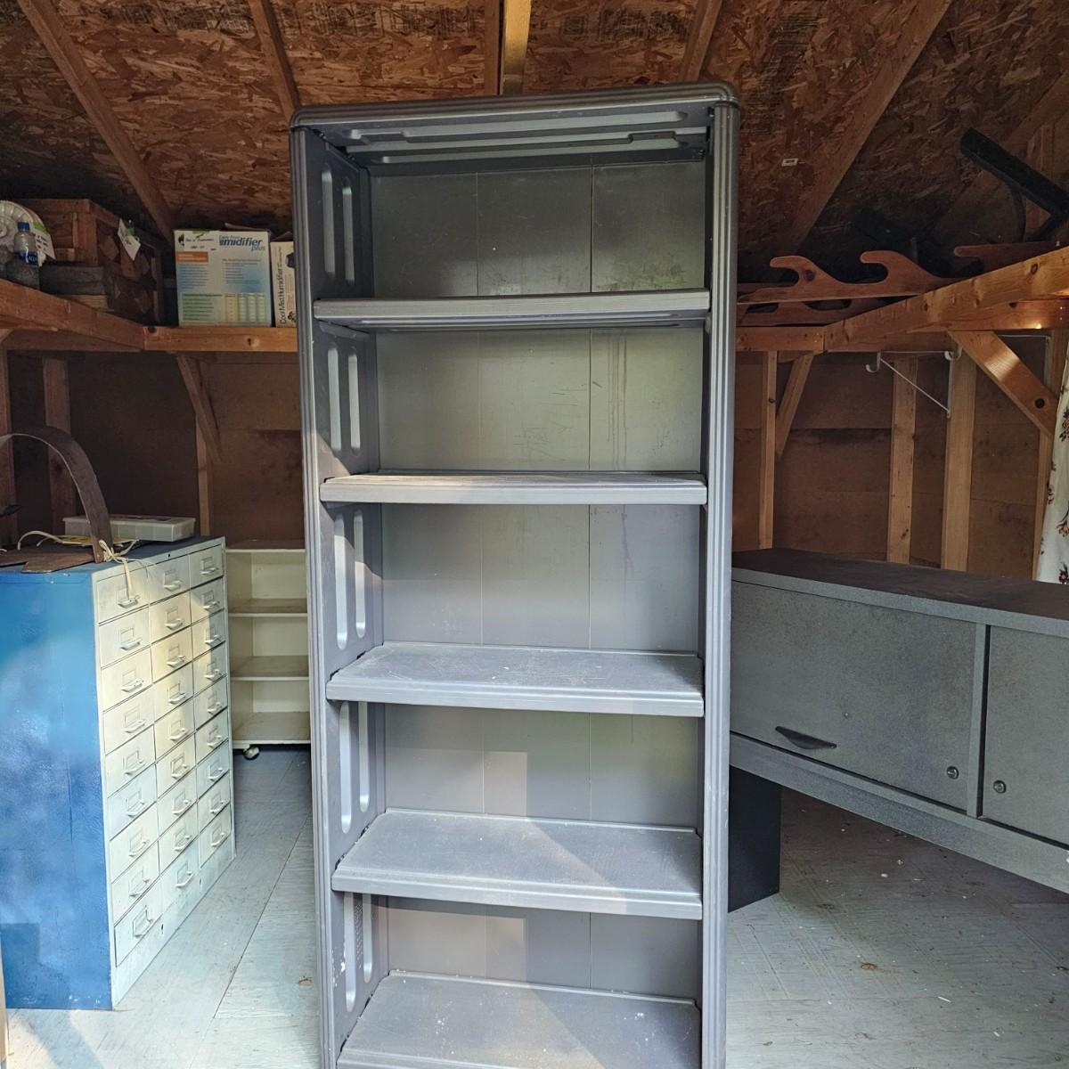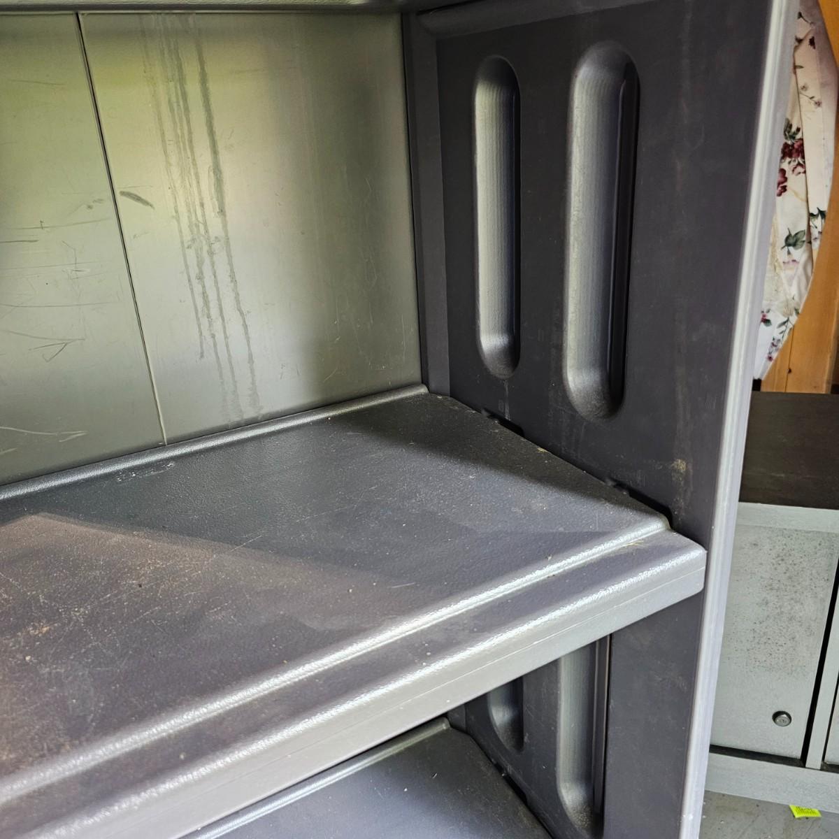 One tall and one wide storage unit. Tall unit is plastic, has five shelves and measures 30" x 12" x 71"H. Wide unit is laminate covered particle board, has two lift and slide back doors on the front. May have been a desk or credenza top. 60" x 15" x 37"H. Both need some tlc and cleaning, see photos for details. Local pickup only. Winning bidder must bring assistance to help move and load this item due to its weight and/or size.