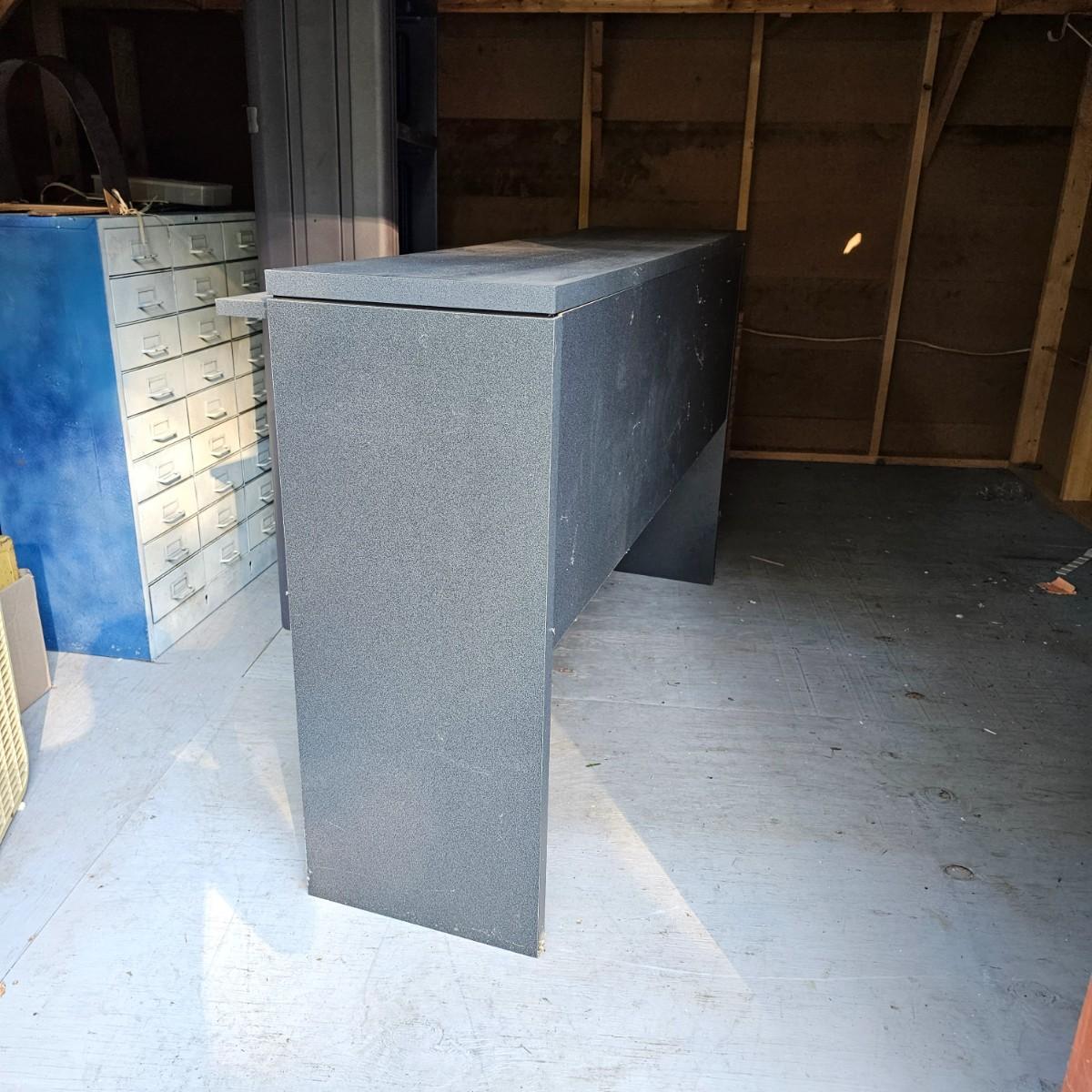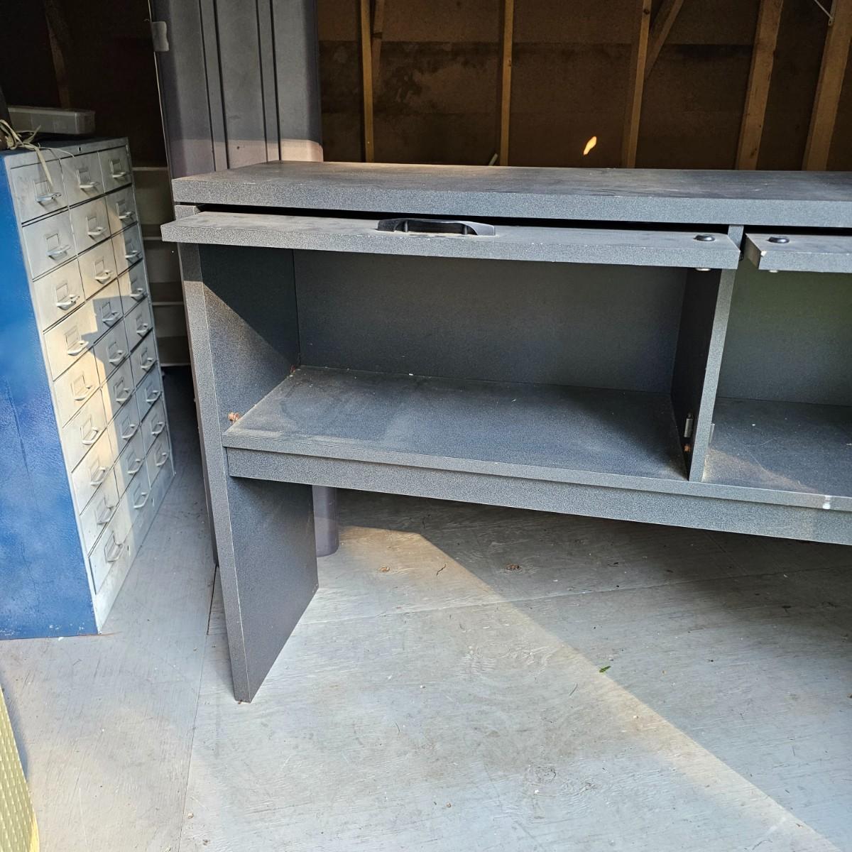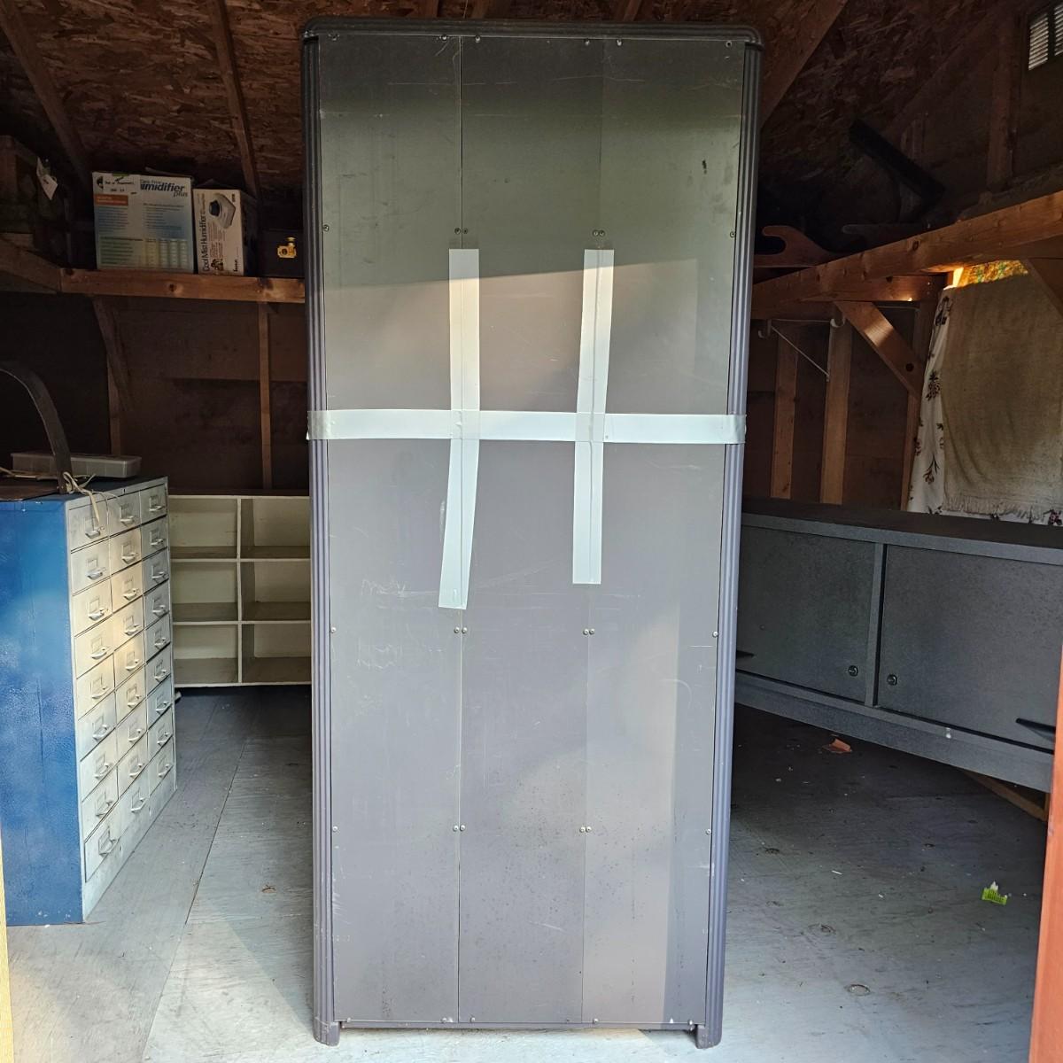One tall and one wide storage unit. Tall unit is plastic, has five shelves and measures 30" x 12" x 71"H. Wide unit is laminate covered particle board, has two lift and slide back doors on the front. May have been a desk or credenza top. 60" x 15" x 37"H. Both need some tlc and cleaning, see photos for details. Local pickup only. Winning bidder must bring assistance to help move and load this item due to its weight and/or size.