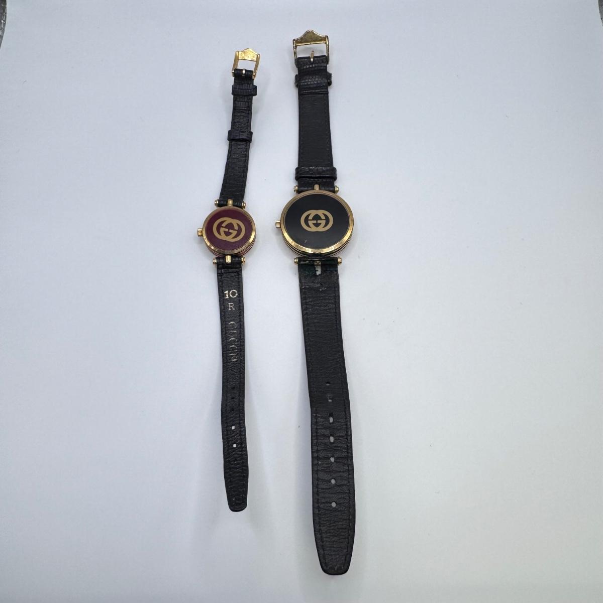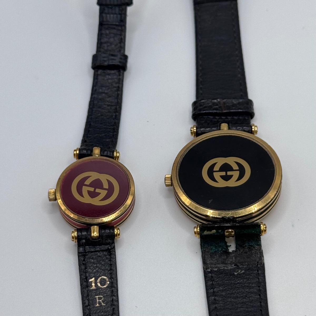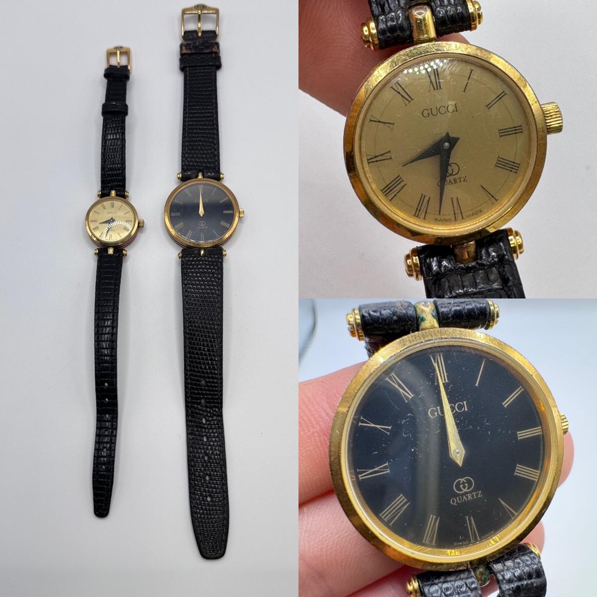 This lot includes two Gucci watches in two sizes. New batteries did not help to get them running. The larger Gucci watch is 9” long. It has a some signs of wear - see pictures included. The smaller watch is 8” long. Shipping available.