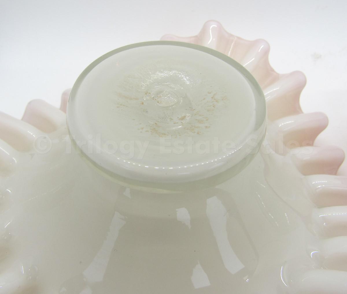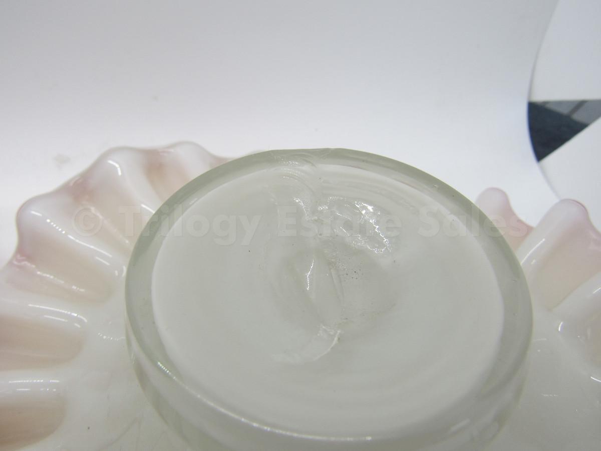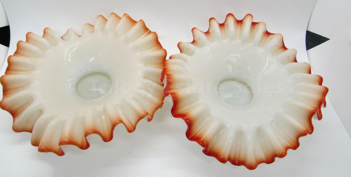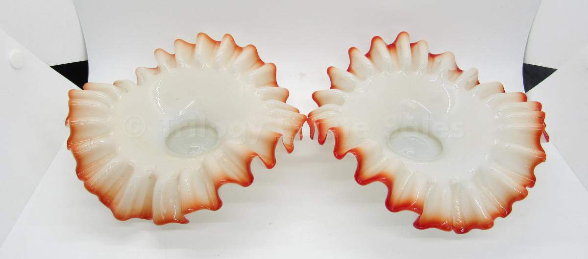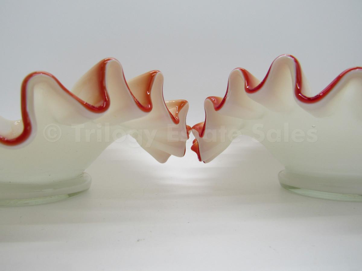 two hand blown glass ruffled edge bowls, white with orange edges. bottom of one has large chip - pontil broke off, taking piece of bottom lip with it.