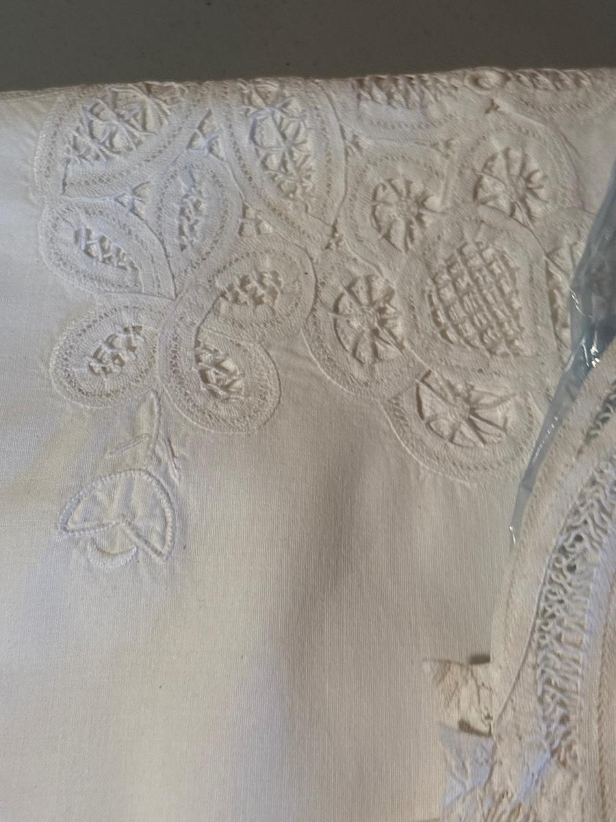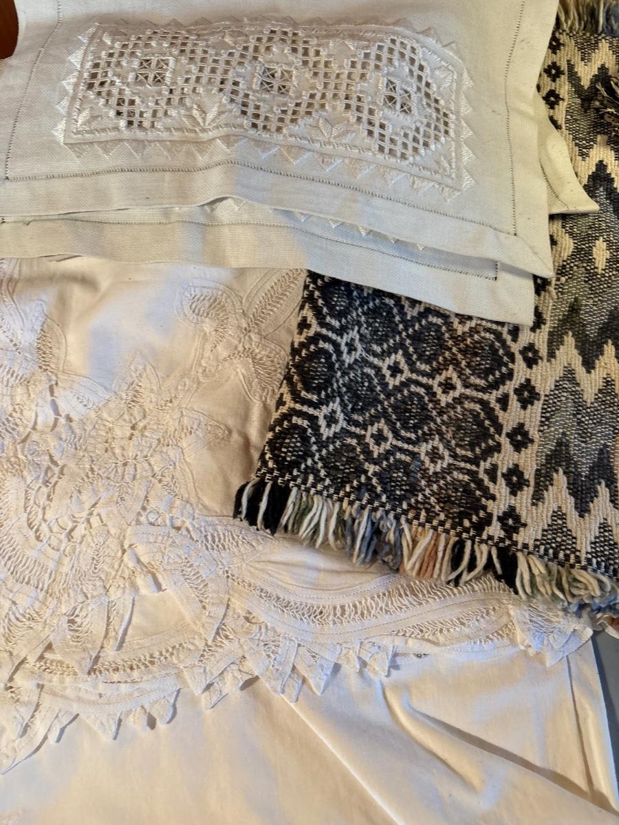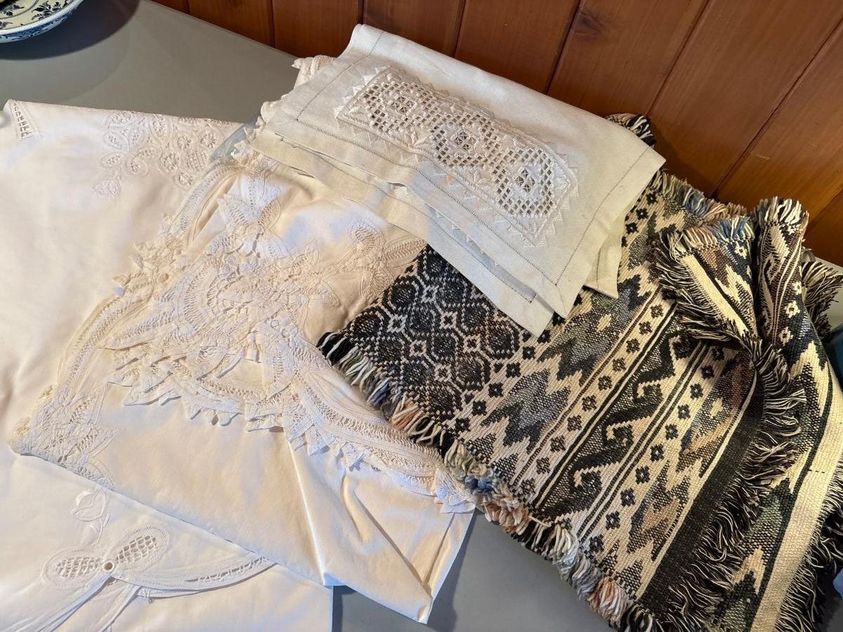 Two hand, stitched tablecloth, hardanger runner, and rug