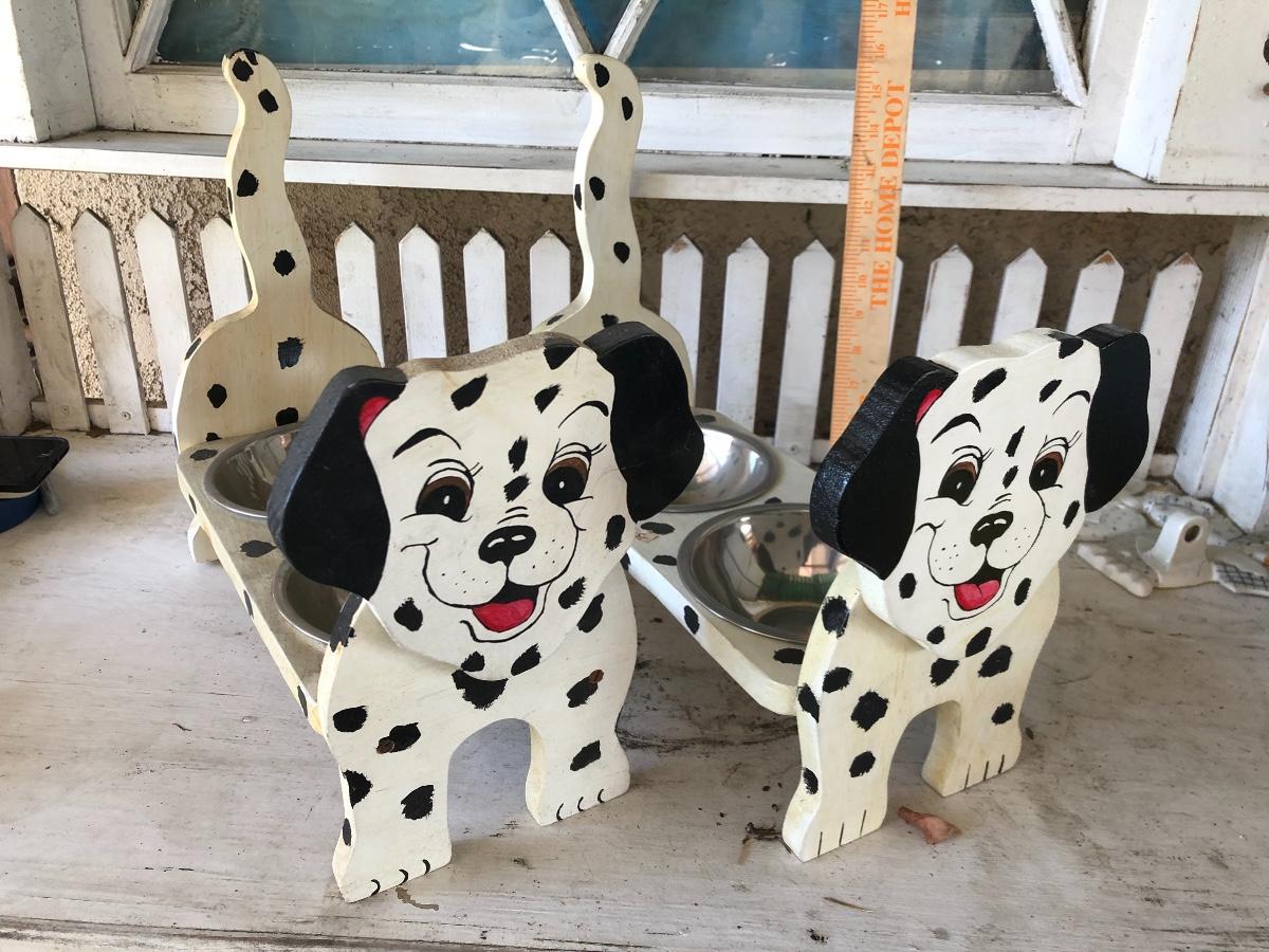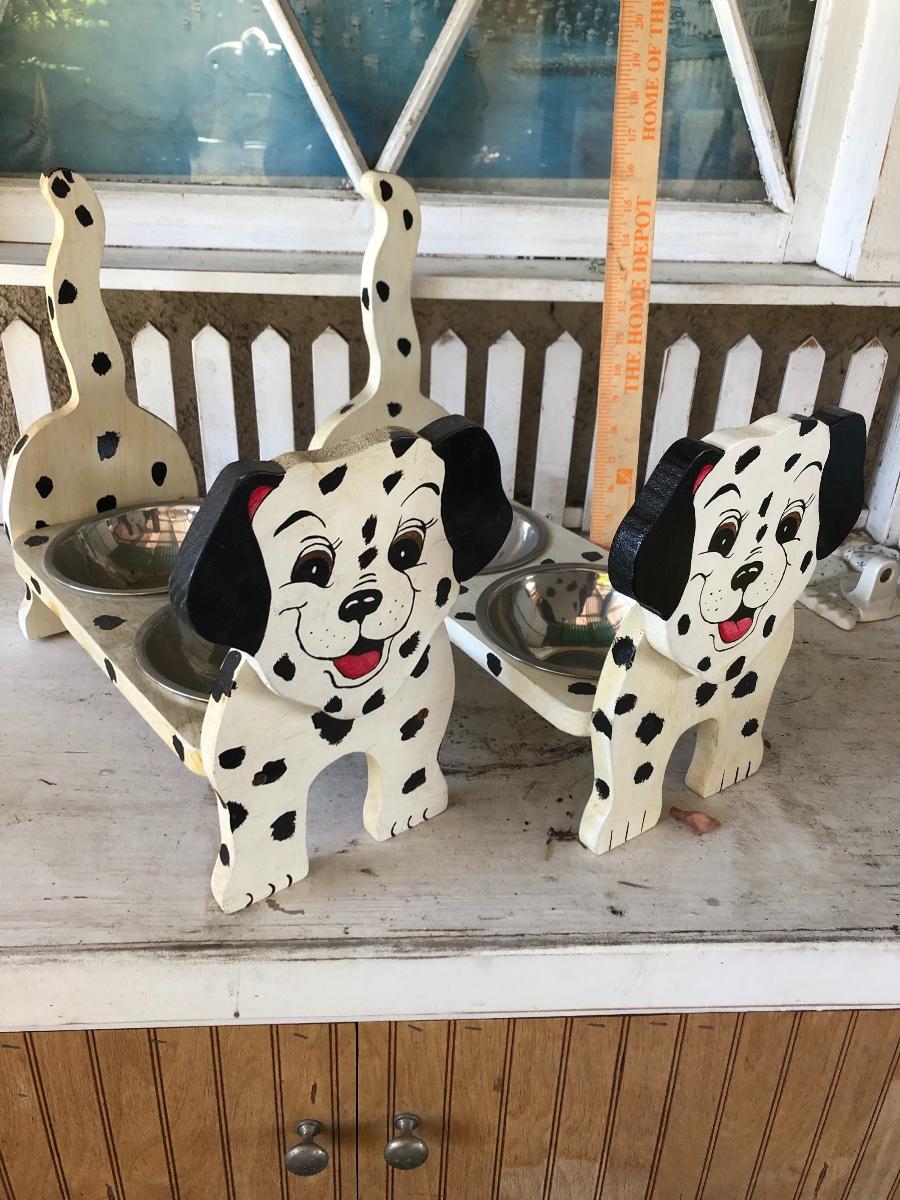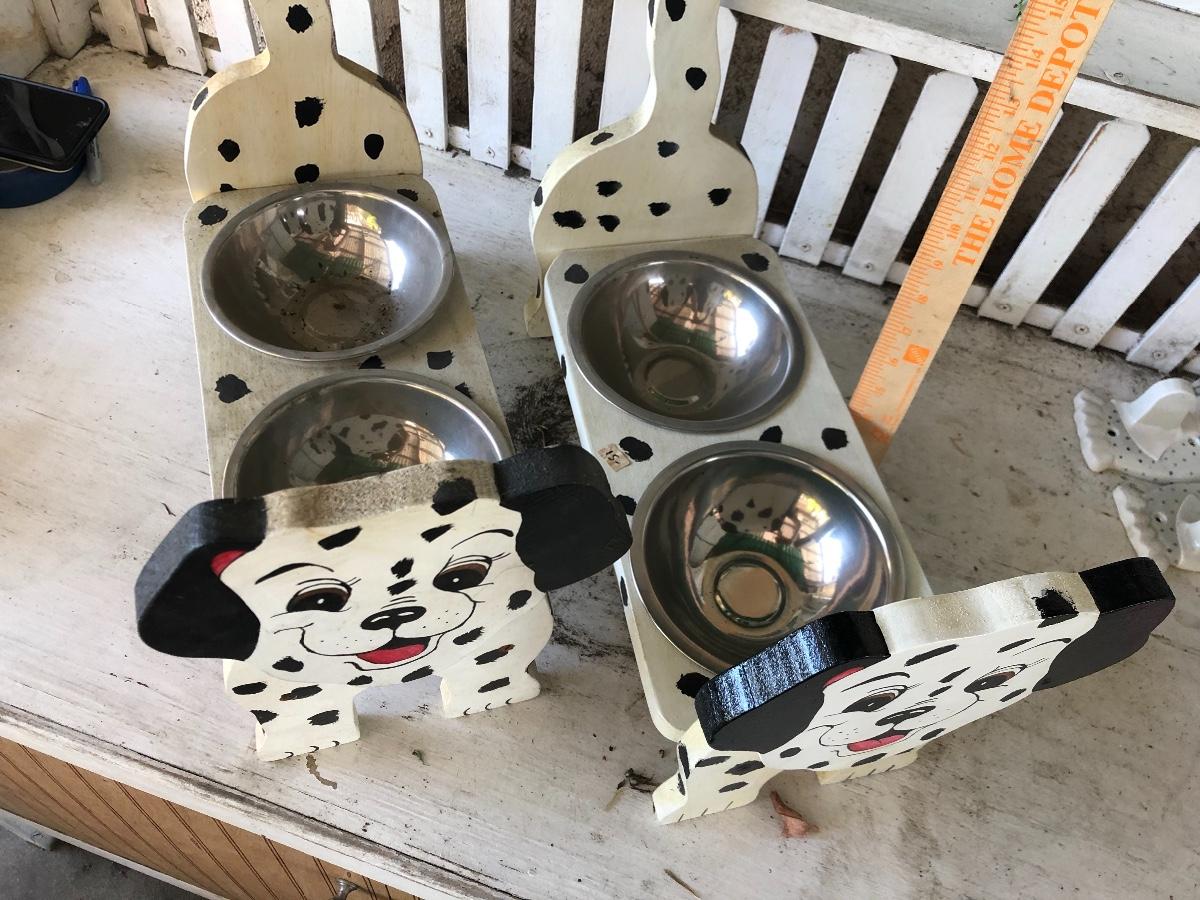 Two handcrafted wood dog bowl feeders, Dalmatian face