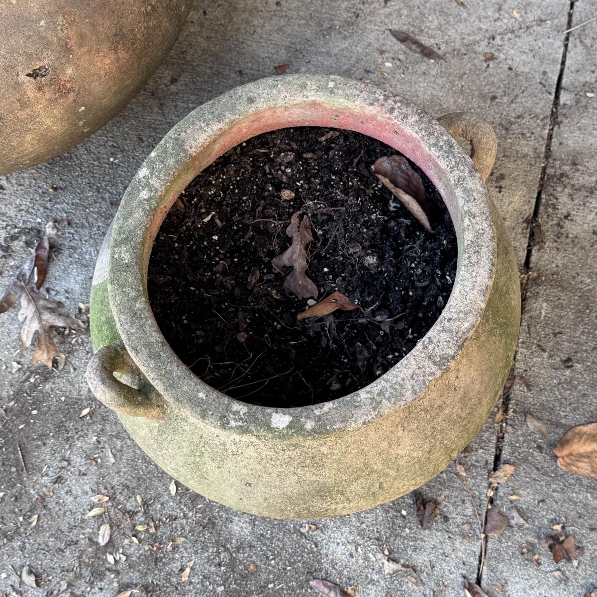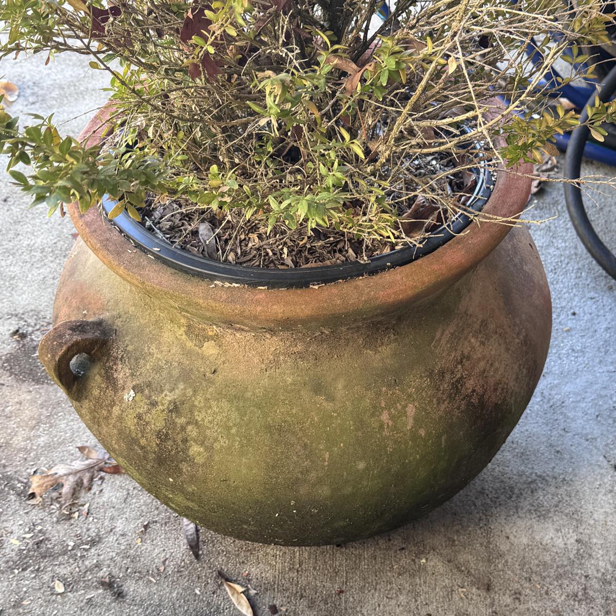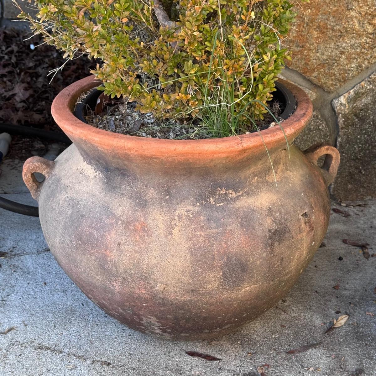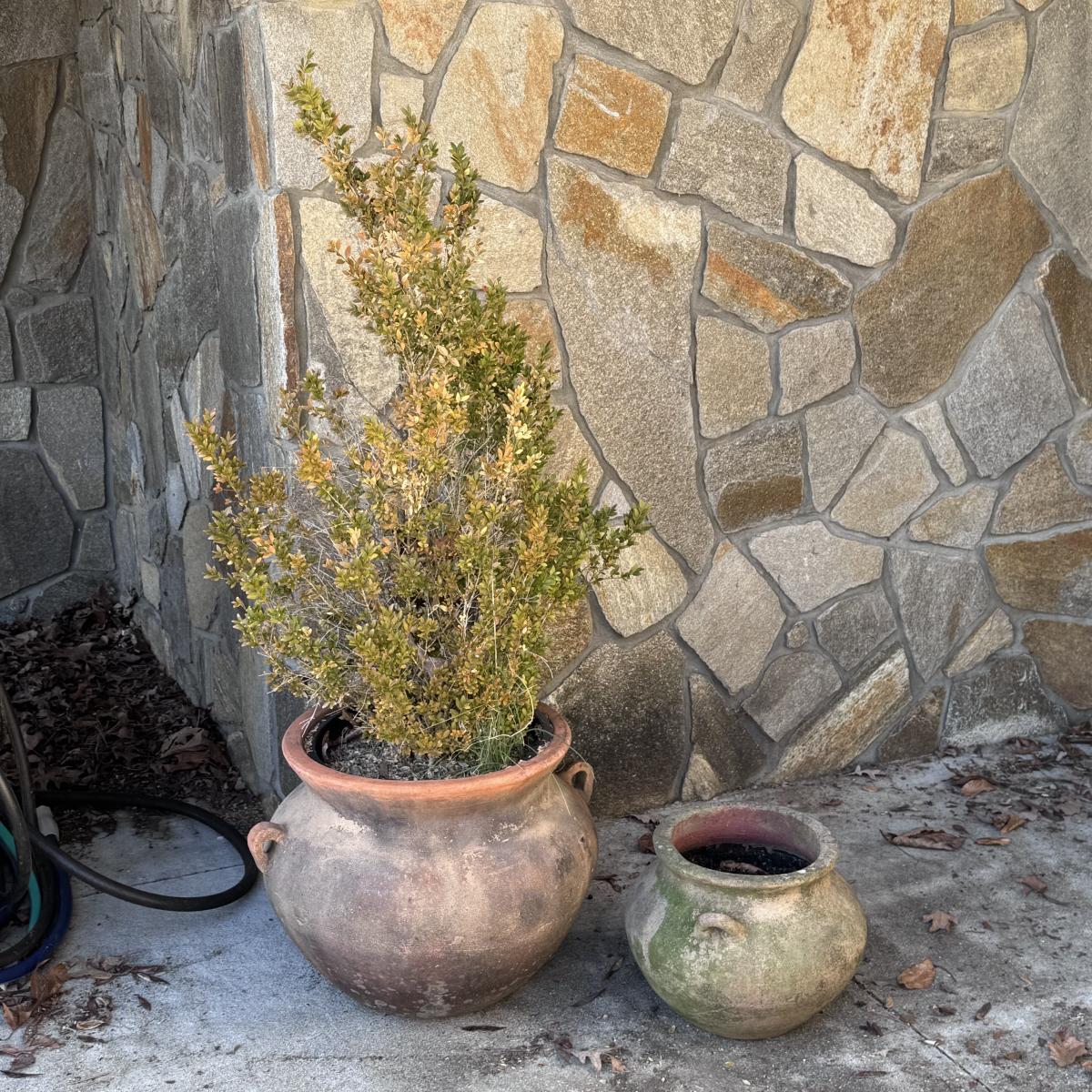 This lot includes, what appears to be, two terracotta planters with handles on both sides. The larger planter comes with a plant that appears to be a mirror bush. He needs some love! Both planters have moss and other stains on the outside - see pictures. The largest one measures 21”D x 17”H. The smaller measures 15”D x 11”H. Local pickup only.