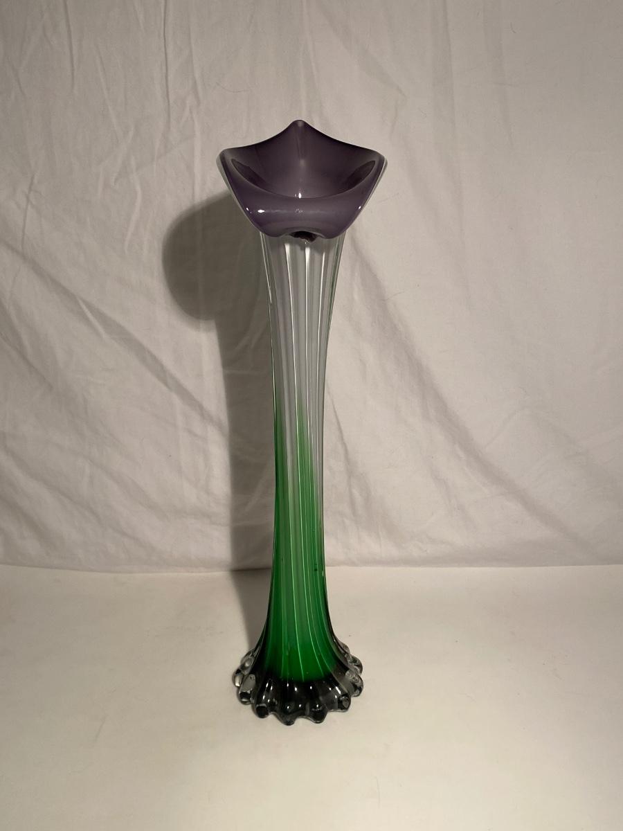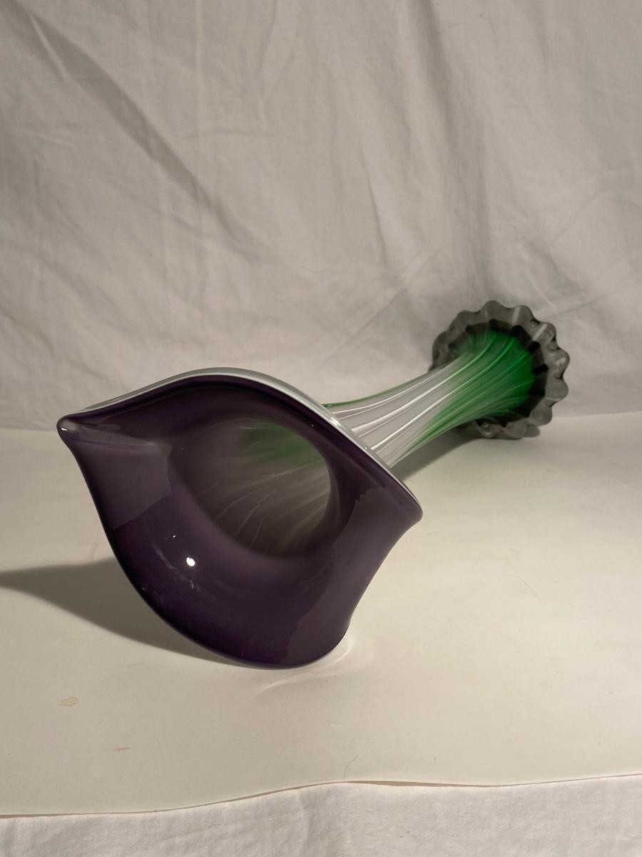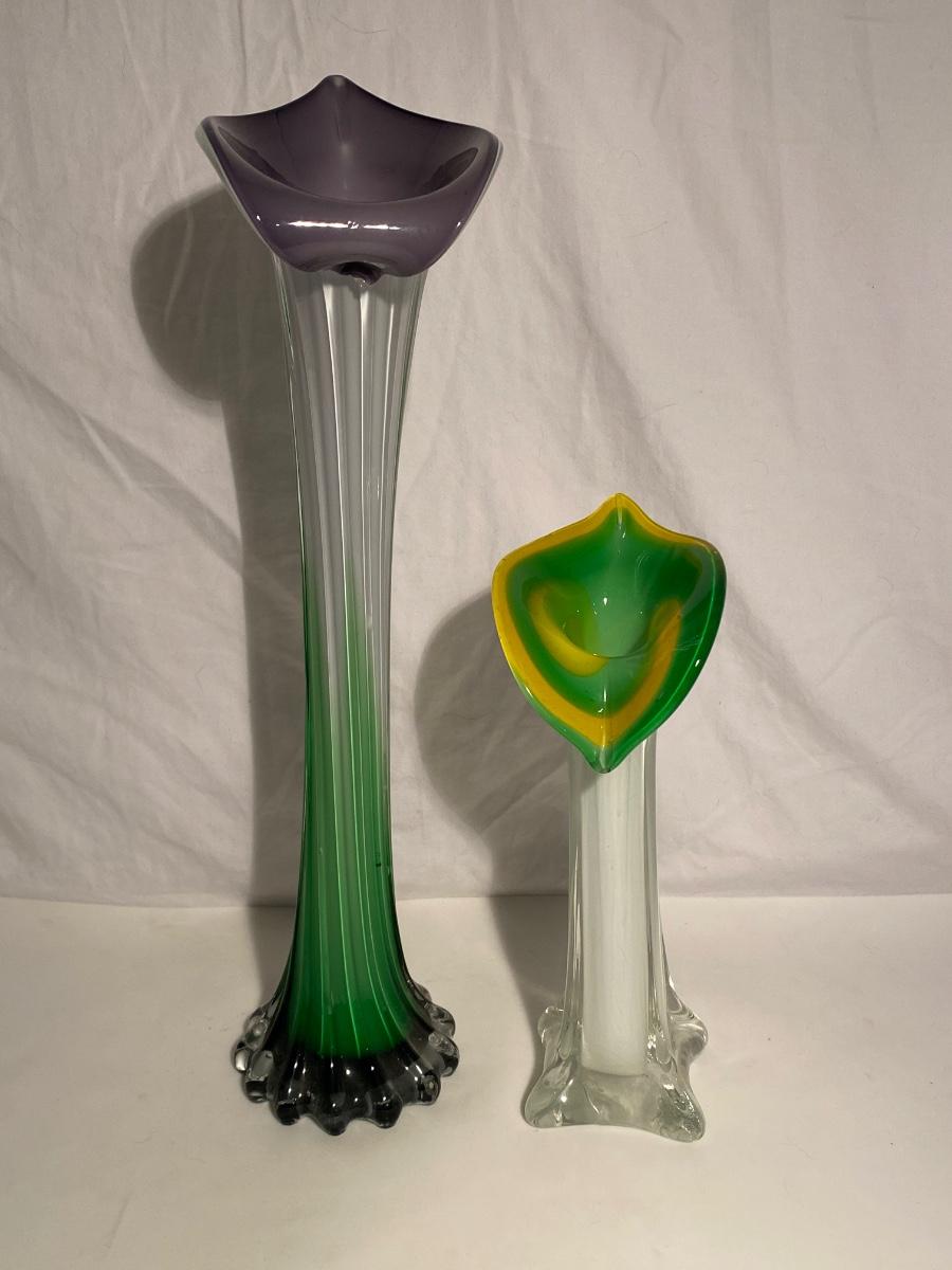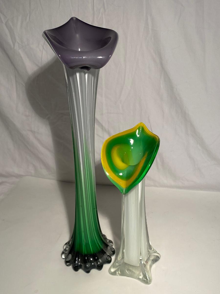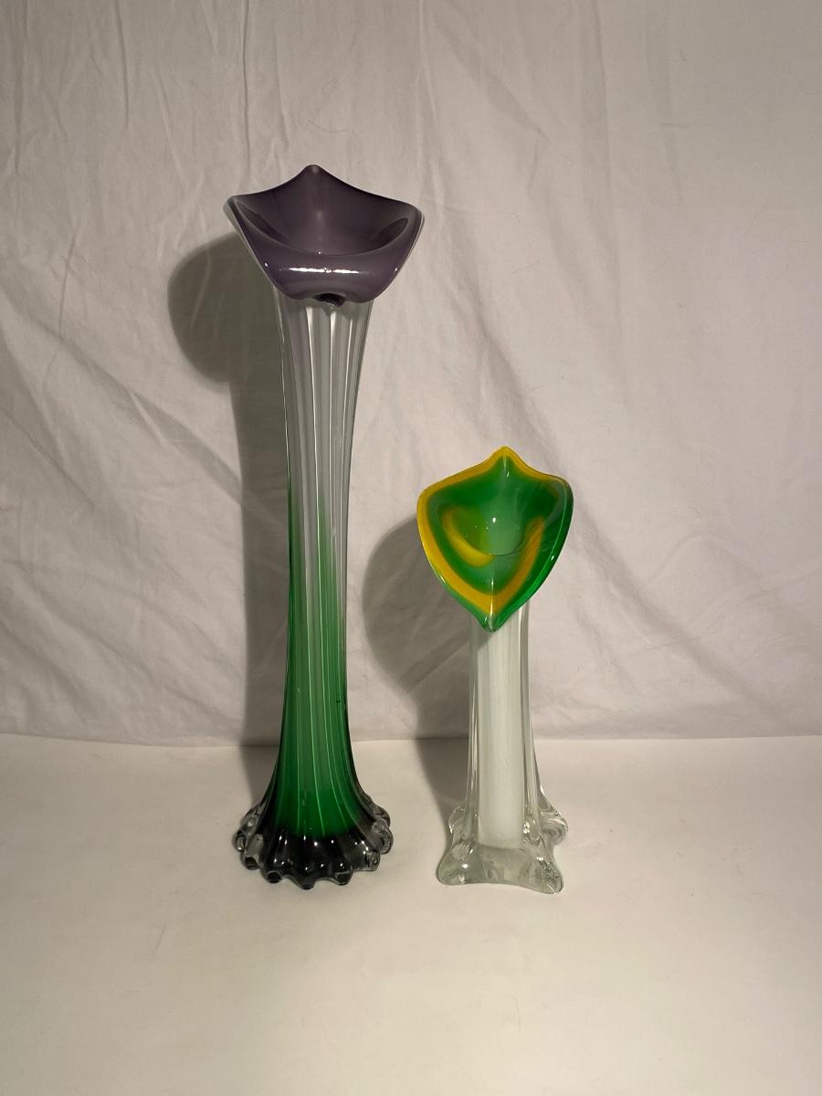 Two hand-made blown glass floral vases. Preowned, like new, and being sold as is