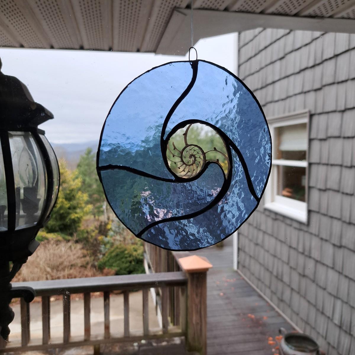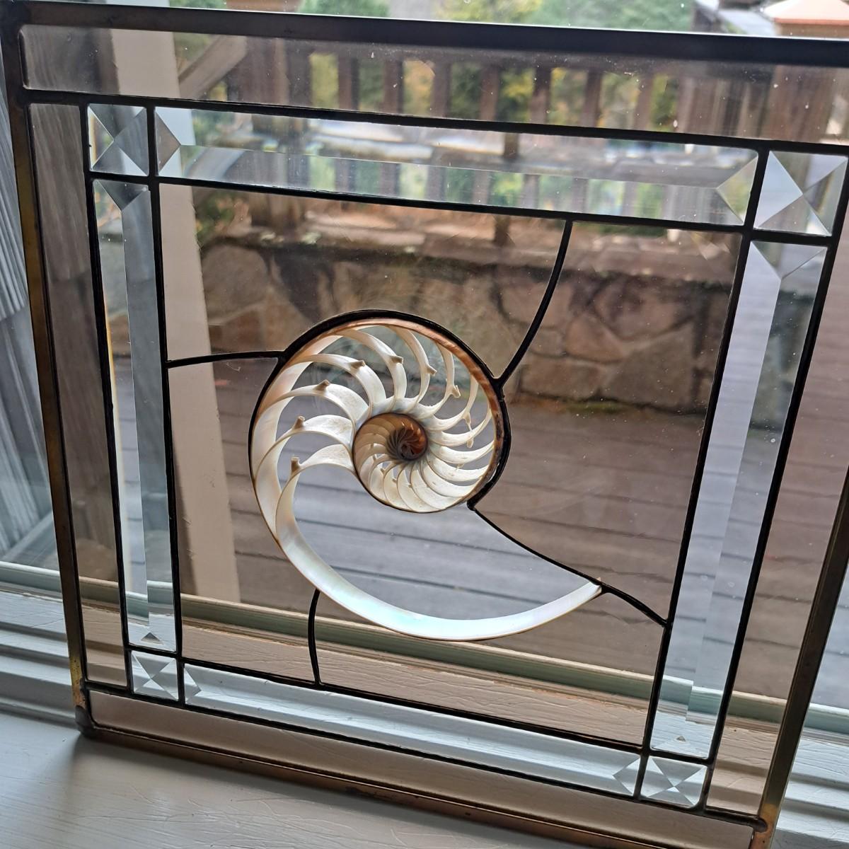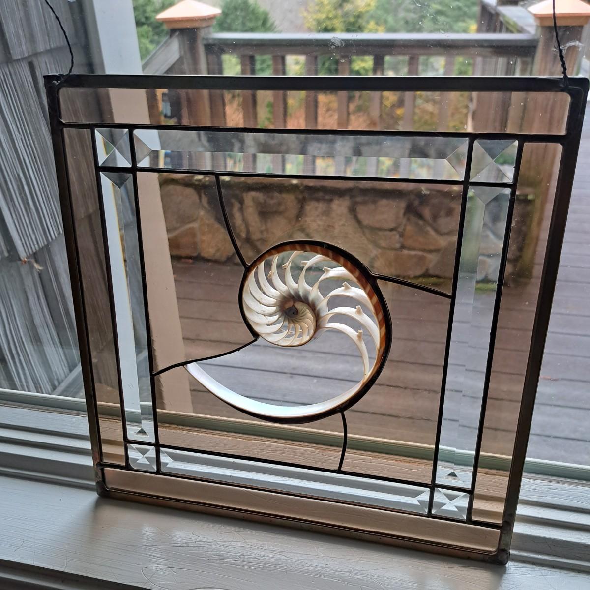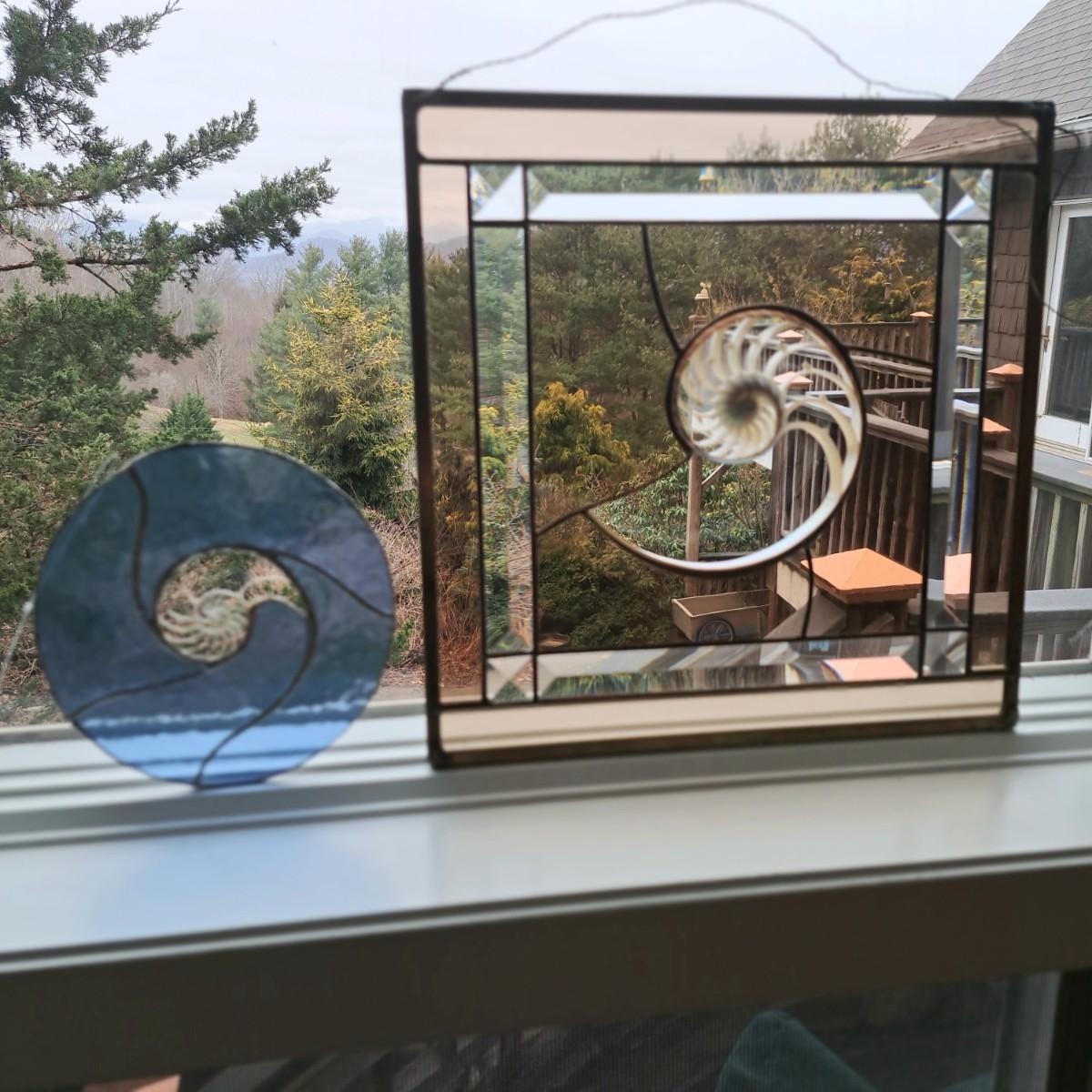 Two lovely, handmade glass suncatchers displaying cross sections of the interiors of a nautilus shell, the first piece 12" x 12.5" in sepia hues with faceted clear glass prisms. The second is a 6.5"D round ocean blue suncatcher with a nautilus center which appears may be missing a few pieces of its inner cartilage backbone. No artists' signatures visible. Both display beautifully hanging in front of a window as shown. Shipping available. Shipping can be costly. We suggest contacting our preferred local shipping provider, Postage Express, with dimensions and getting an estimate before bidding: (828) 255-9250 or shipping@postageexpressnc.com.
