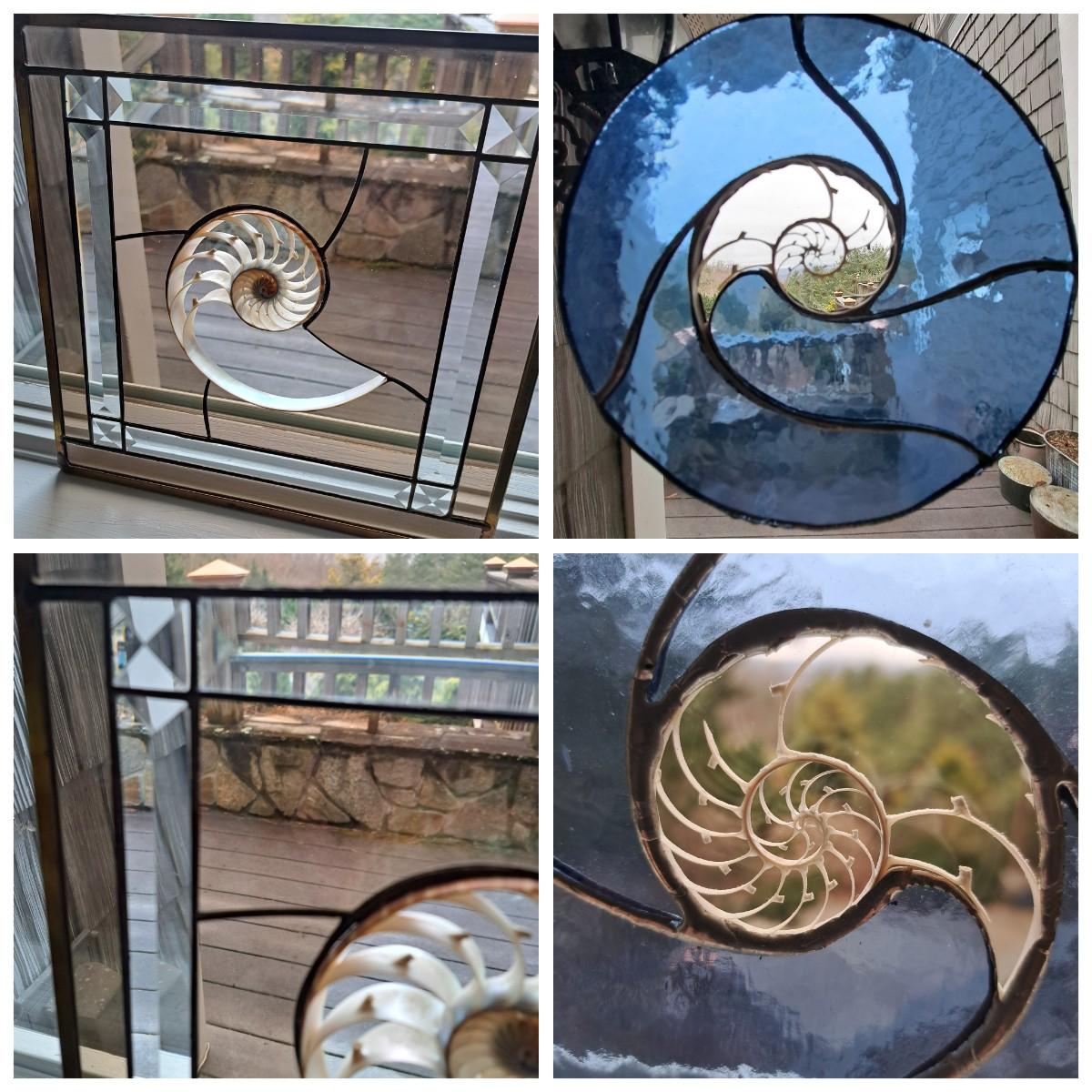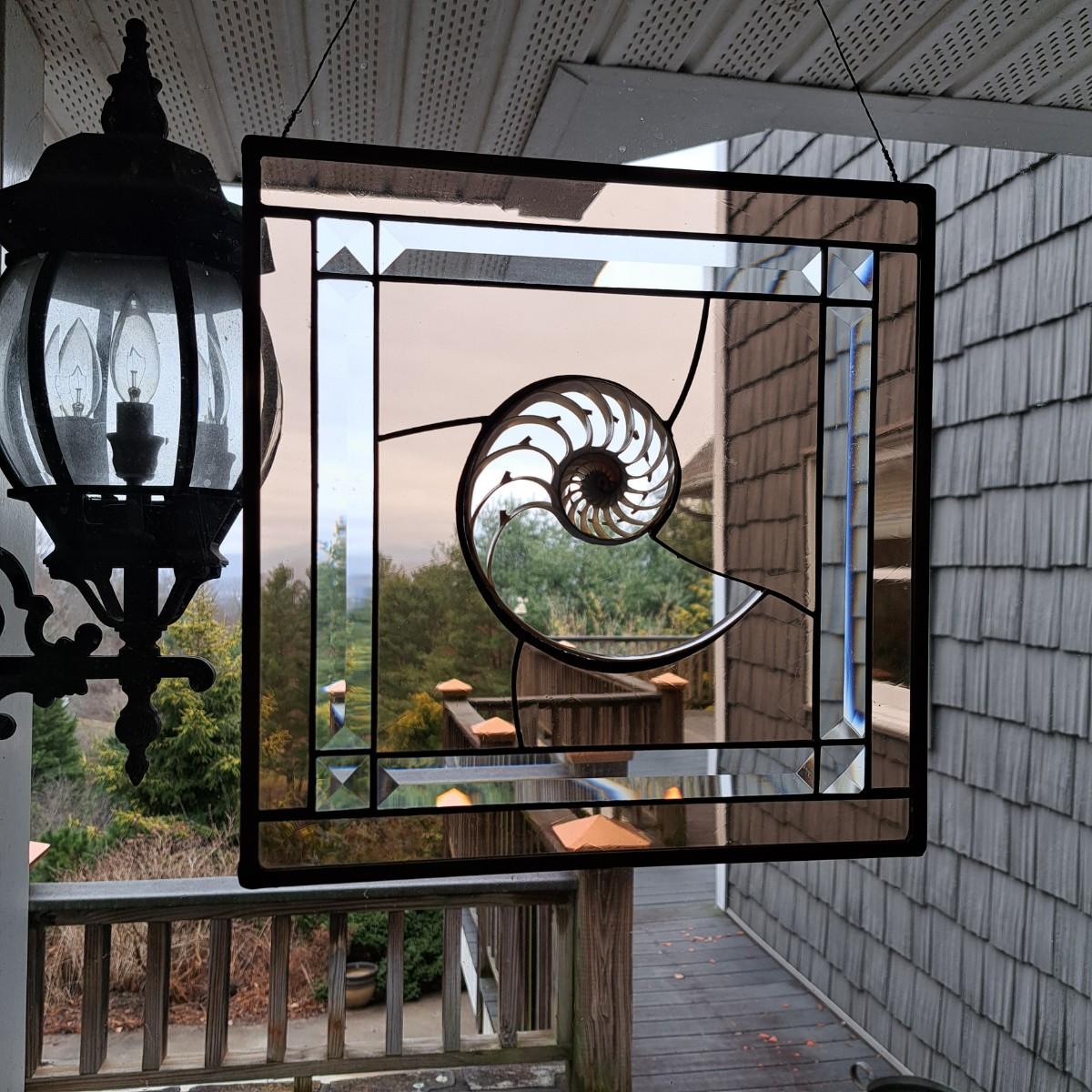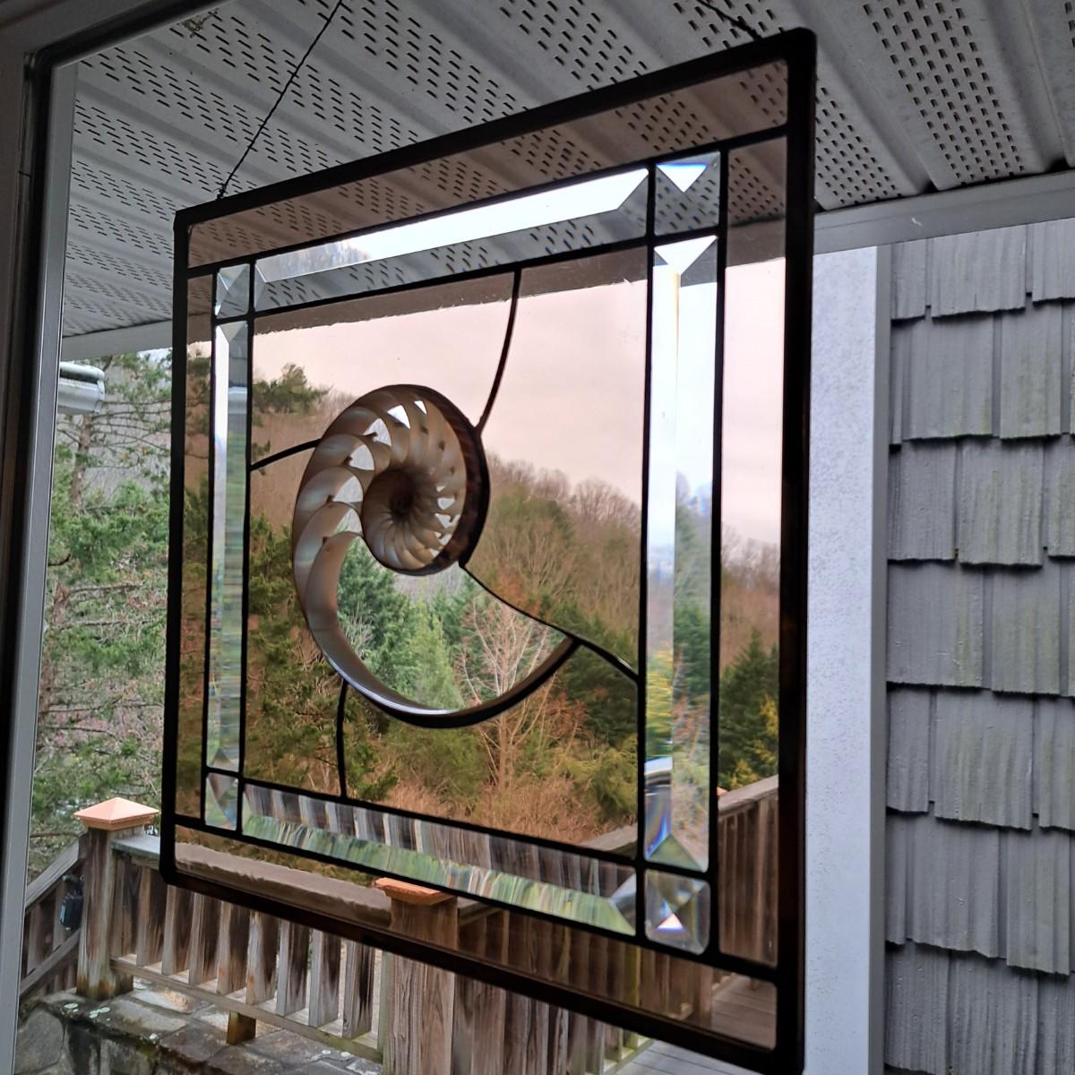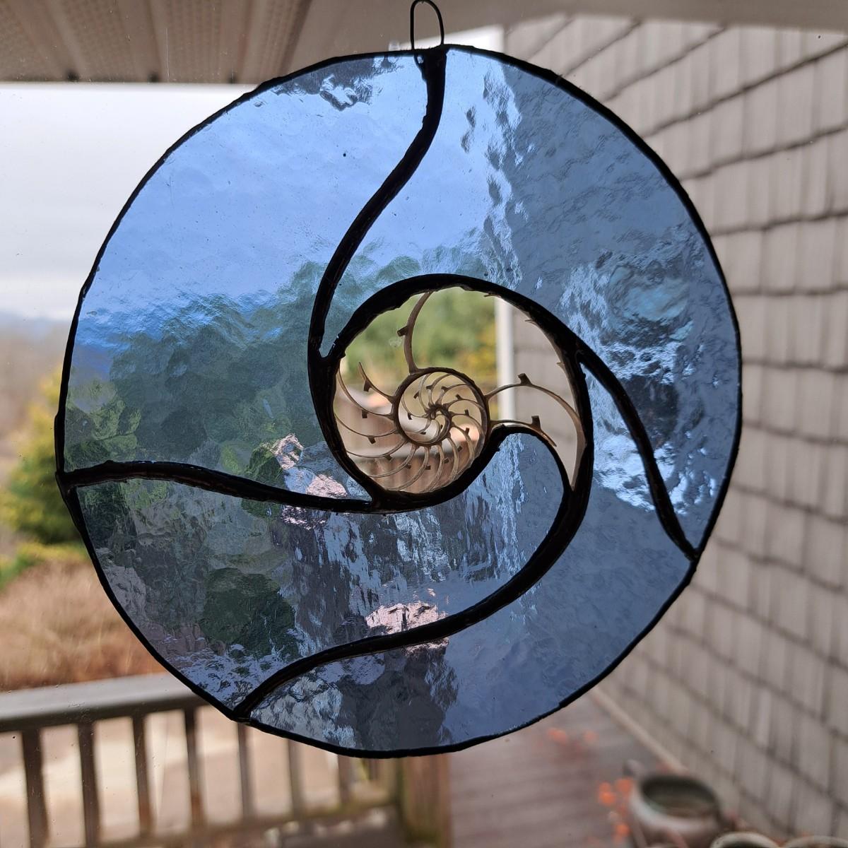 Two lovely, handmade glass suncatchers displaying cross sections of the interiors of a nautilus shell, the first piece 12" x 12.5" in sepia hues with faceted clear glass prisms. The second is a 6.5"D round ocean blue suncatcher with a nautilus center which appears may be missing a few pieces of its inner cartilage backbone. No artists' signatures visible. Both display beautifully hanging in front of a window as shown. Shipping available. Shipping can be costly. We suggest contacting our preferred local shipping provider, Postage Express, with dimensions and getting an estimate before bidding: (828) 255-9250 or shipping@postageexpressnc.com.