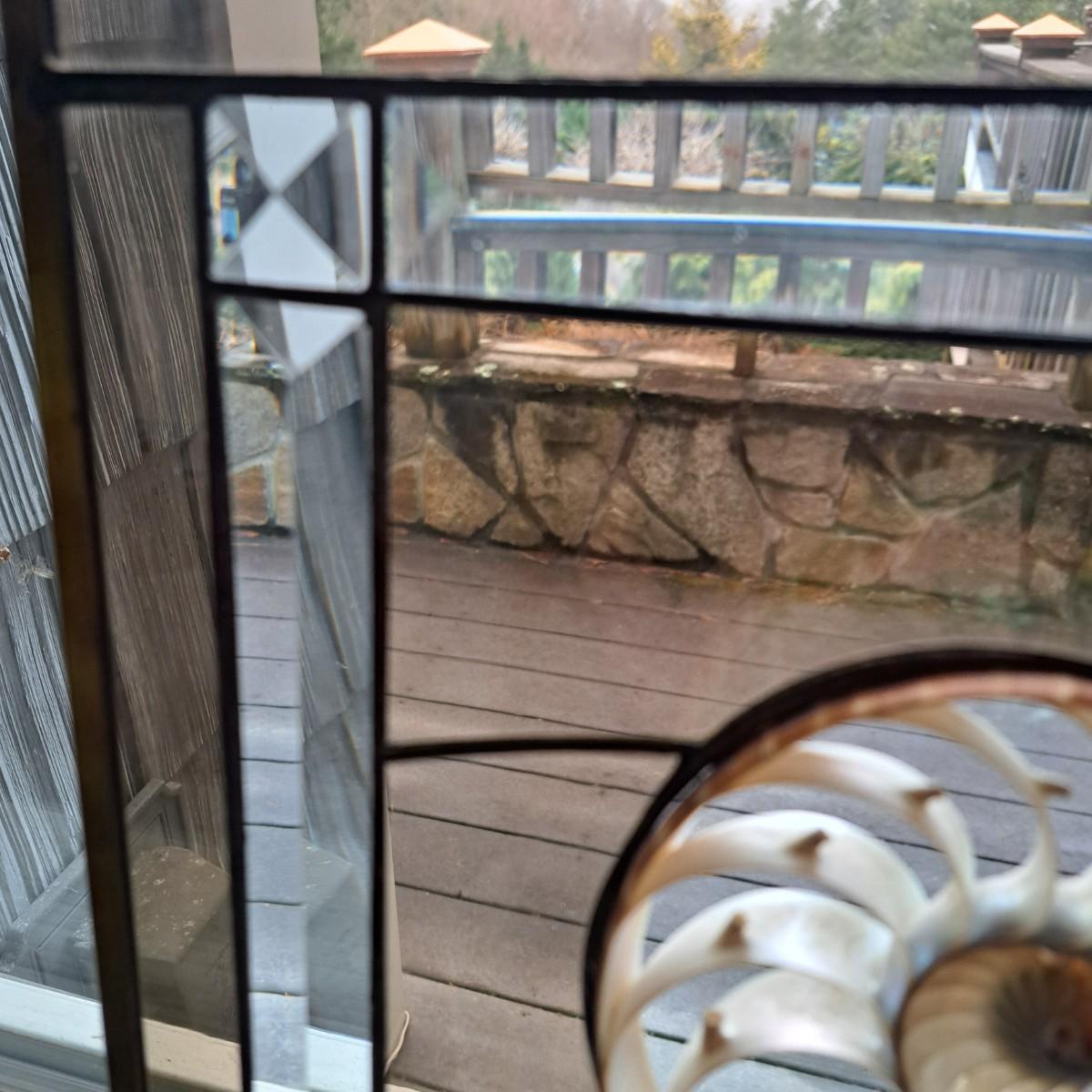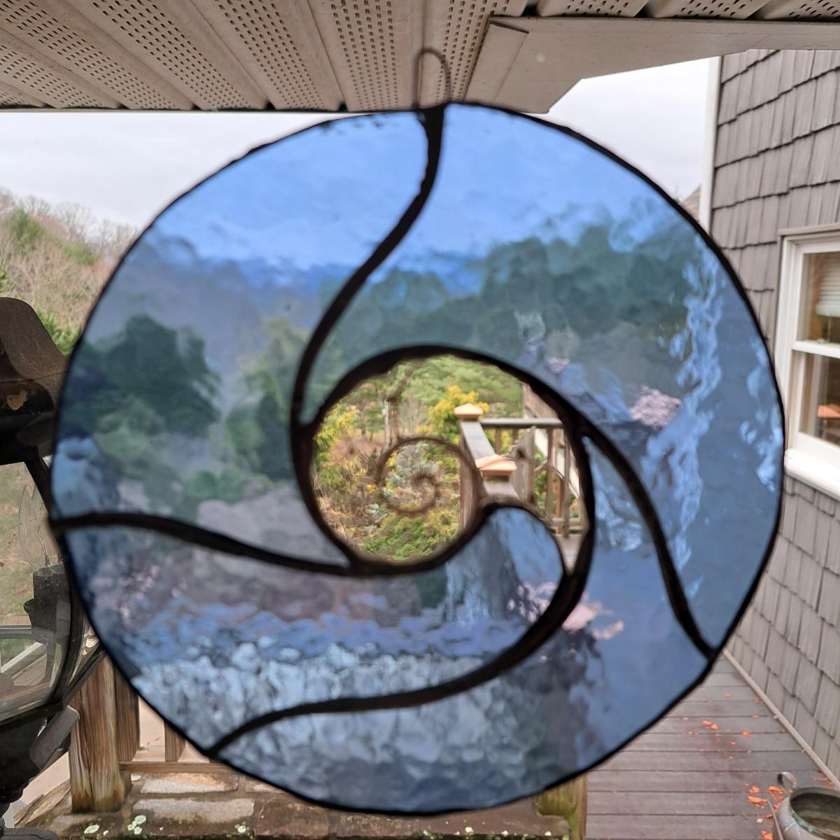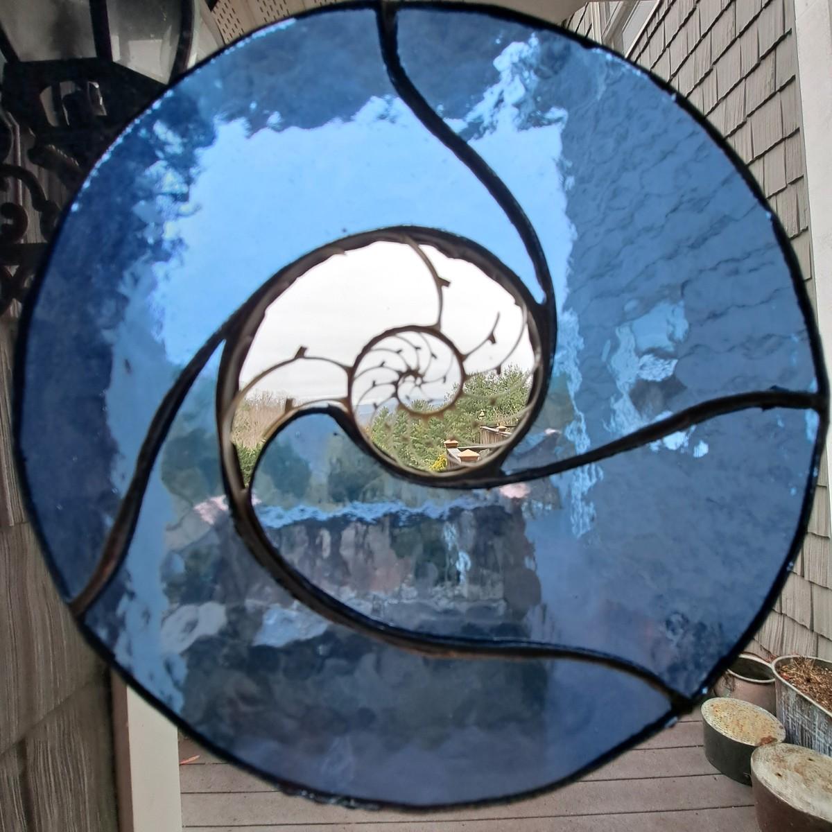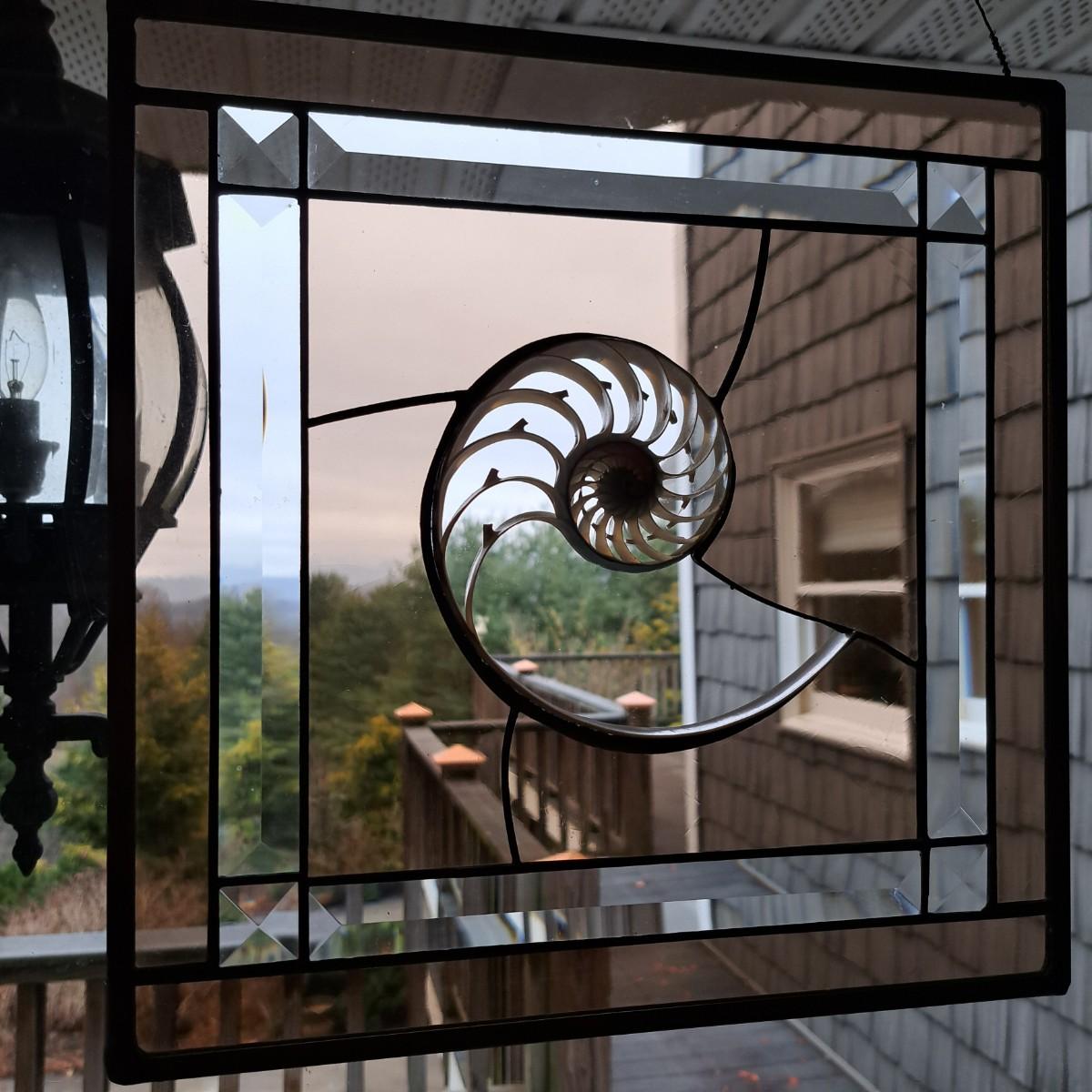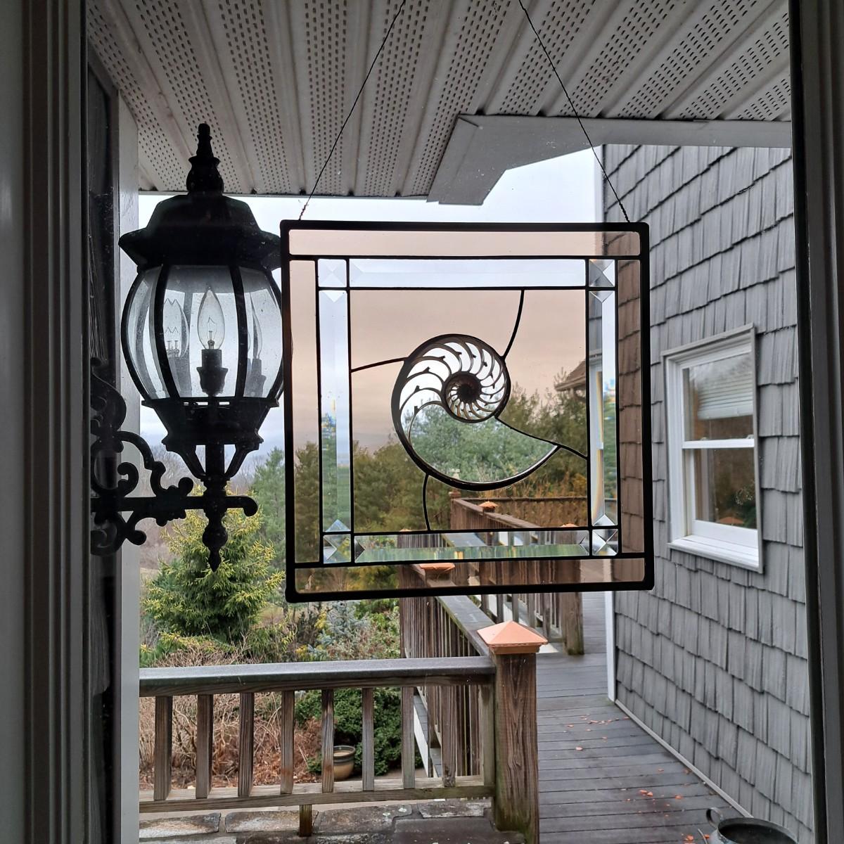 Two lovely, handmade glass suncatchers displaying cross sections of the interiors of a nautilus shell, the first piece 12" x 12.5" in sepia hues with faceted clear glass prisms. The second is a 6.5"D round ocean blue suncatcher with a nautilus center which appears may be missing a few pieces of its inner cartilage backbone. No artists' signatures visible. Both display beautifully hanging in front of a window as shown. Shipping available. Shipping can be costly. We suggest contacting our preferred local shipping provider, Postage Express, with dimensions and getting an estimate before bidding: (828) 255-9250 or shipping@postageexpressnc.com.
