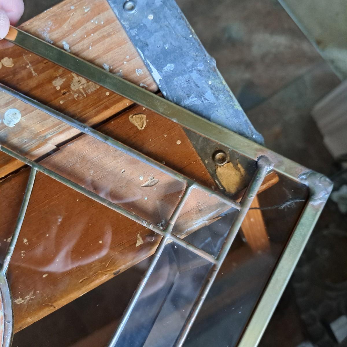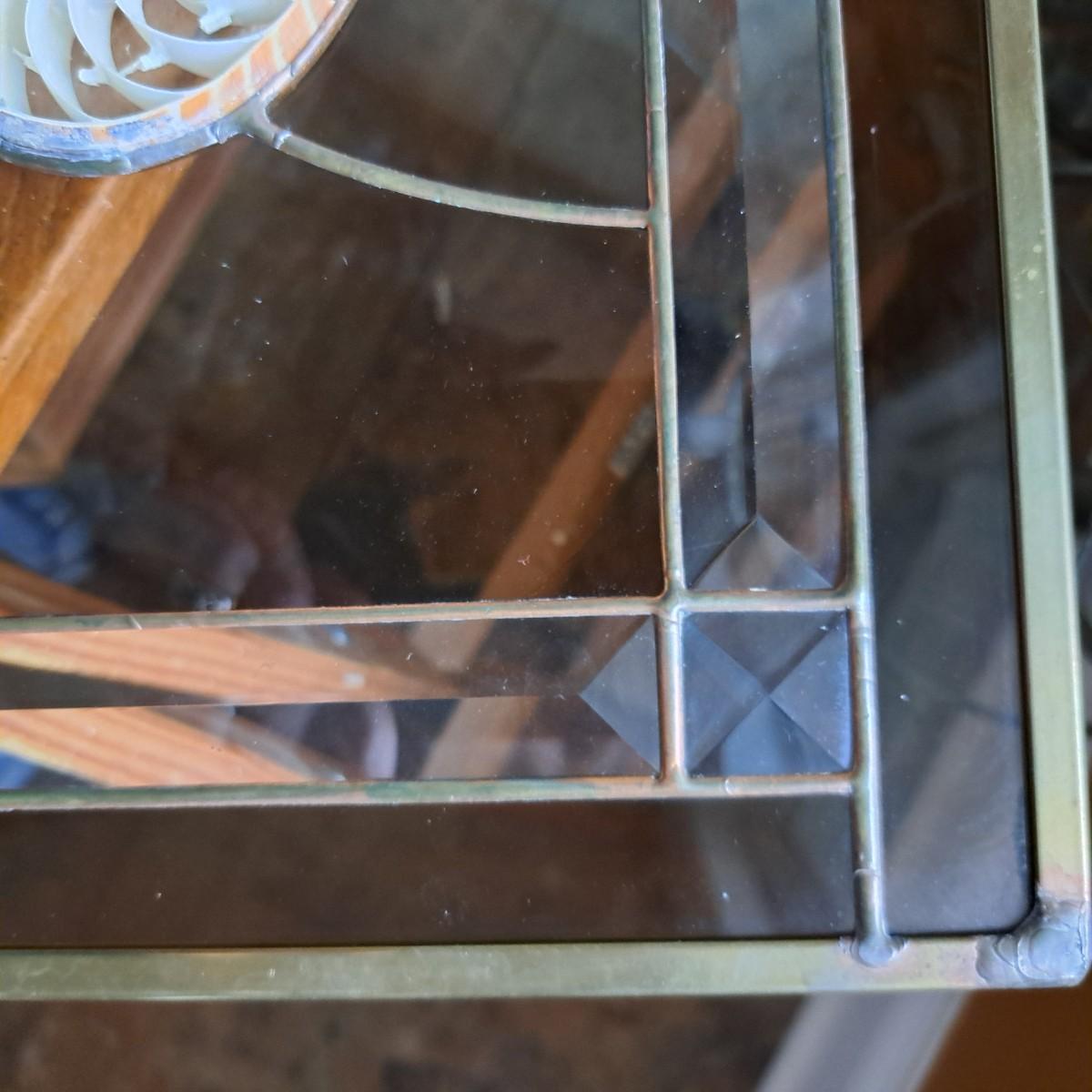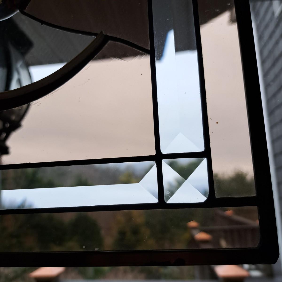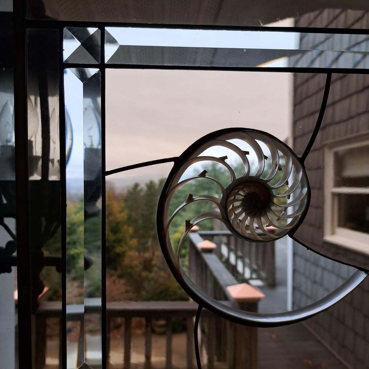 Two lovely, handmade glass suncatchers displaying cross sections of the interiors of a nautilus shell, the first piece 12" x 12.5" in sepia hues with faceted clear glass prisms. The second is a 6.5"D round ocean blue suncatcher with a nautilus center which appears may be missing a few pieces of its inner cartilage backbone. No artists' signatures visible. Both display beautifully hanging in front of a window as shown. Shipping available. Shipping can be costly. We suggest contacting our preferred local shipping provider, Postage Express, with dimensions and getting an estimate before bidding: (828) 255-9250 or shipping@postageexpressnc.com.